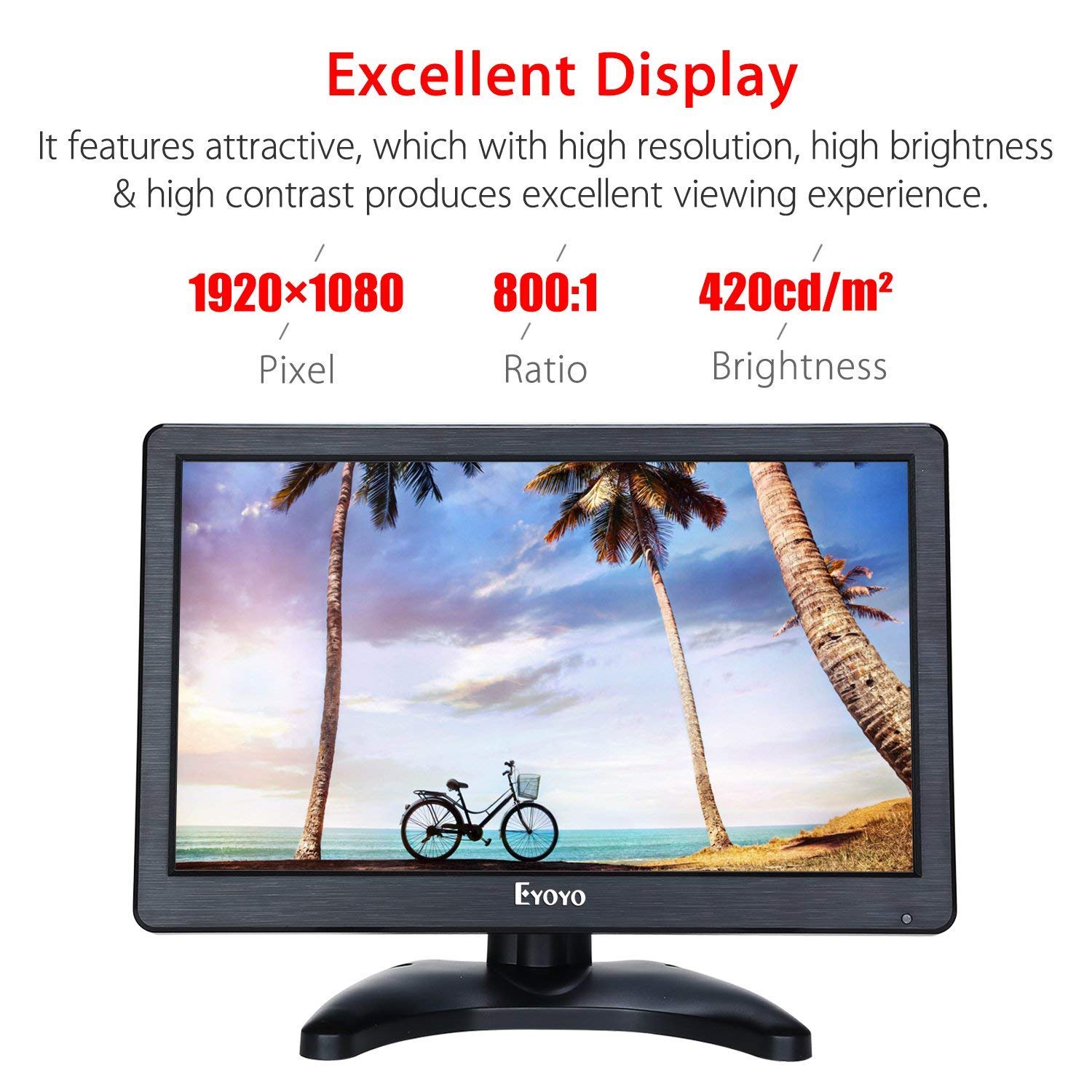 | The Eyoyo 11.6” HD LCD IPS monitor, with HDMI/VGA/BNC/USB interface, is optimized for the finest 1920*1080 pixel image and color quality. IPS viewing technology is for an ultra-wide viewing, from almost any angle. This approach extends to the sturdy stand and slim profile without compromising style in ensuring stability and durability. |
