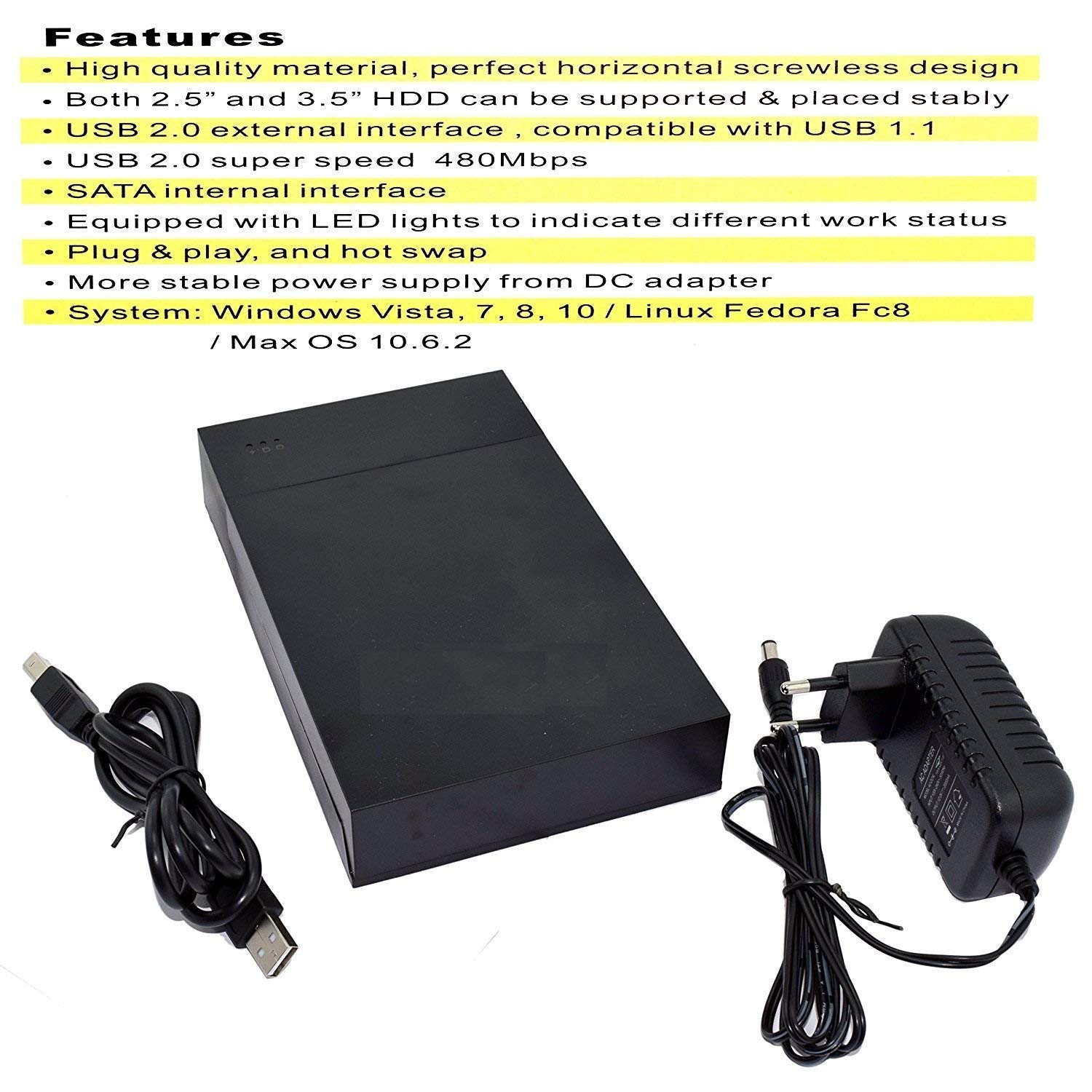 Supports 2.5" and 3.5" sata hard disks, large storage support - 2tb for 2.5" HDd, 6tb for 3.5" HDd, high speed USB 2.0 up to 480mbit/sec, horizontal screw less design, high quality abs plastic material
