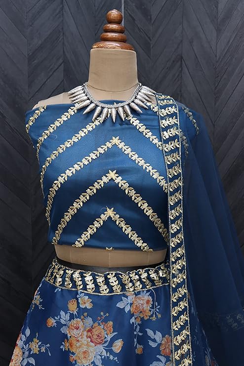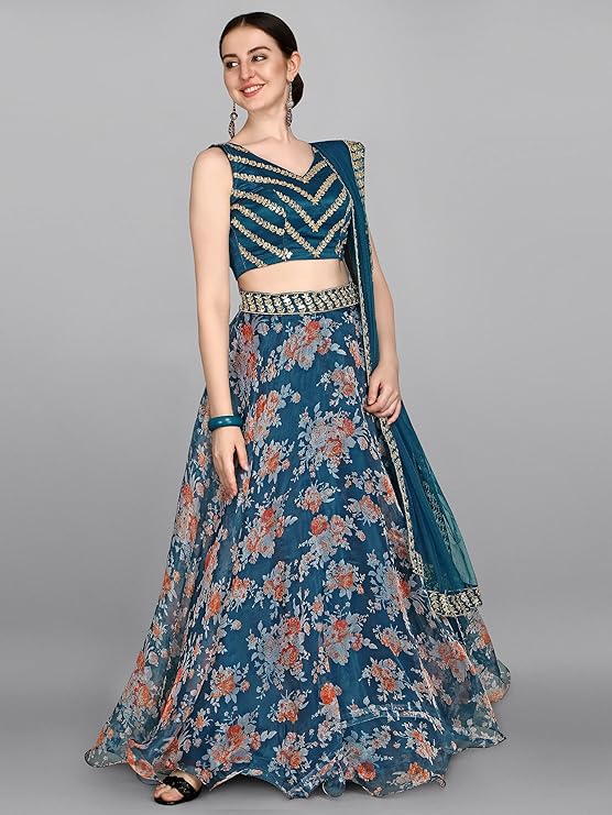 Fashion Basket Women's Organza Printed & Jari Sequence Work Semi-Stitched Lehenga Choli
