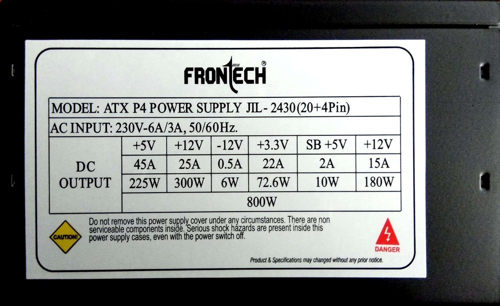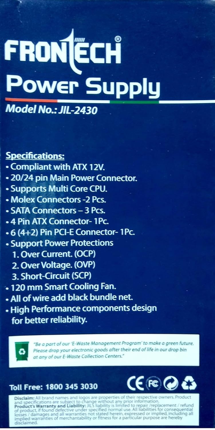 Frontech JIL-2430 delivers a 800 Watts (Max) of power. Low noise, high efficiency. Sophisticated Design: The black powder-coated enclosure and the black-sleeved cables give any system a polished look. You're building a PC with the JIL-2430 model smps you can avoid that look of unpainted steel that you'll find on so many entry-level power supplies. Reliability you can count on: JIL-2430 800 watt SMPS is backed with a 3 years warranty. Specifications: ; Compliant with ATX 12V. ; 20/24 pin Main Power Connector. ; Supports Multi-Core CPU. ; Molex Connectors -2 Pcs. ; SATA Connectors - 3 Pcs. ; 4 Pin ATX Connector- 1Pc. ; 6 (4+2) Pin PCI-E Connector- 1Pc. ; Support Power Protections ;. Over Current. (OCP) ;. Over Voltage. (OVP) ;. Short-Circuit (SCP) ; 120 mm Smart Cooling Fan. ; All of the wire add black bundle net. ; High-Performance components design for better reliability. |
