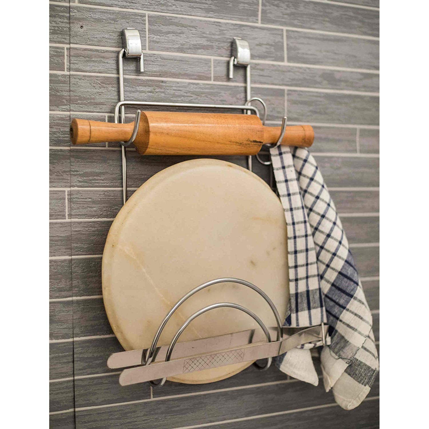 Gadgets Appliances Plated Mild Steel Chakla Belan Stand with Hooks, Silver