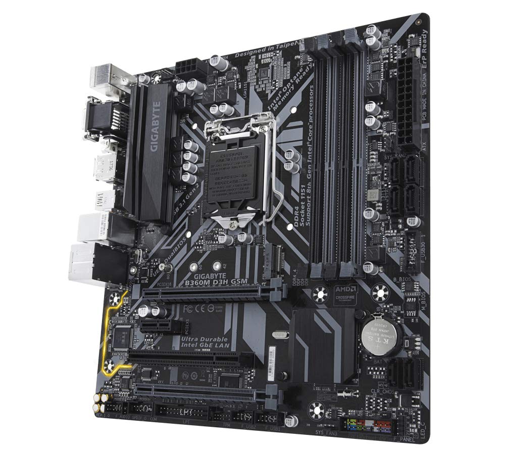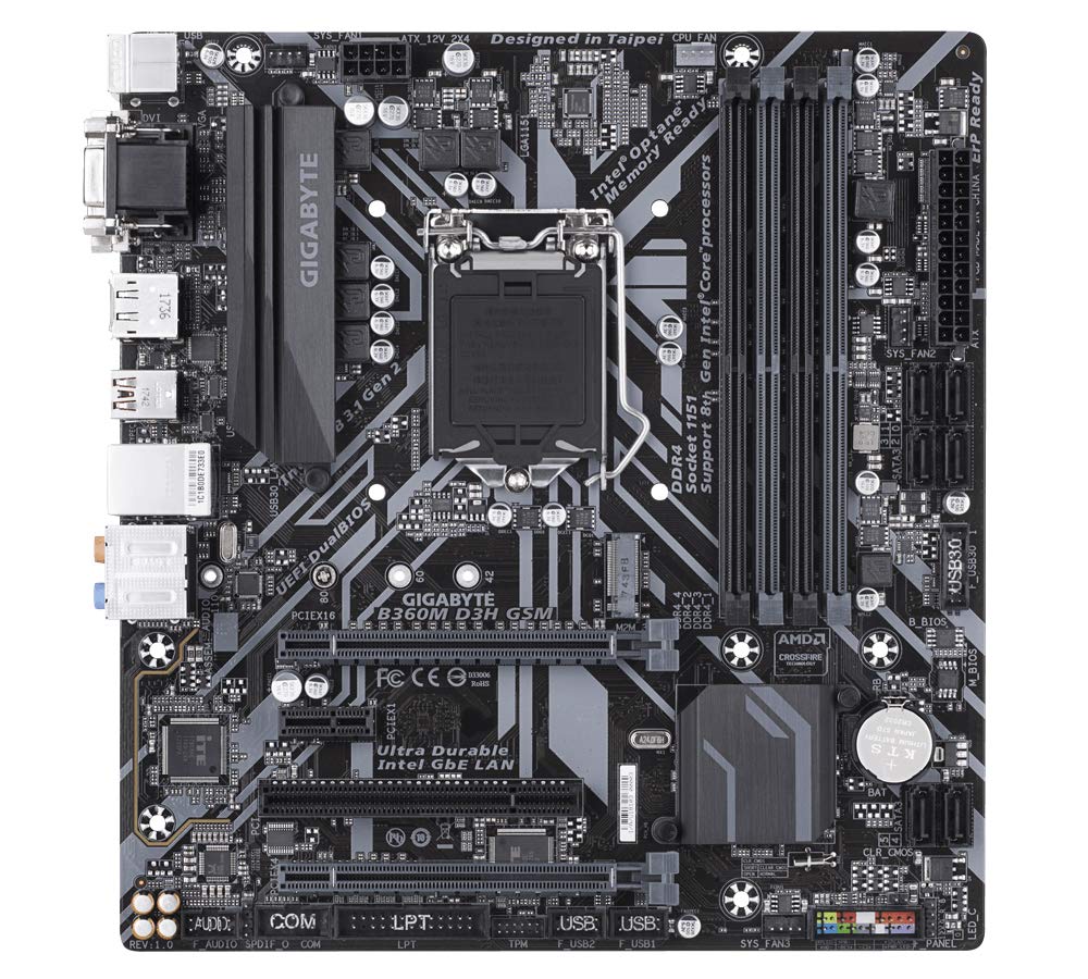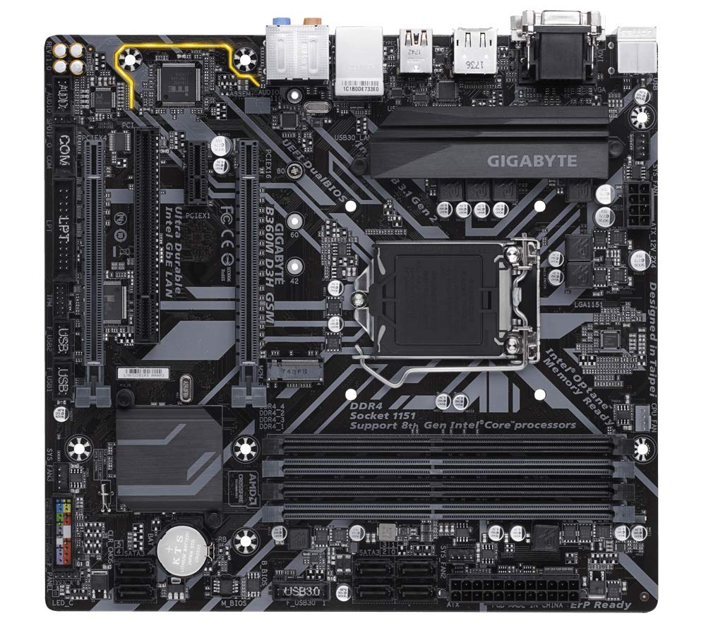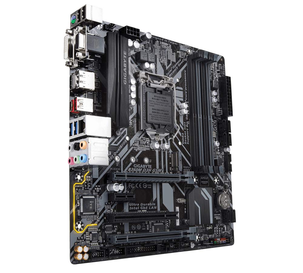 Specifications Mfr Part Number: B360M D3H GSM CPU: LGA1151 Supports the 8th Generation Intel Core i7/ i5/ i3/ Pentium/ Celeron Processors L3 cache varies with CPU Chipset: Intel B360ÂExpress Memory: 4x DDR4-2666/ 2400/ 2133 MHz DIMM Slots, Dual Channel, ECC, Non-ECC, Unbuffered, Max Capacity of 64GB Slots: 2x PCI-Express 3.0 x16 Slots (one runs at x4), 1x PCI-Express 3.0 x1 Slot, 1x PCI Slot Multi-Graphics: ÂSupports AMD Quad-GPUÂand 2-Way CrossFireX Technology Storage: SATA: 6x SATA3 Ports M.2: 1x M.2 Port (w/ M key), Supports type 2242/ 2260/ 2280/ 22110 SATA and PCIe x4/x2 SSDÂAudio: Realtek ALC892Â7.1-Channel High Definition Audio CODEC LAN: Intel Gigabit Ethernet Controller Ports: Â1x USB 3.1 Gen 2 Port (Type-A rear), 5x USB 3.1 Gen1 Ports (1 Type-C rear, 2 rear, 2 via header), 6x USB 2.0/1.1 Ports (2 rear, 4 via headers), 1x PS/2 Mouse/Keyboard Port, 1x VGA Port, 1x DVI-D Port, 1x HDMI Port, 1x DisplayPort, 1x RJ45 LAN Port , Audio I/O Jacks Power Connector: 1x 24pin ATX Main Power Connector, 1x 8pin ATX 12V Power Connector Form Factor: MicroATX, 24.4Âx 23.0Âcm |