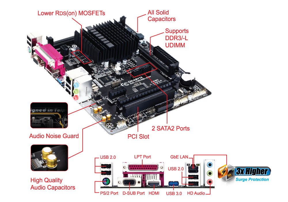 GIGABYTE J1800M-D3P The GIGABYTE J1800M micro ATX motherboard is a fully integrated PC motherboard featuring the Intel Celeron J1800 dual-core processor. Designed for compact, small form factor PC systems and devices, the GIGABYTE J1800M is entirely fanless, making it ideal for always-on, mission critical systems, as well as noise-sensitive digital entertainment systems. Connectivity includes digital and analog display outputs via VGA and HDMI ports, while a PCIe plus a PCI slots provide wide-range expansion card selections. Intel Celeron J1800 Processor The Intel Celeron J1800 Dual-Core processor is the latest system on chip (SoC) from Intel, combining CPU, graphics and memory controller in one package. Based on the 22nm manufacturing process, the Intel Celeron J1800 uses the smallest package of any desktop processor within a low thermal envelope of on 10 watts. The Intel Celeron J1800 boasts excellent performance including DX11 gaming on Intel HD Graphics, plus a dedicated H.264 encoder for smooth HD video playback. HDMI-The Next Generation Multimedia Interface is a High-Definition Multimedia Interface which provides up to 5Gb/s video transmitting bandwidth and 8-channel good quality audio all through a single cable. Able to transmit superior, uncompressed digital video and audio, HDMI ensures the crispest rendering of digital content up to 1080p without the quality losses associated with analog interfaces and their digital-to-analog conversion. In addition, HDMI is compatible with HDCP (High-bandwidth Digital Content Protection), allowing the playback of Blu-ray/HD DVD and other protected media content. |