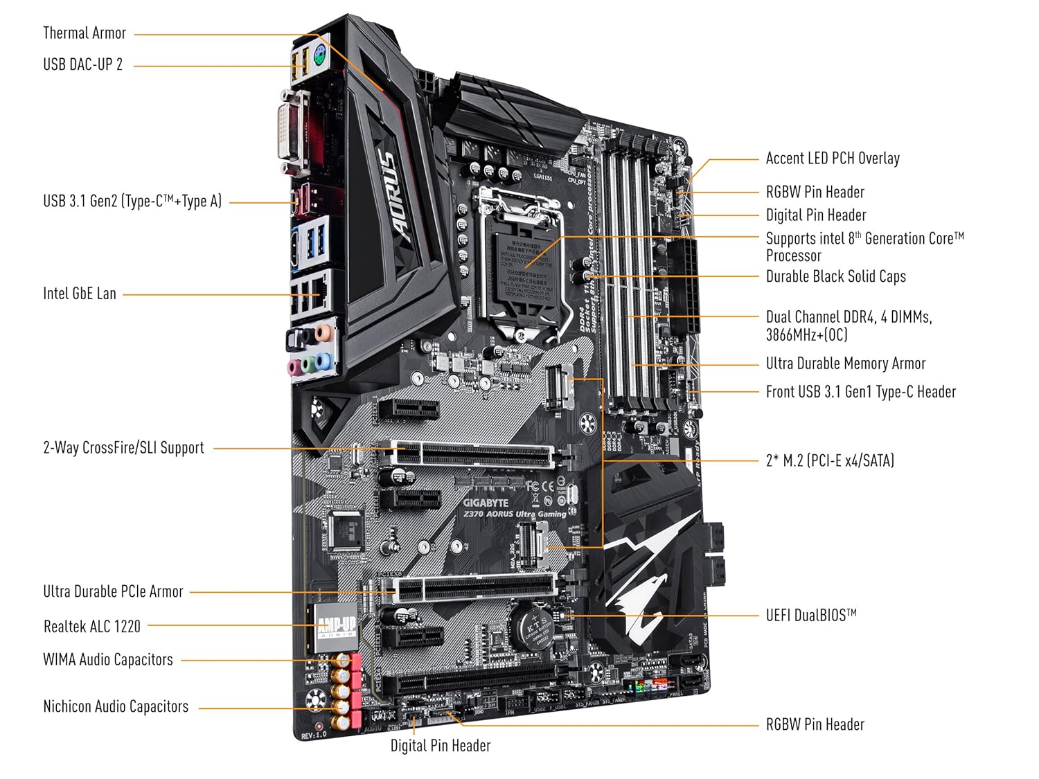 Supports 8th Generation Intel Core Processors Dual Channel DDR4, 4DIMMs USB 3.1 Gen 2 Type C 3-Way Graphics Support with Ultra Durable Design Intel Gigabit LAN USB DAC-UP 2 with Adjustable Voltage USB RGB FUSION with Multi-Zone LED light Show Design Gigabyte UEFI Dual BIOS APP Center Including Easy Tune and Cloud Station Utilities, ATX Form Factor. 305mm X 244mm. |