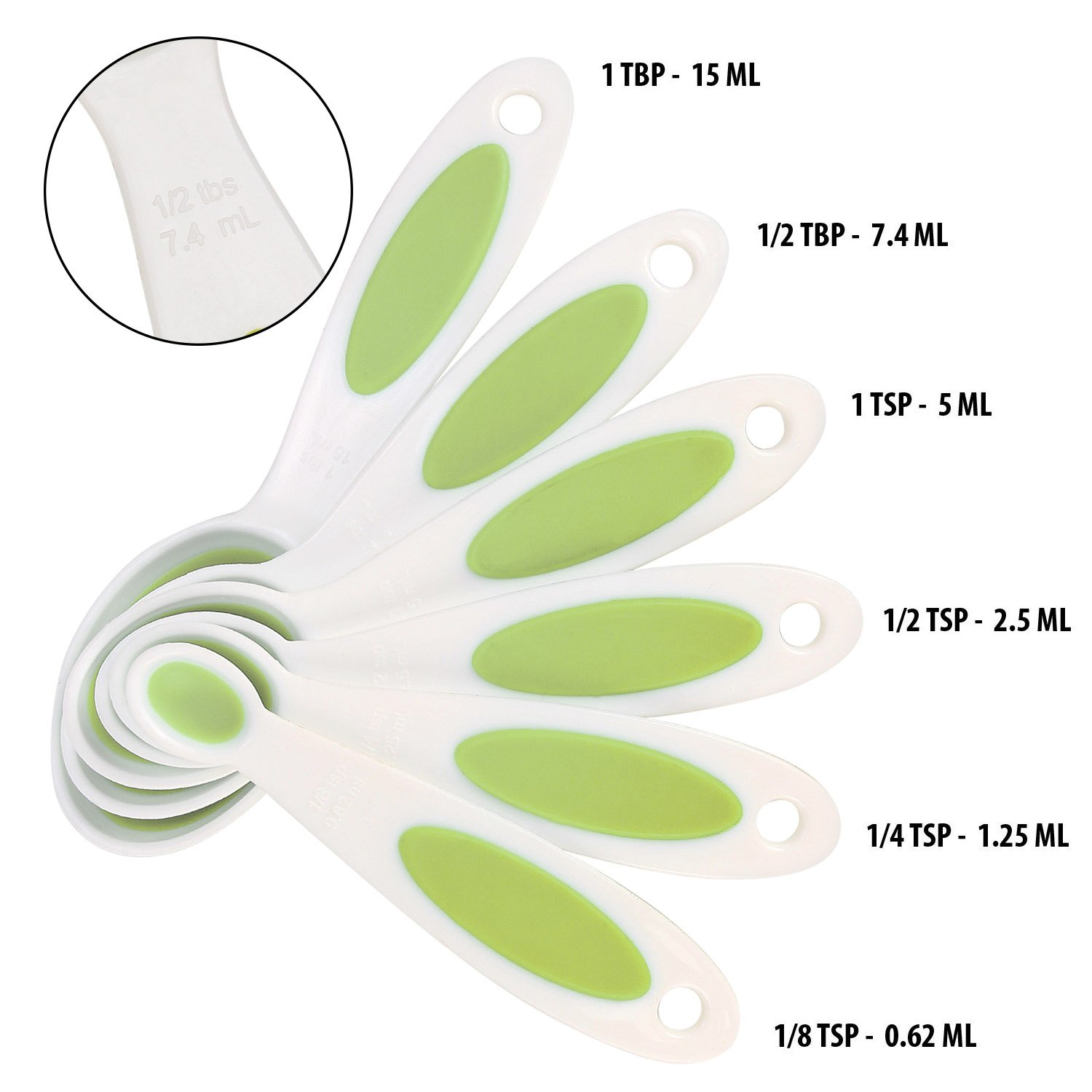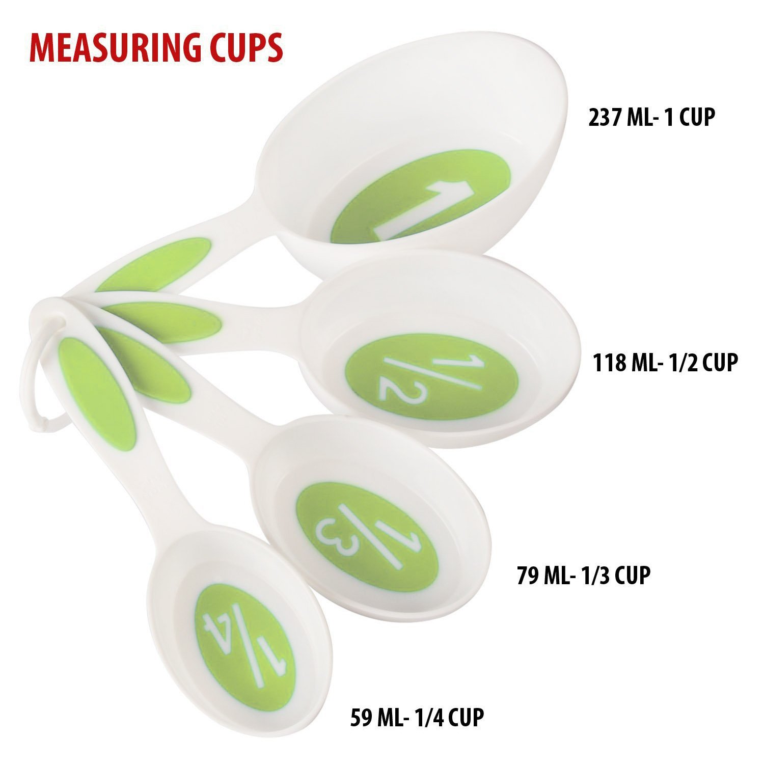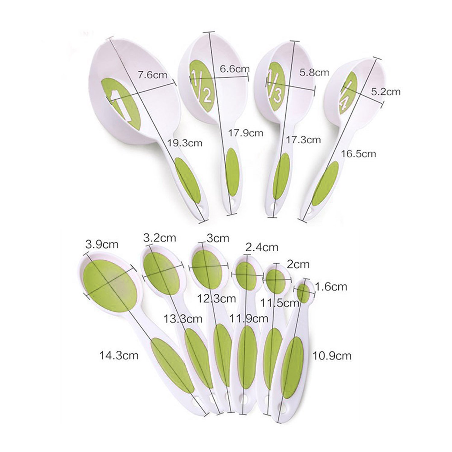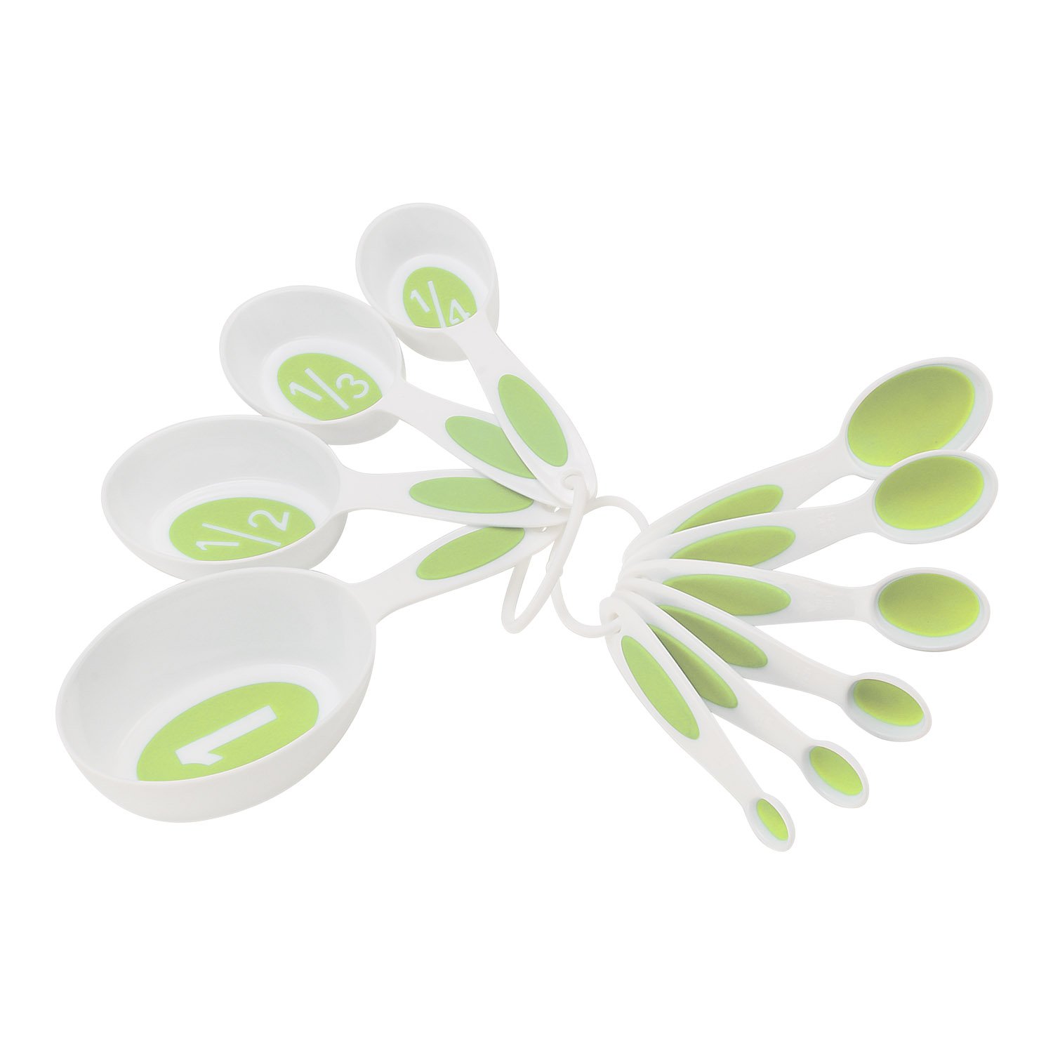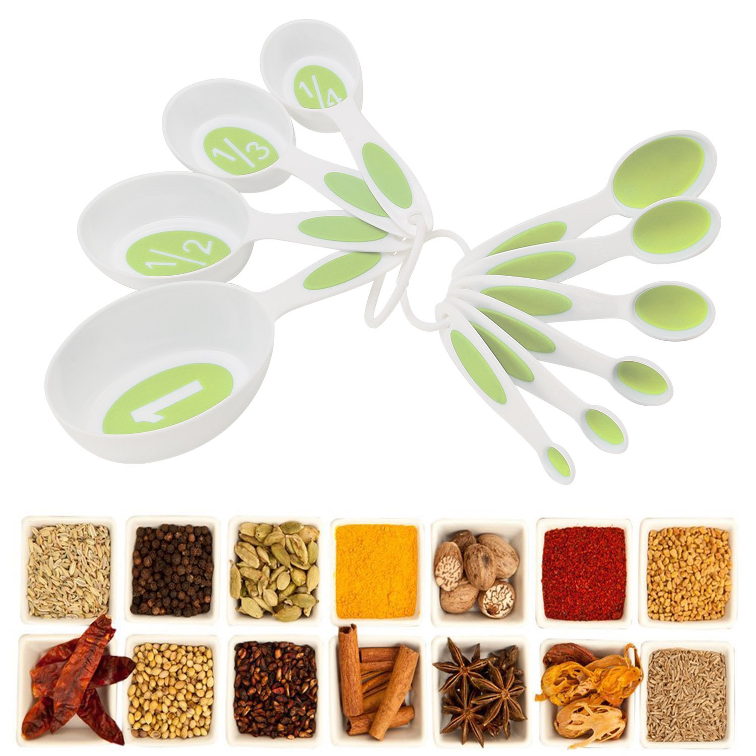 1/4, 1/3, 1/2 and 1 Cup Sizes. Spoons: 1/8, 1/4, 1/2, 1 Teaspoon and 1/2, 1 Tablespoon Sizes