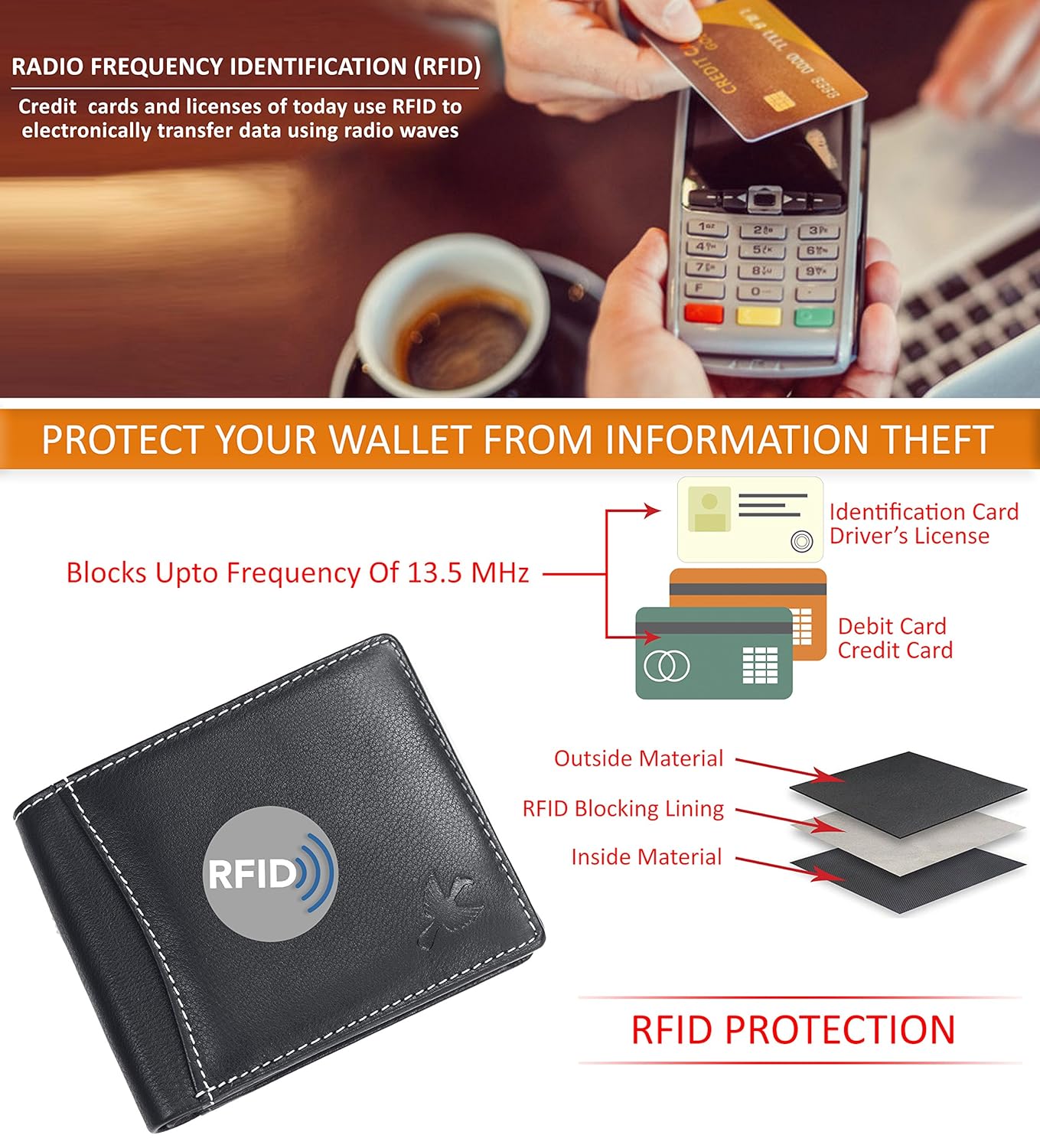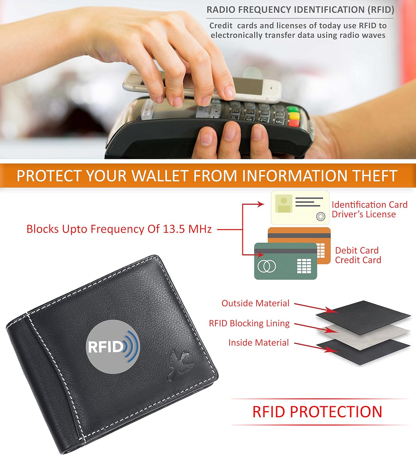RFID BLOCKING SECURITY: Our wallets are equipped with advanced RFID SECURE Technology, a unique metal composite, engineered specifically to block 13.5 MHz or higher RFID signals and protect the valuable information stored on RFID chips from unauthorized scans.