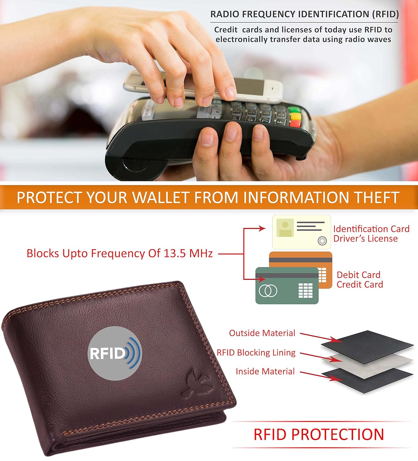 RFID BLOCKING SECURITY: Our wallets are equipped with advanced RFID SECURE Technology, a unique metal composite, engineered specifically to block 13.5 MHz or higher RFID signals and protect the valuable information stored on RFID chips from unauthorized scans.