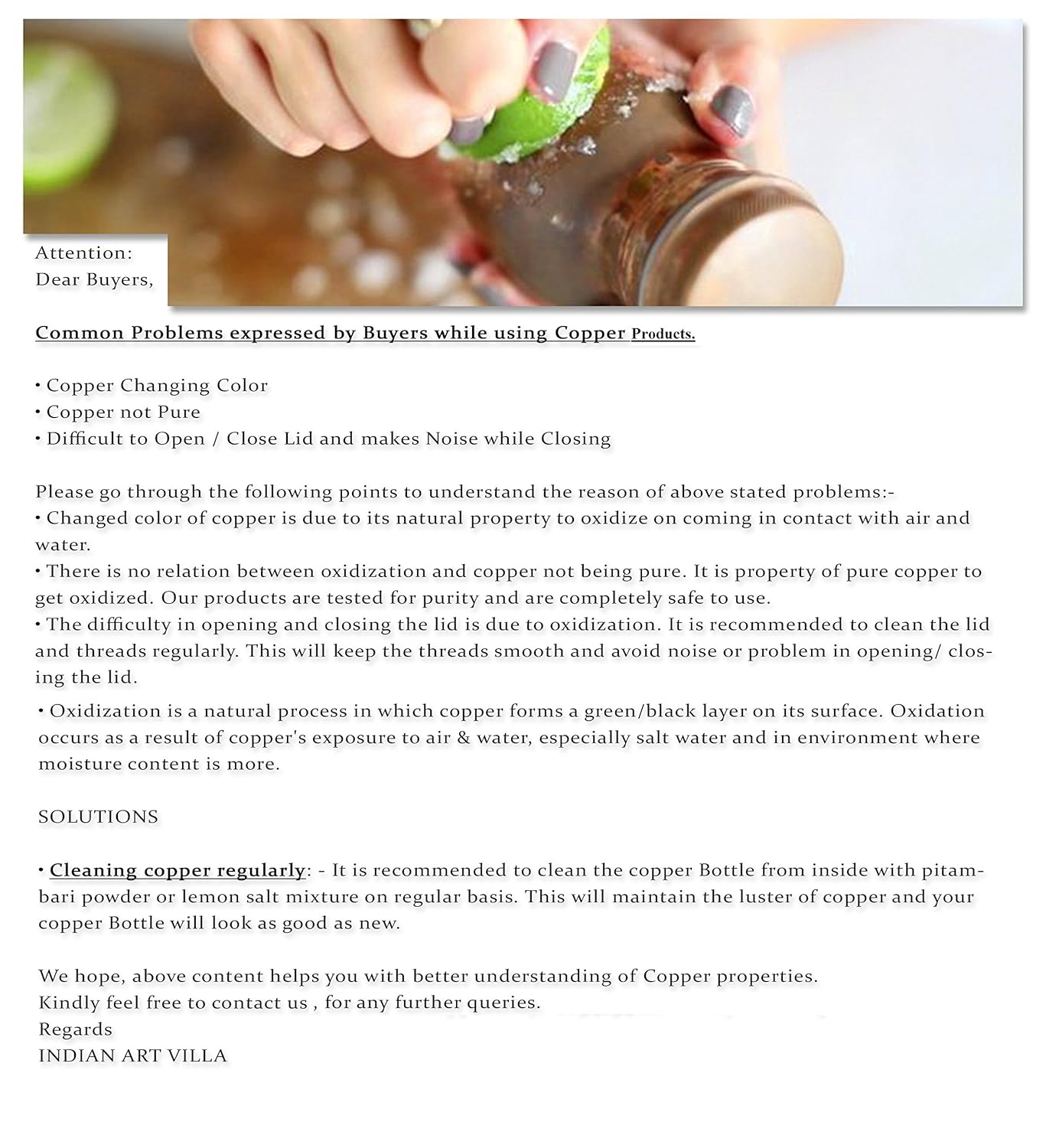 Cleaning Instrucations:- Clean your copperware by hand and avoid dishwasher. Use pitambri powder to clean copper utensils and wipe with soft cotton cloth