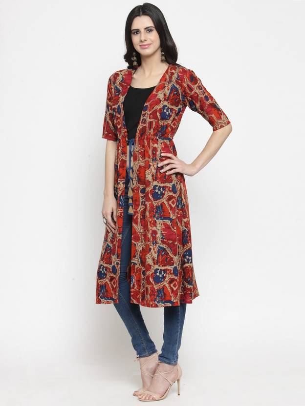 Indibelle Rayon Multi Colour Abstract Print Shrug, V-Neck Neck, Elbow Sleeves, Use The Drawstring with Fabric Funde, Flared Hem