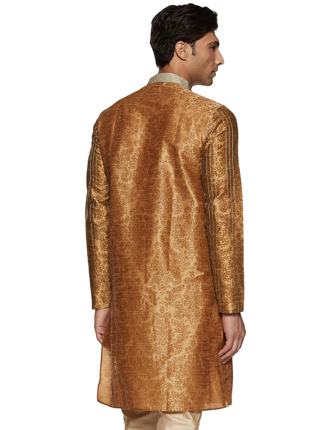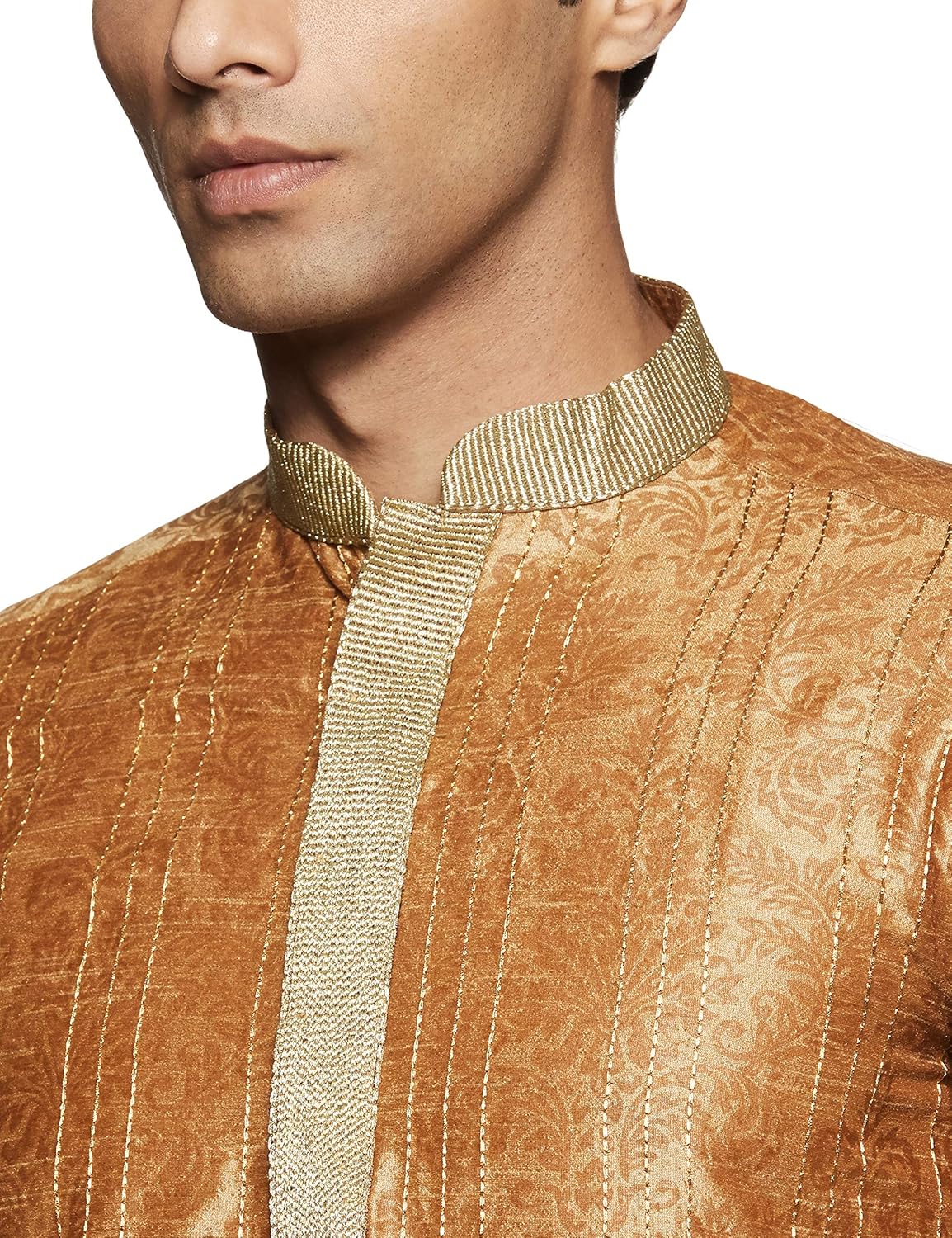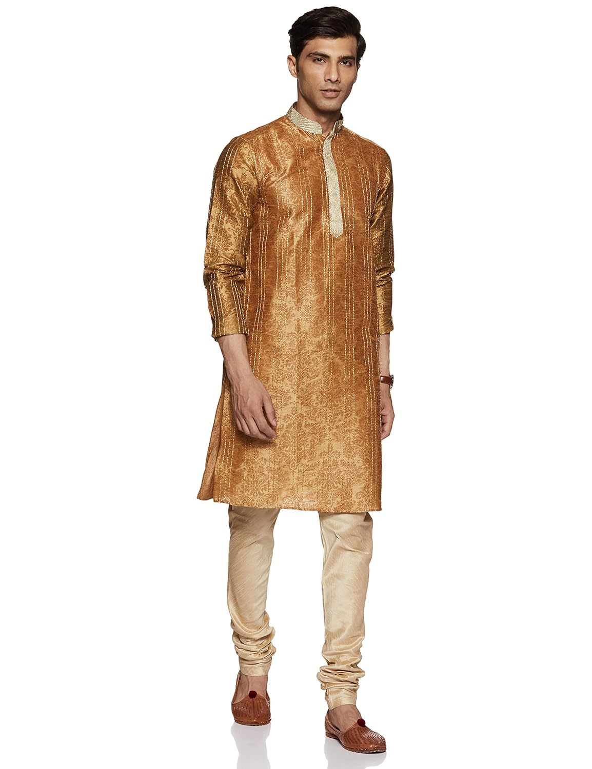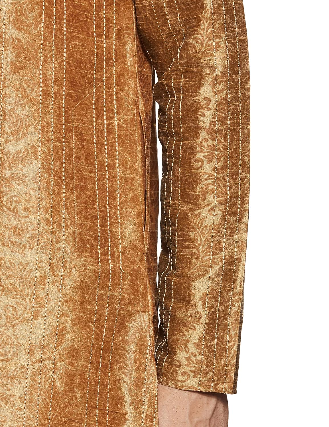 Impress everyone around you by wearing this gold kurtaes in regular fit self designed pattern. Adding to its appeal this kurta has a round neck band collar, its polyester fabric also keepsfortable throughout the day. |