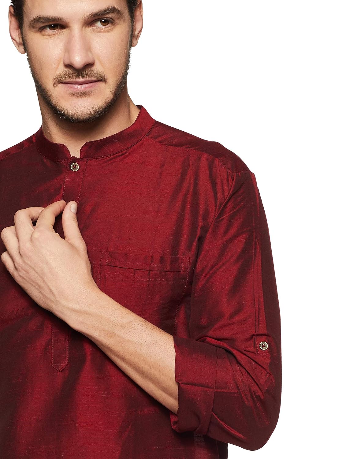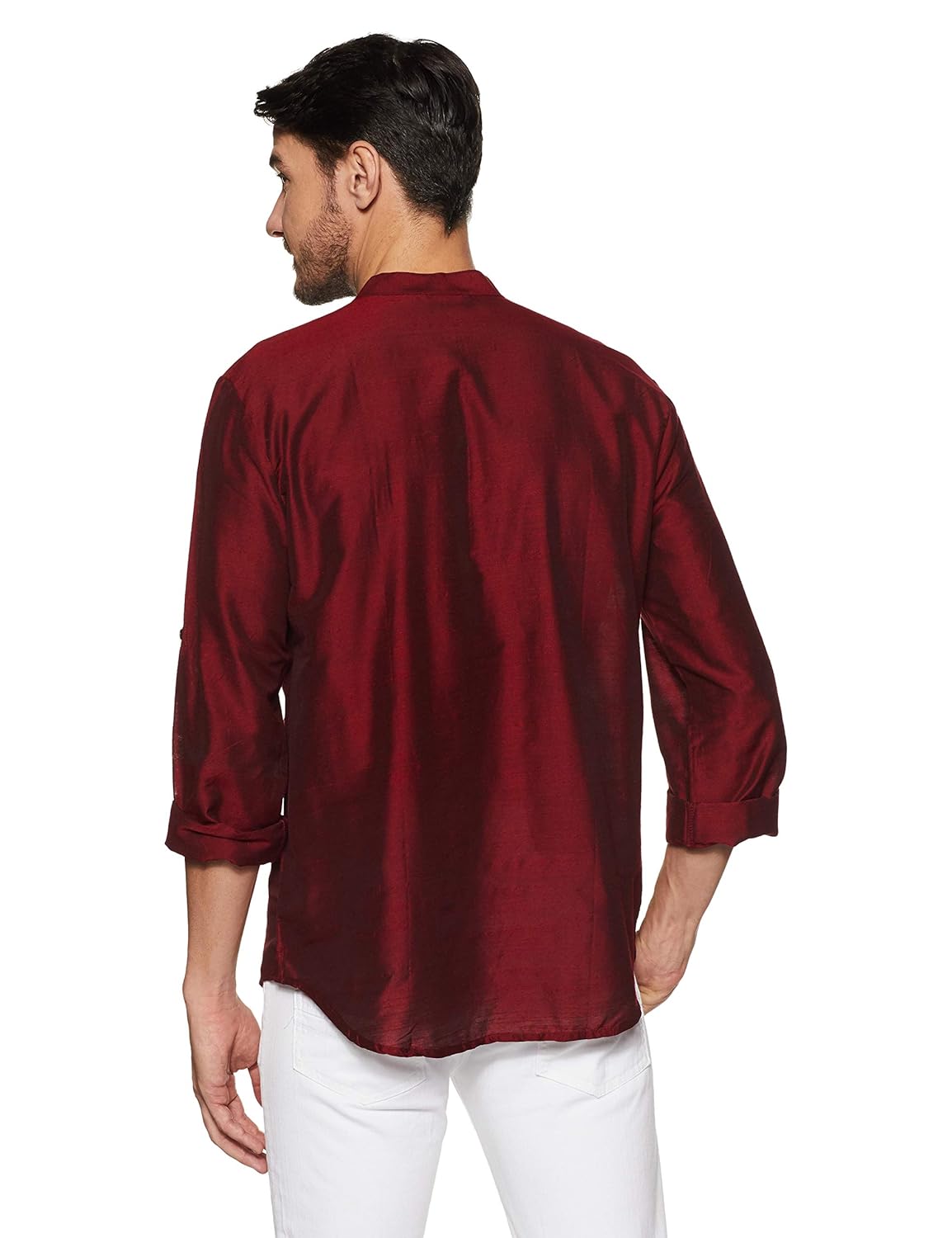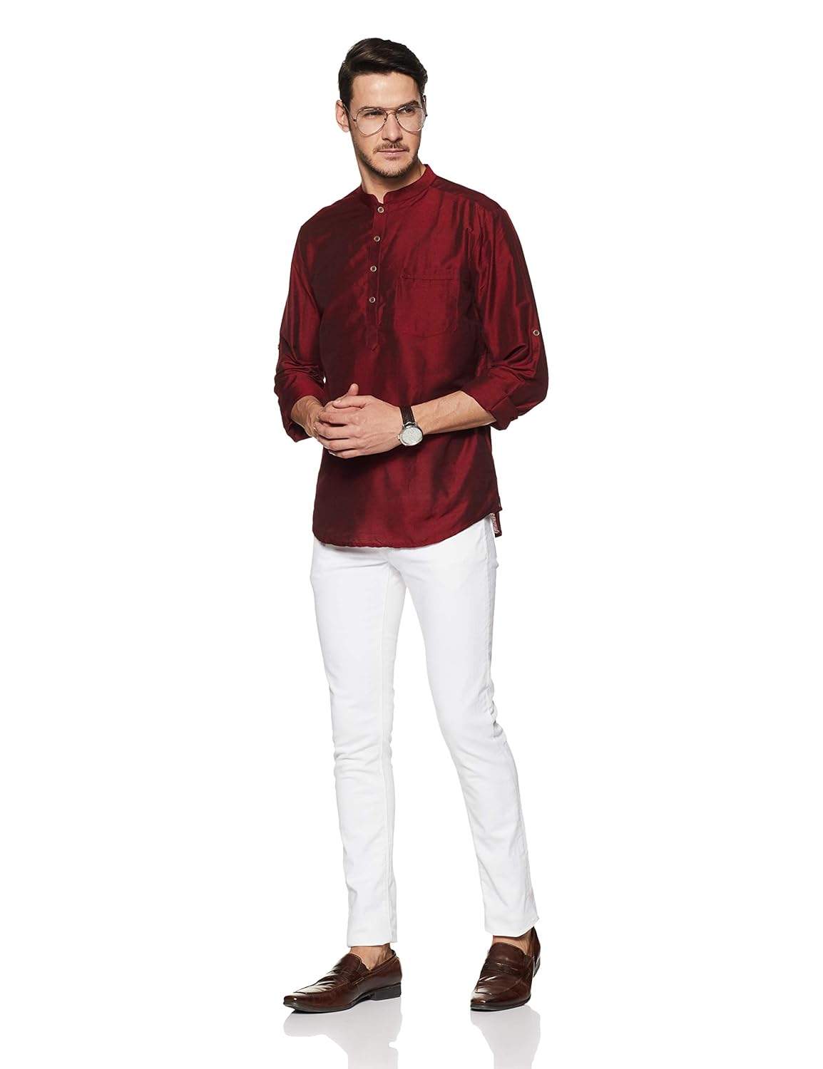 Featuring a round neck with a band collar, this short lengthes in regular fit. It is solid, maroon in color and has full sleeves. |
