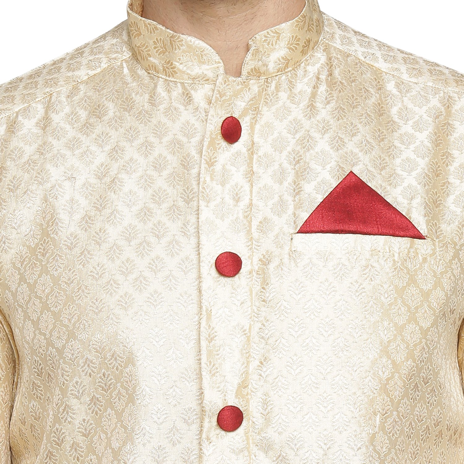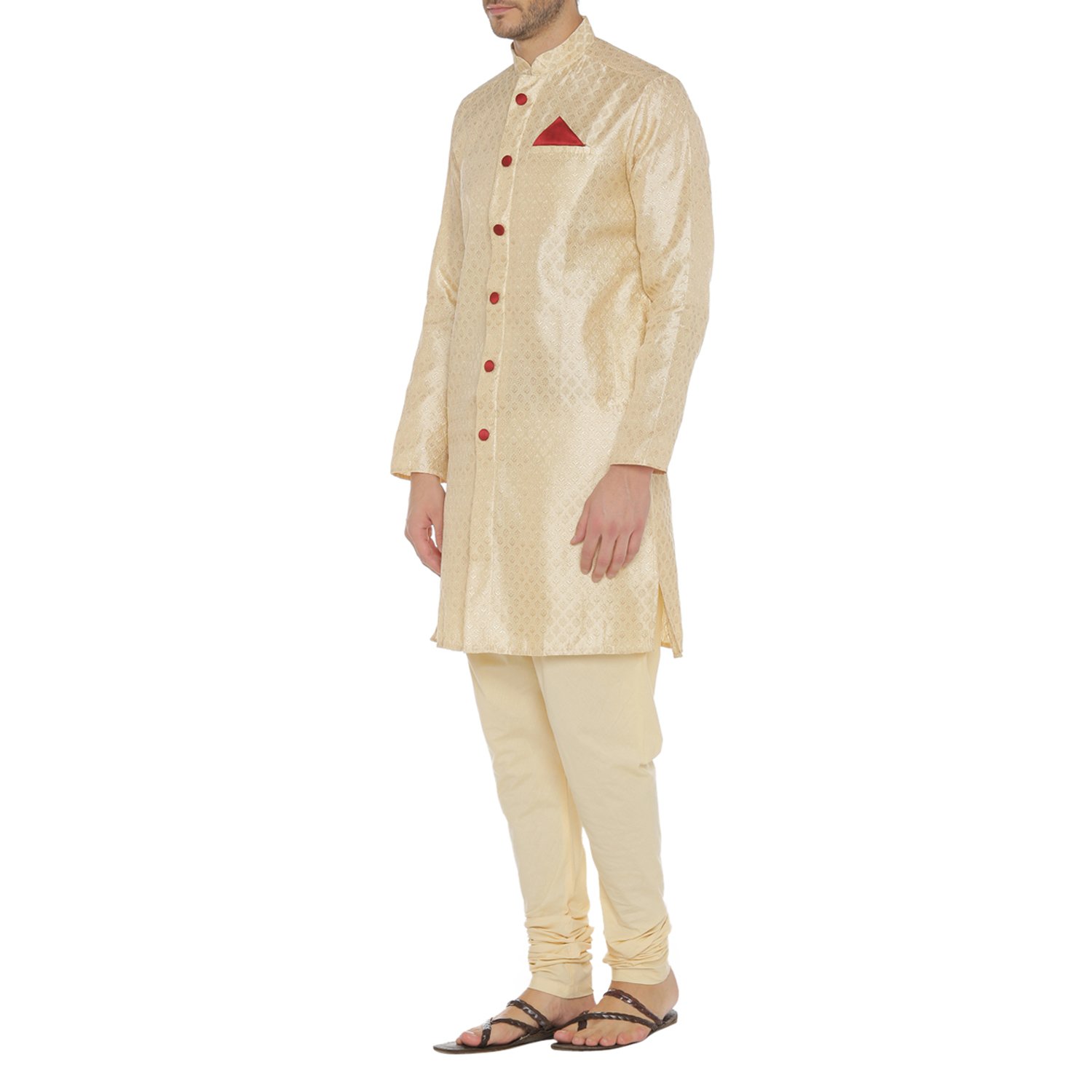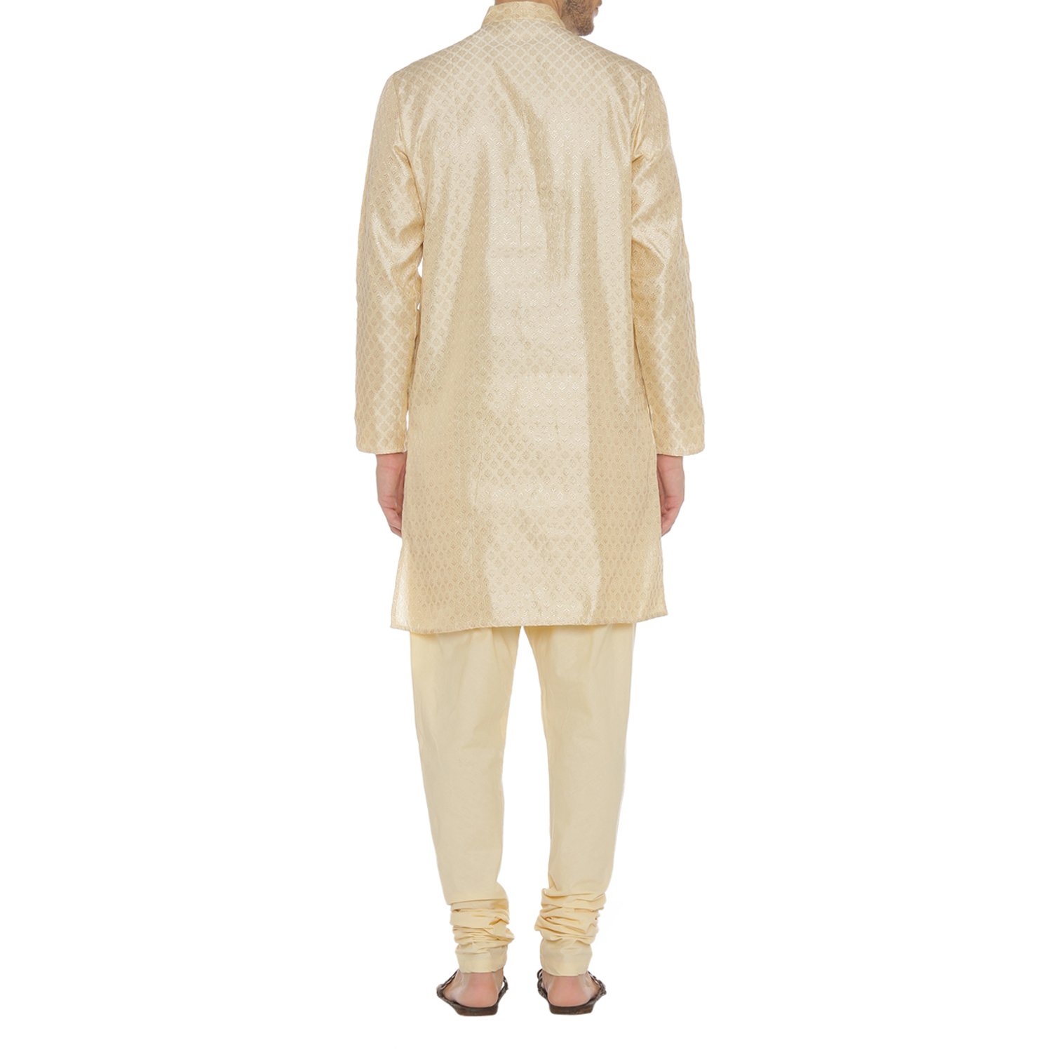 Fabricated from self designed polyester, this off-white knee length kurta is tailored to have a regular fit featuring a round neck with a band collar. |