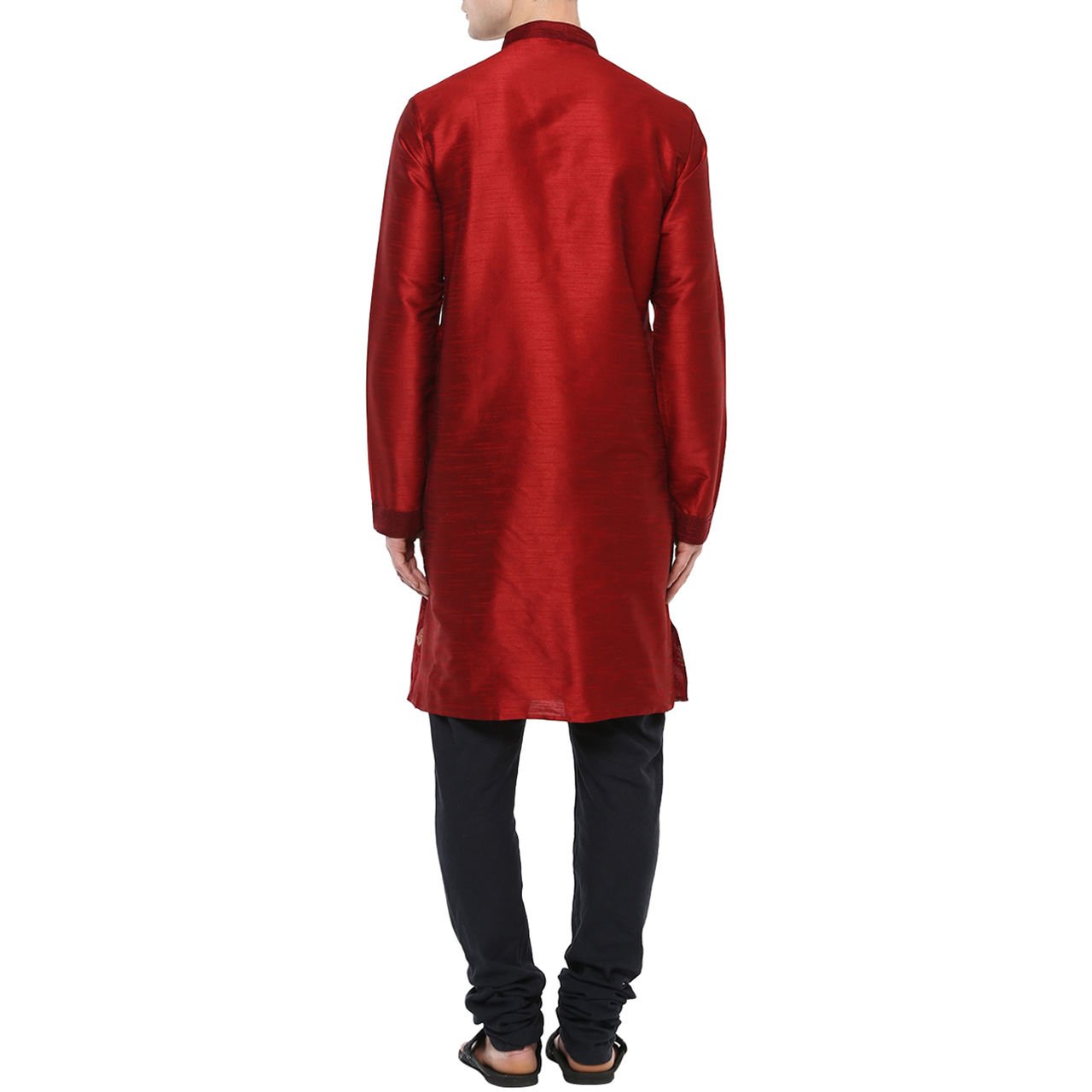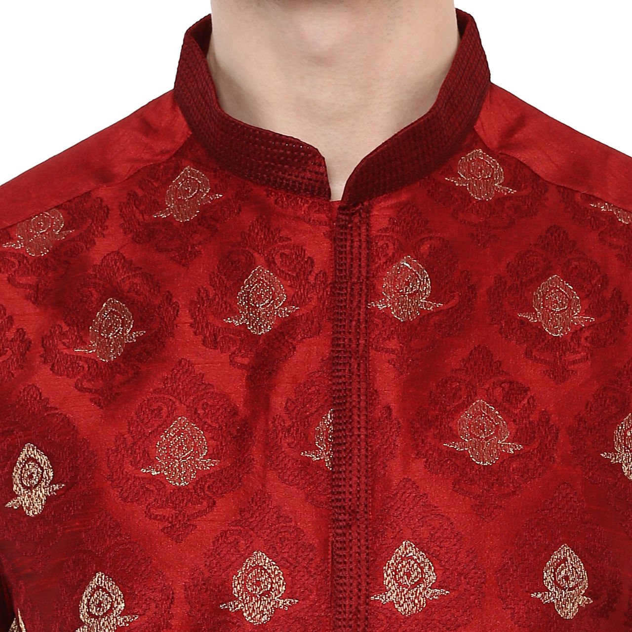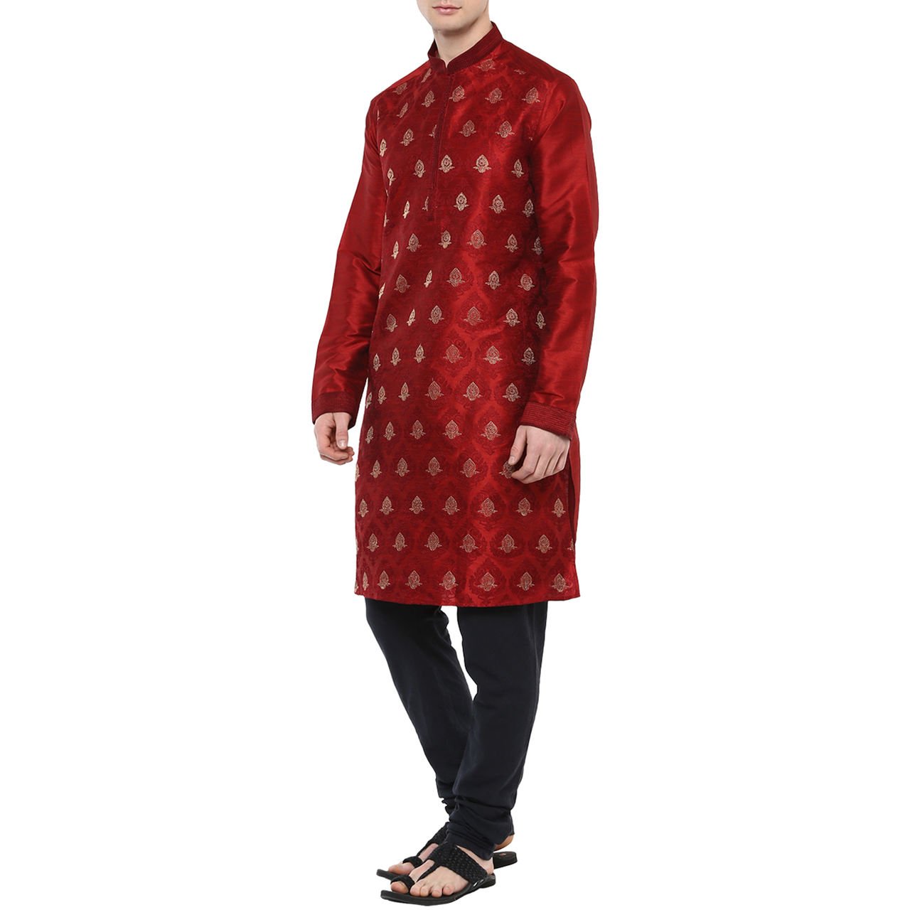Maroon long kurta featuring woven bold traditional motifs all over, solid full sleeves. Mandarin collar and front placket, stitch detailing on collar and front placket, long side slits. Stitch detailing on cuffs, solid back design, regular fit, cambric fabric. |