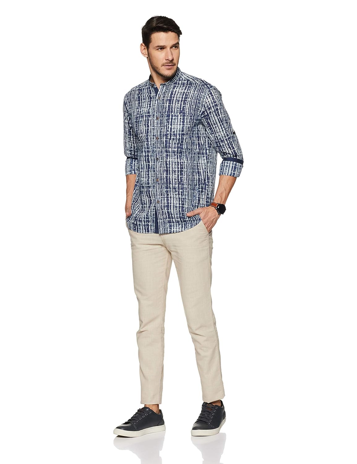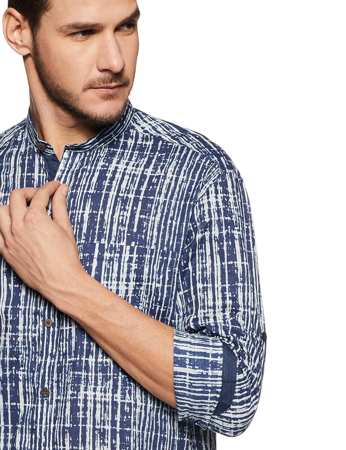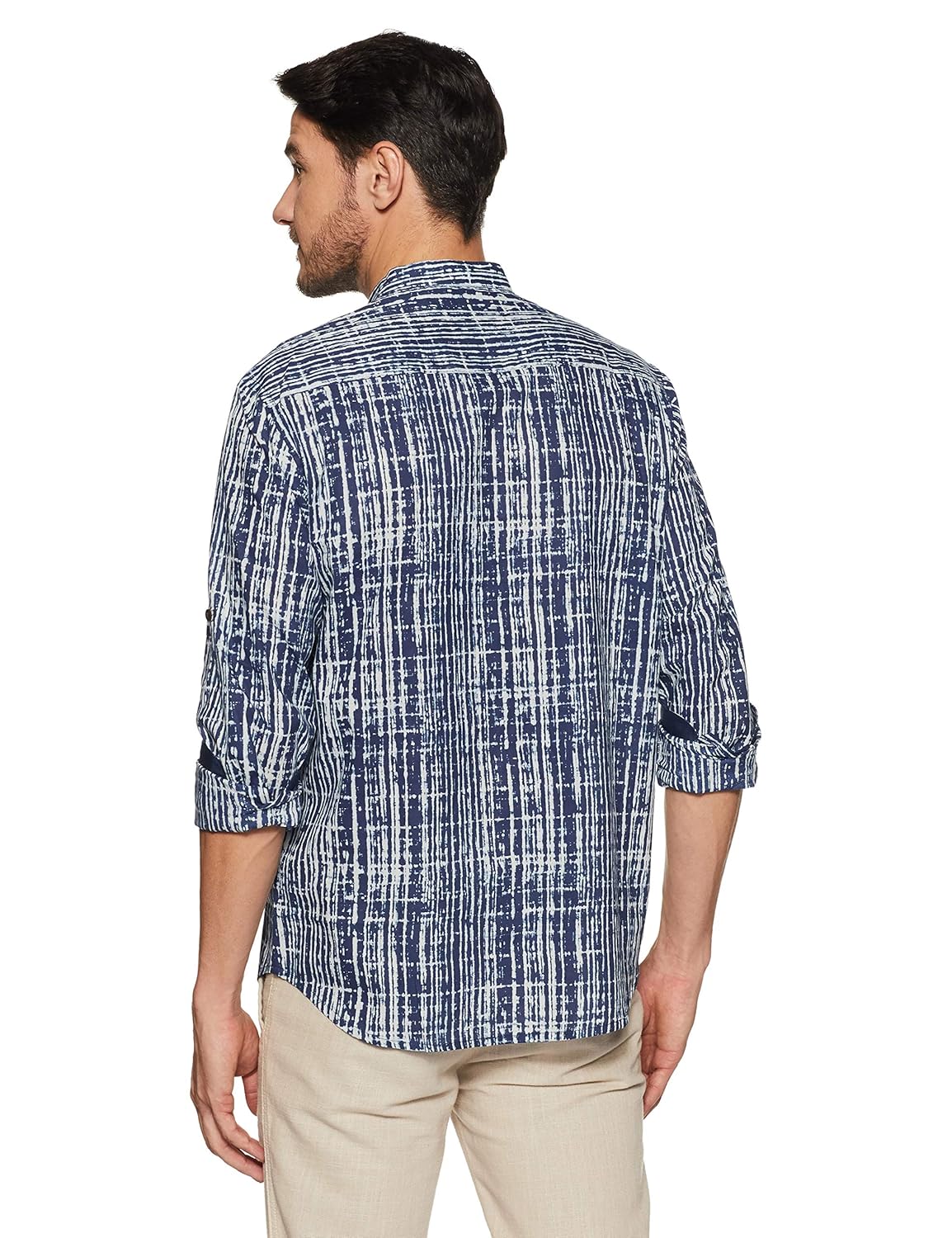 Indigo in colour, this slim-fit shirt is fashioned from cambric fabric and features a band collar, patch pocket on the chest, full sleeves with mitered cuffs, curved hem, full button placket and an abstract print all over. |