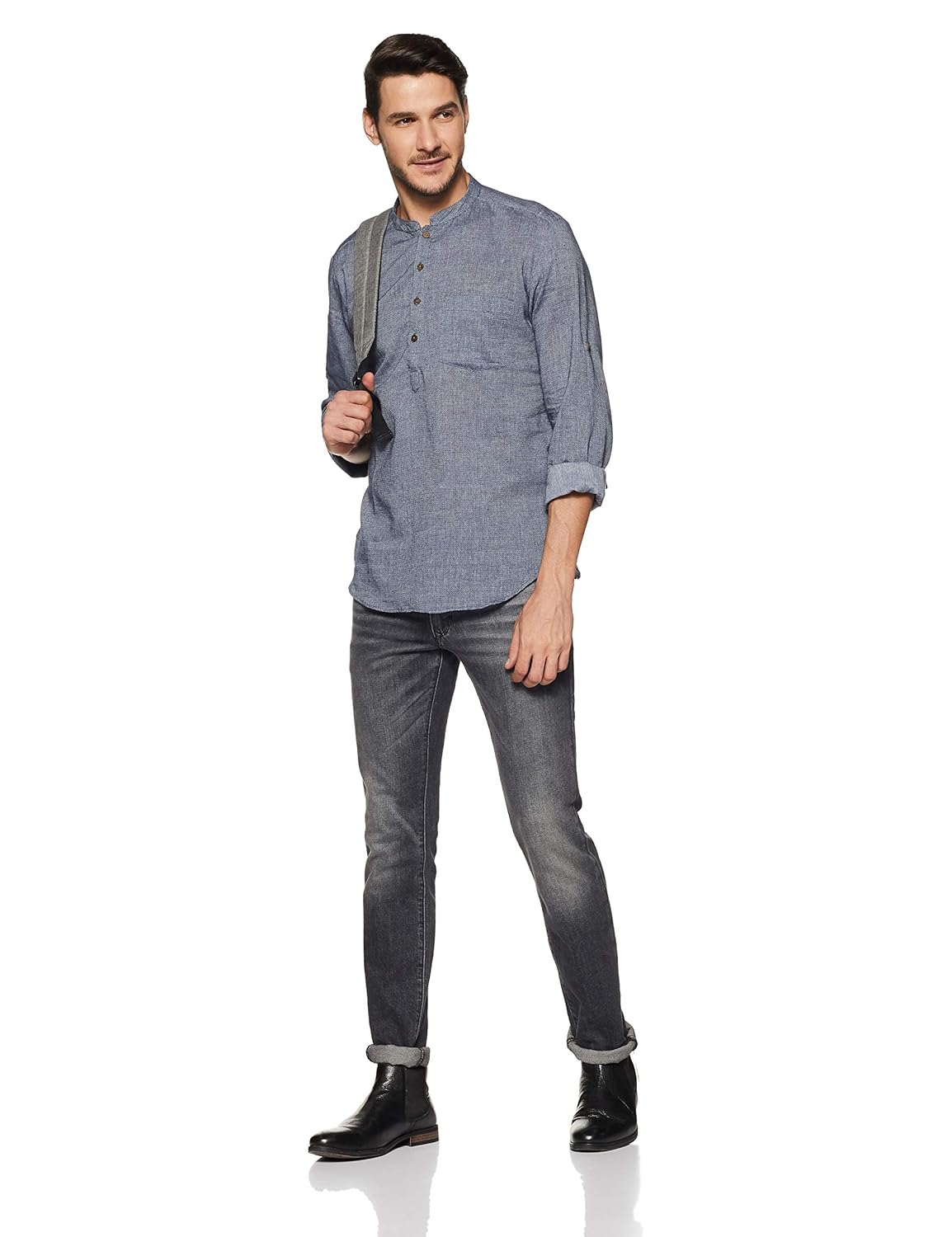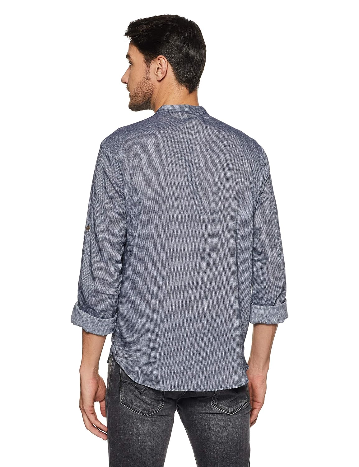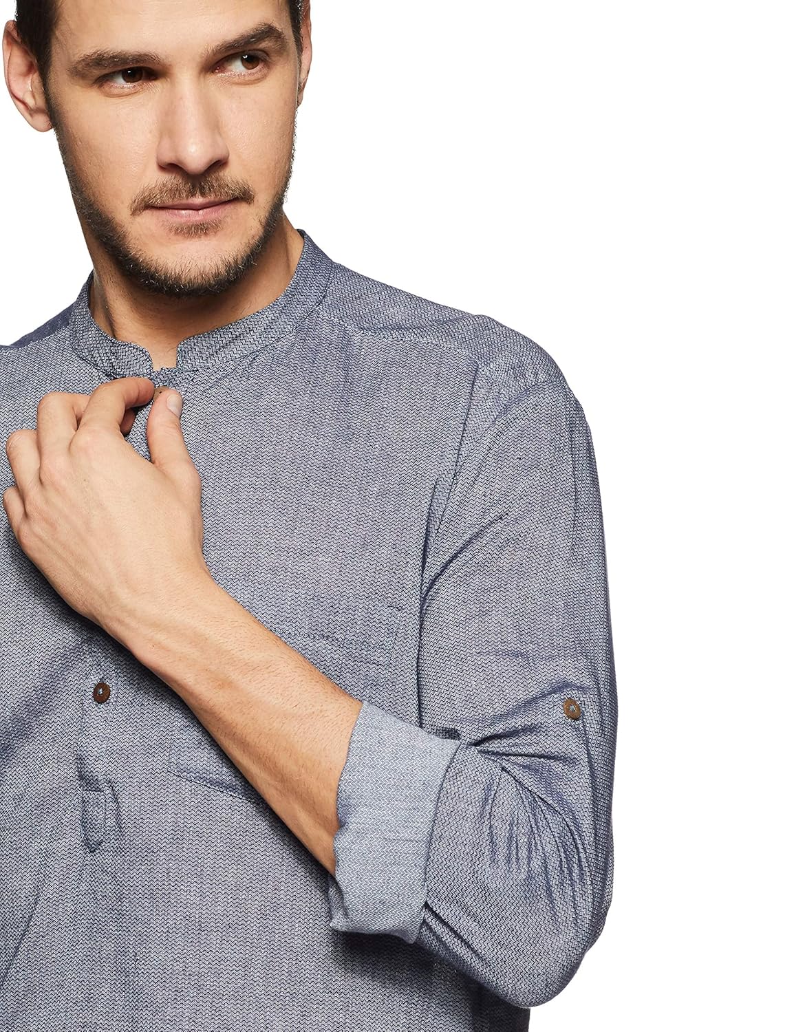 Pastel Blue colored solid short kurta, featuring full sleeves, mid thigh length, round neck with band collar and slim fit pattern. Made from cotton fabric for maximum comfort. |