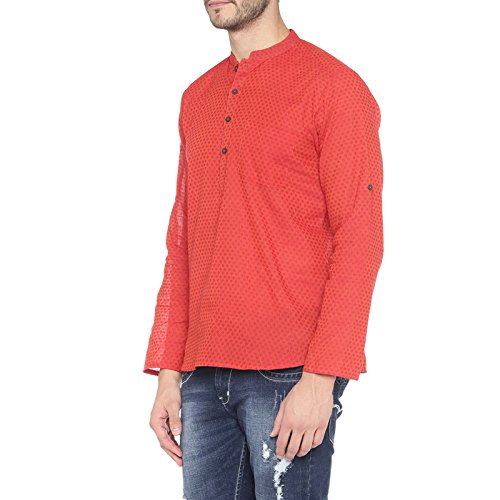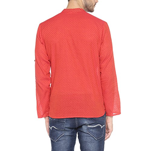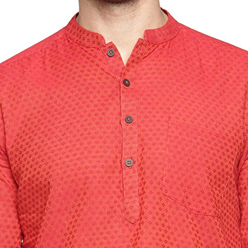 Made for a fashionable appeal, this orange colored slim fit kurta features a self design. The amazingfortable cotton fabric gives this round neck band collared kurta a sophisticated appeal. |