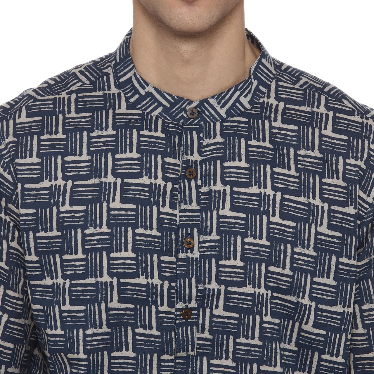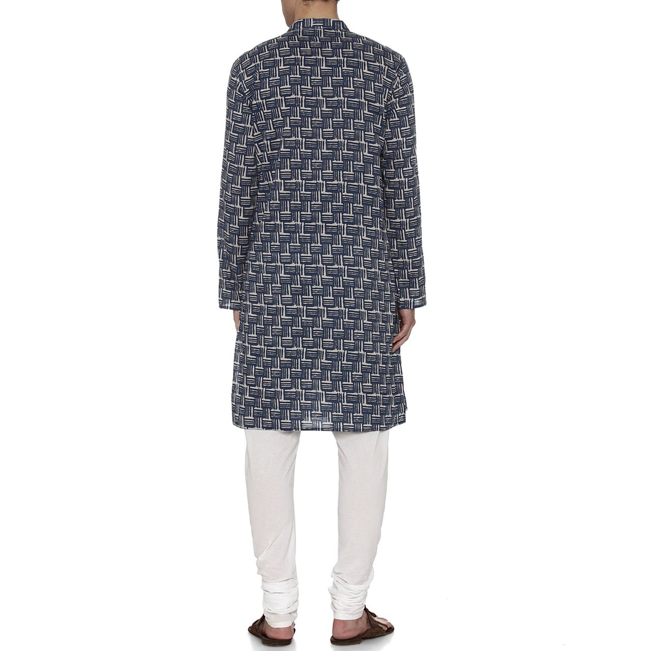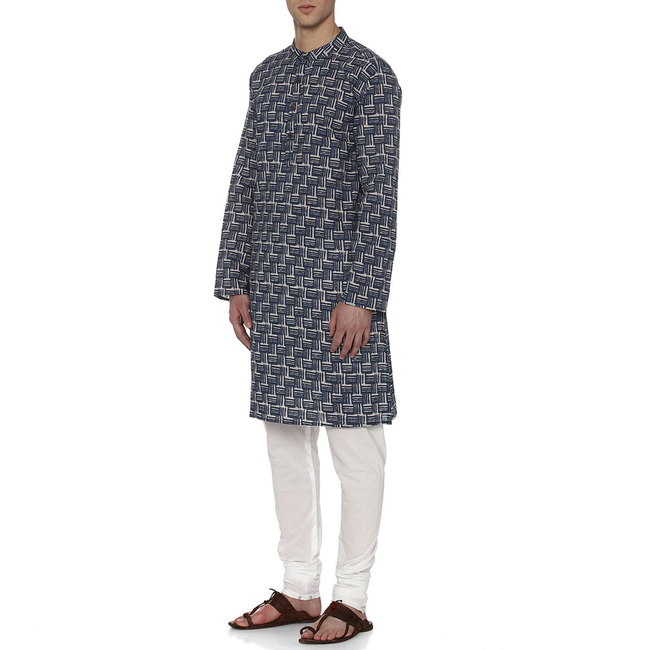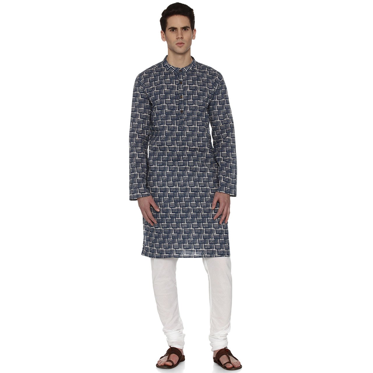 Blue casual kurta in regular-fit with long sleeves and round neck. Made of Cotton, this knee length kurta features mandarin collar and indigo print. |