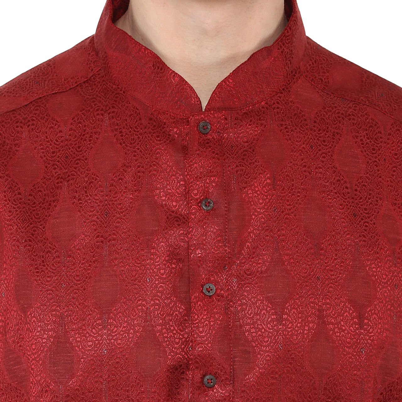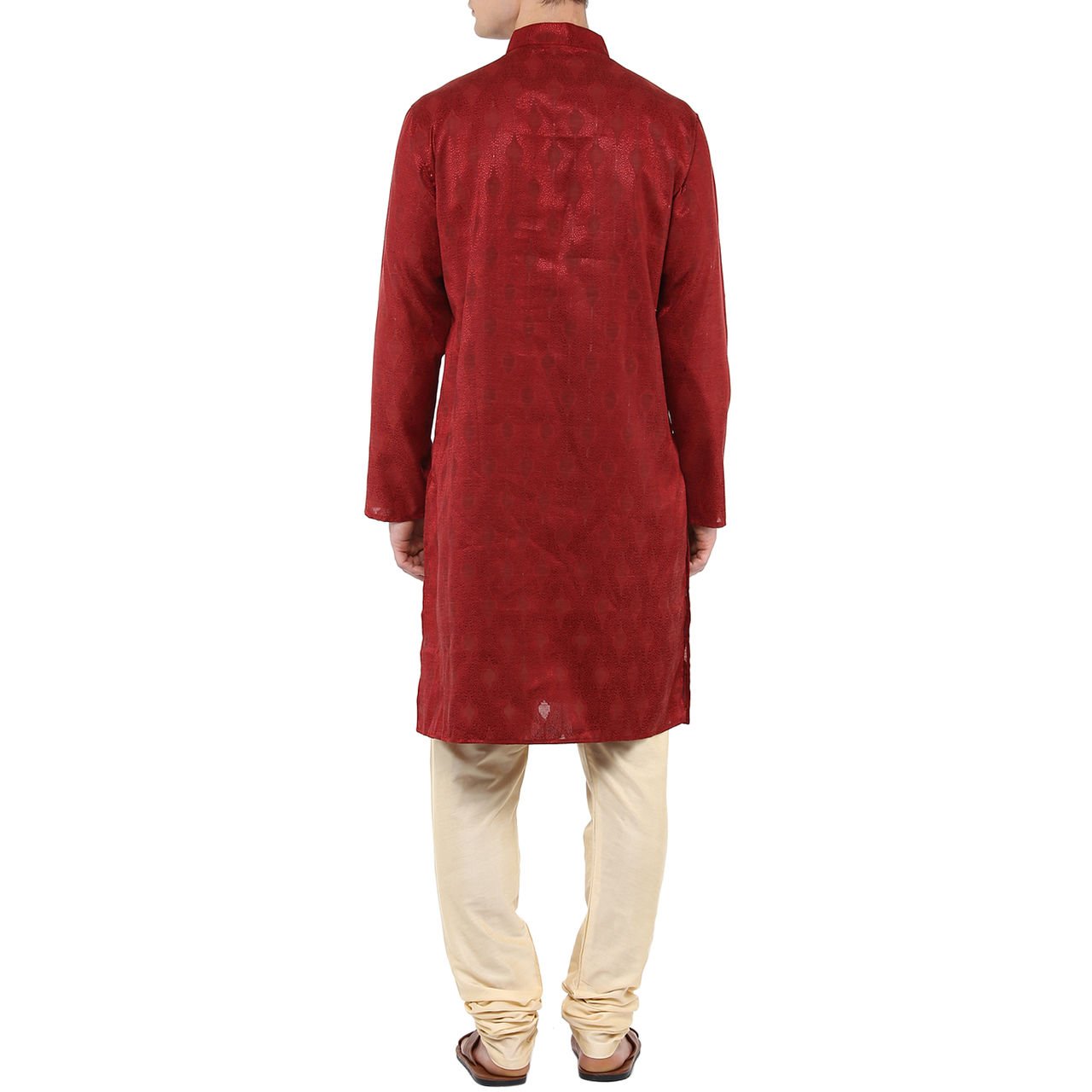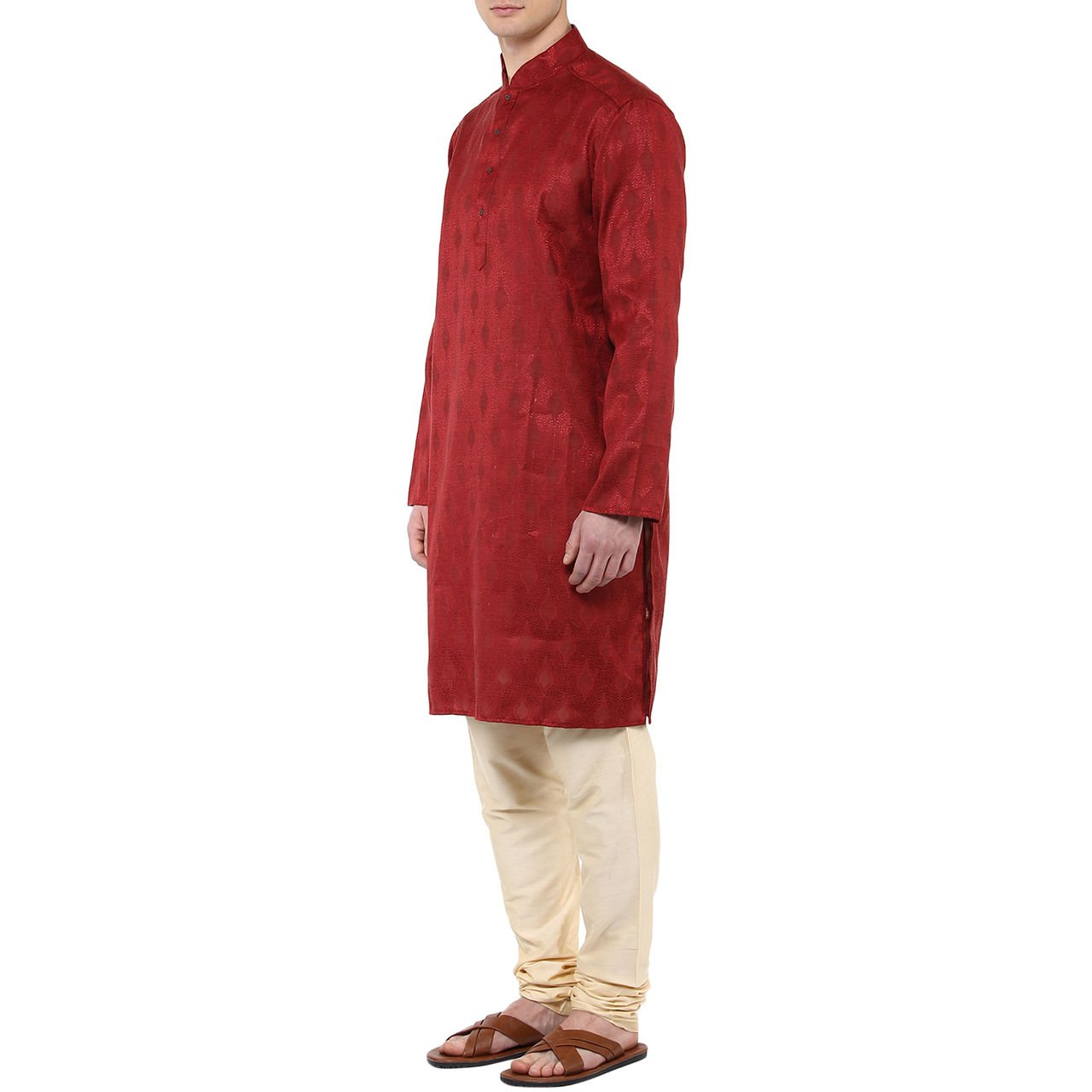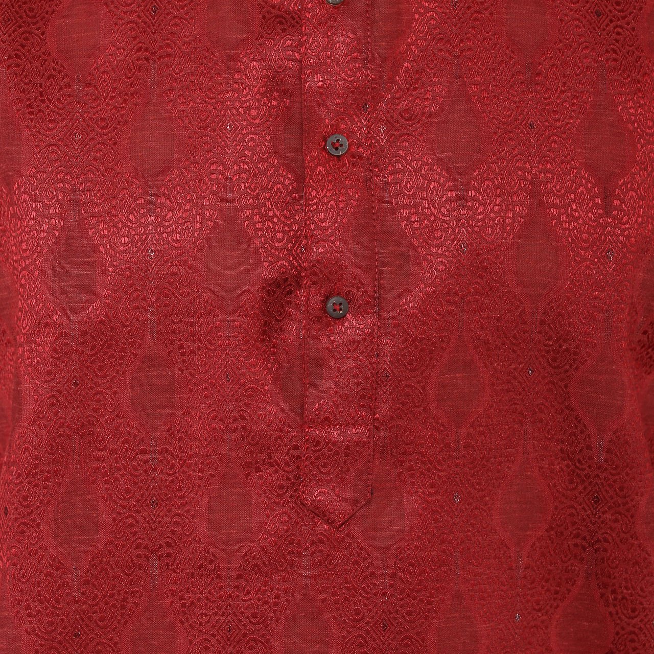 Maroon in colour, this regular-fit kurta is fashioned from cotton fabric and features a band collar, full sleeves, side slits, subtle self design and a short button placket. |