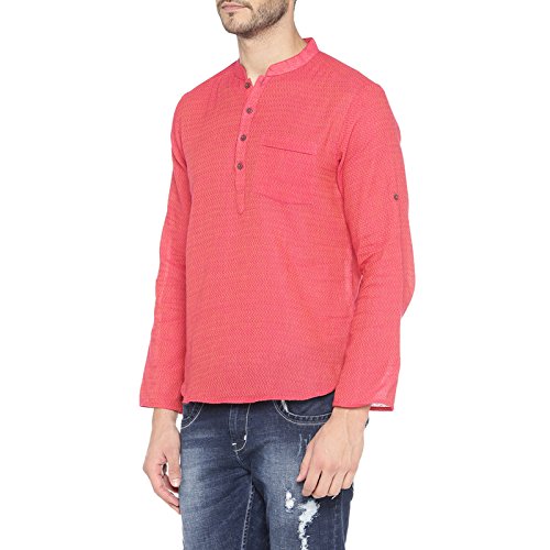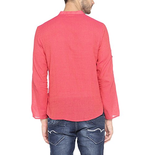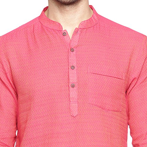 Designed to perfection, this pink colored slim fites in a self designed pattern with three button placket for easy functioning. Featuring round neck band collared characteristic, thises in cotton fabric to keep you atfort. |