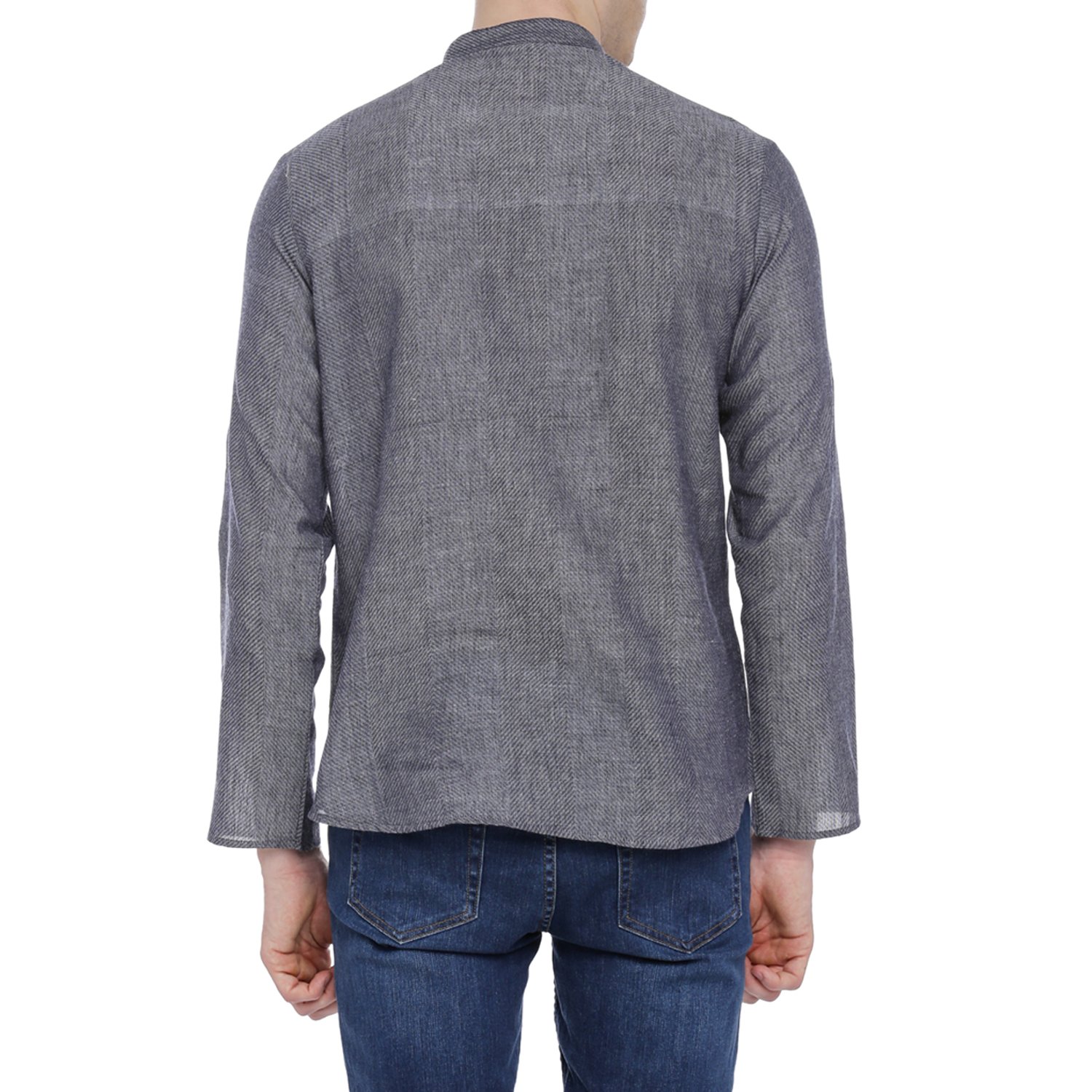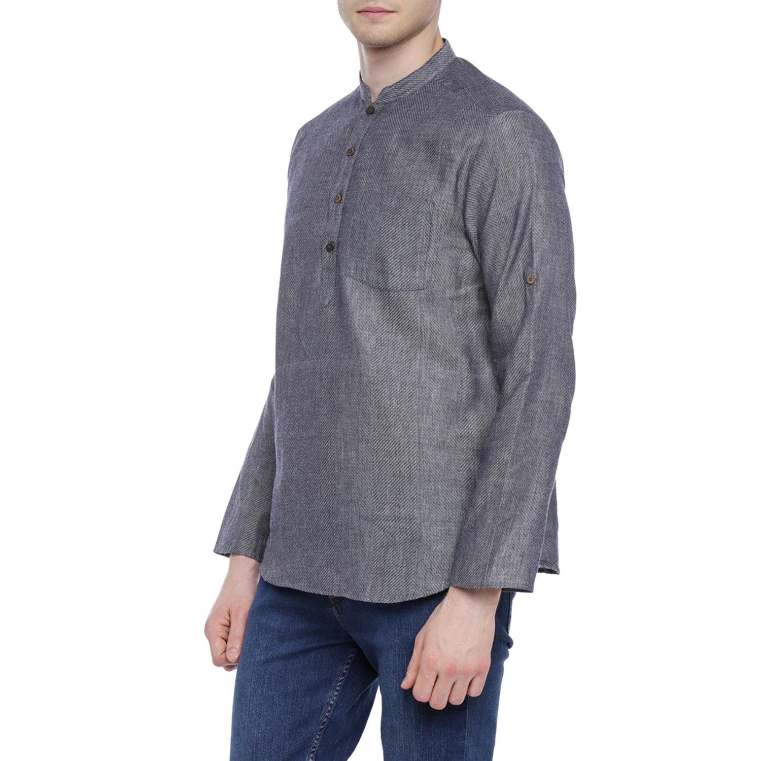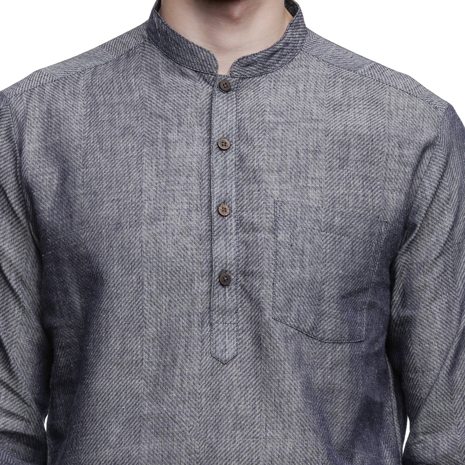 Blue colored short kurta, featuring a slim fit, round neck with a band collar, full sleeves and mid thigh length. It is crafted from superior quality self designed cotton fabric. |