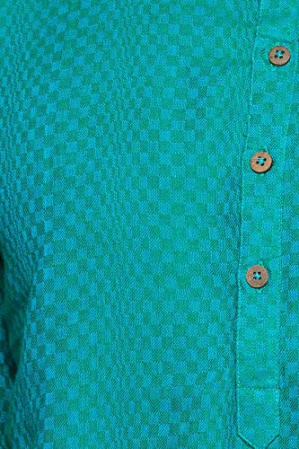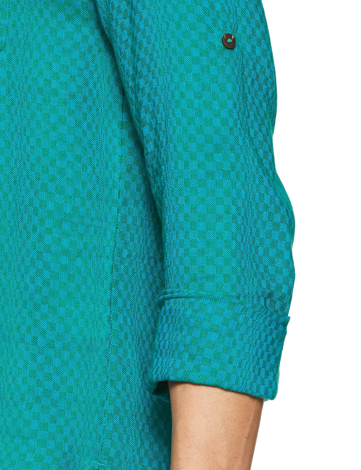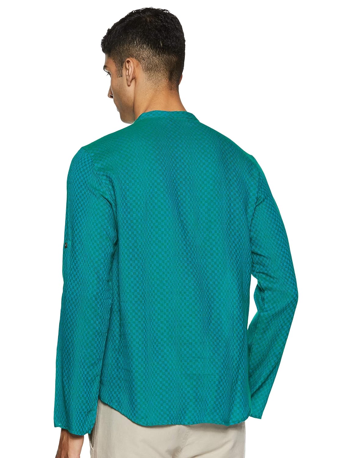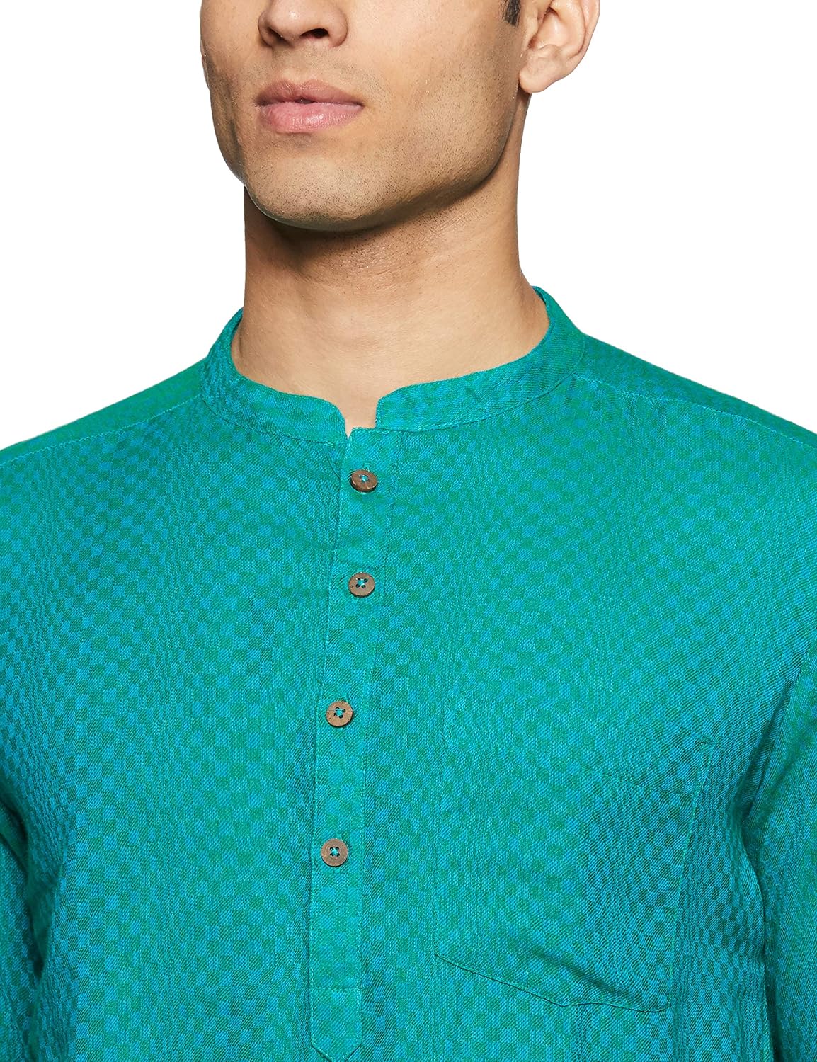 Presenting round neck kurta with a band collared markings, also features cotton fabricated in turquoise color and a full sleeves pattern. It has a self designed and a slim fit pattern. |