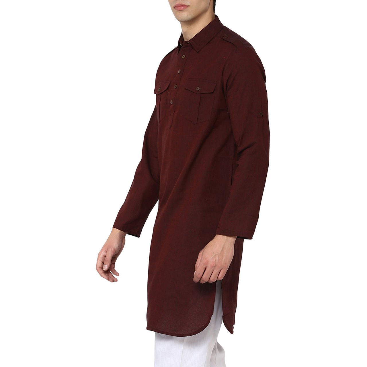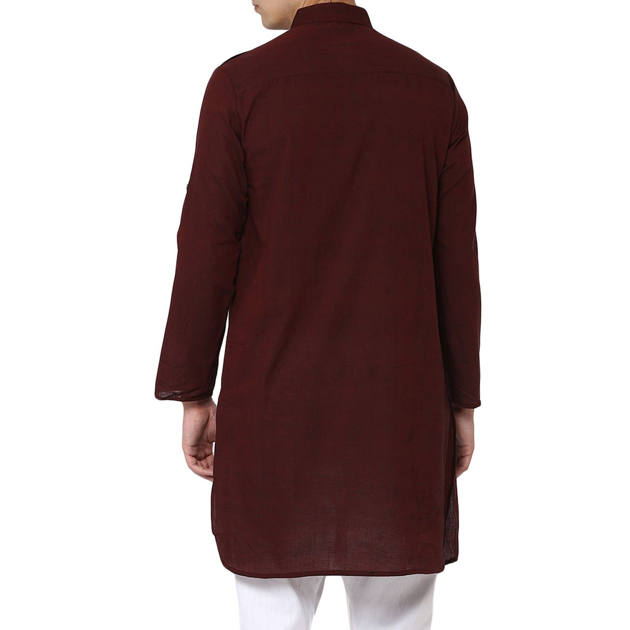 Maroon in colour, this regular-fit kurta is fashioned from cotton fabric and features a collar, full sleeves, front flap pockets, short button placket and a solid design. |