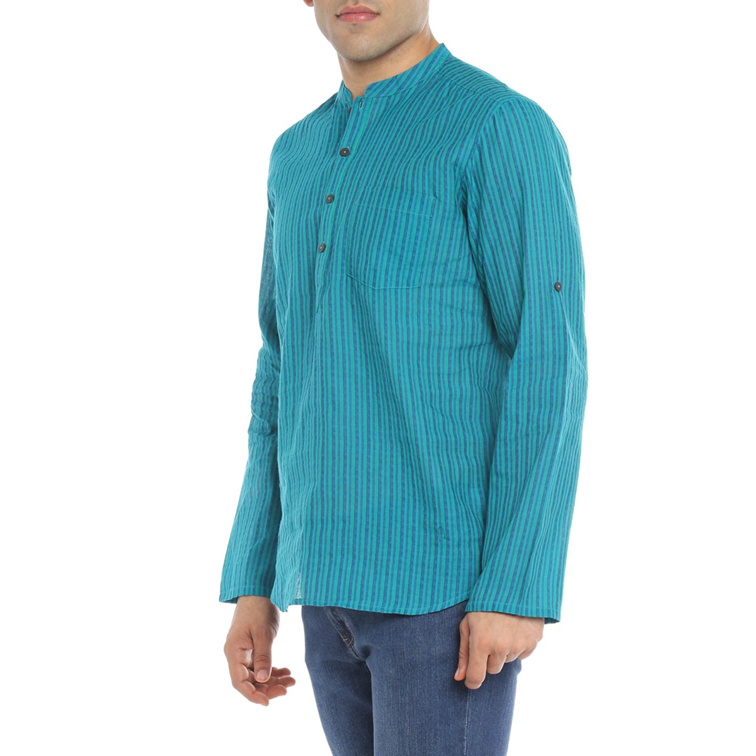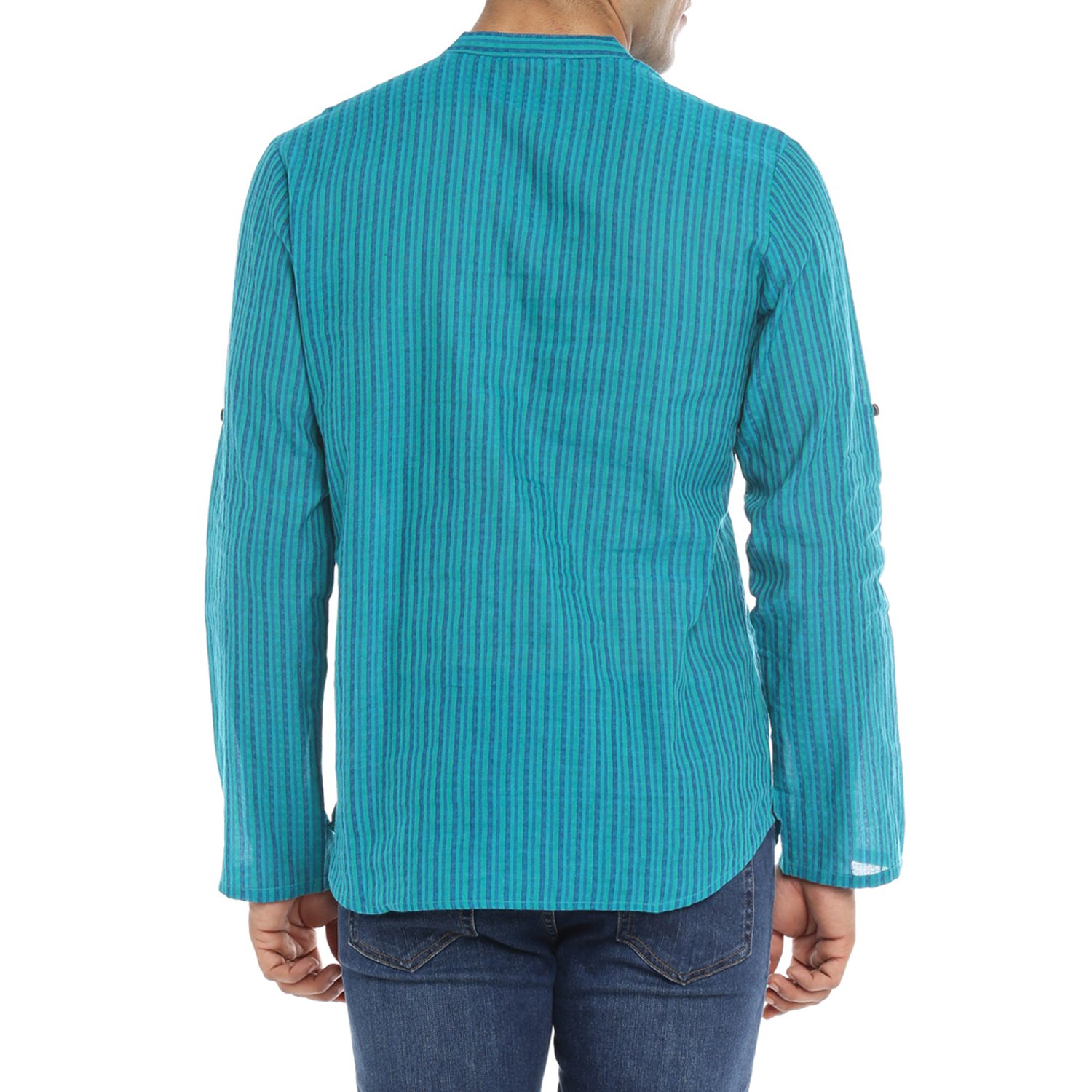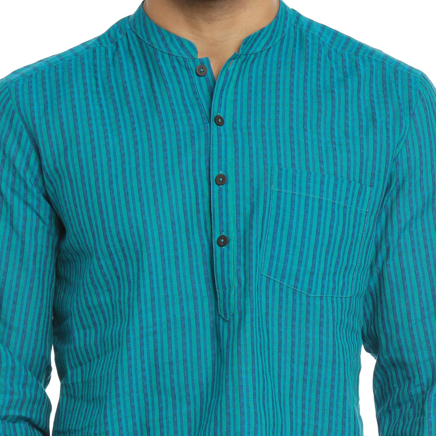 Turquoise colored solid printed kurta, featuring full sleeves, round neck with band collar, mid thigh length and slim fit pattern. Made from cotton fabric for maximum breathability. |