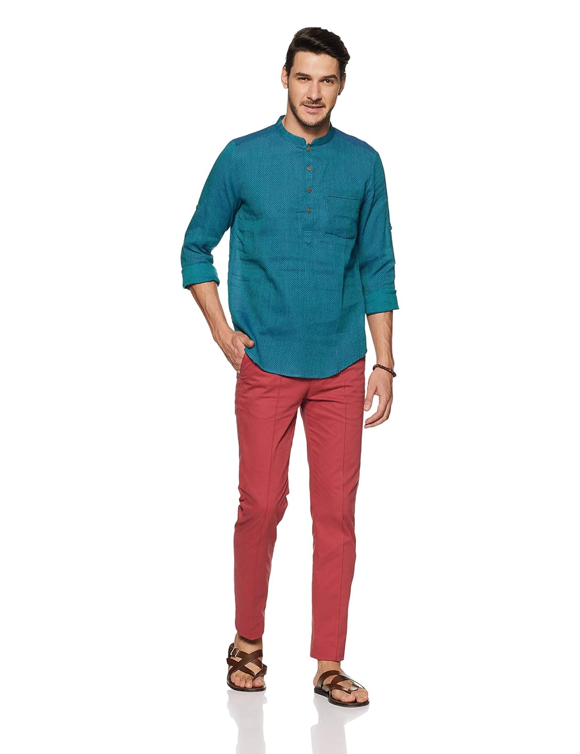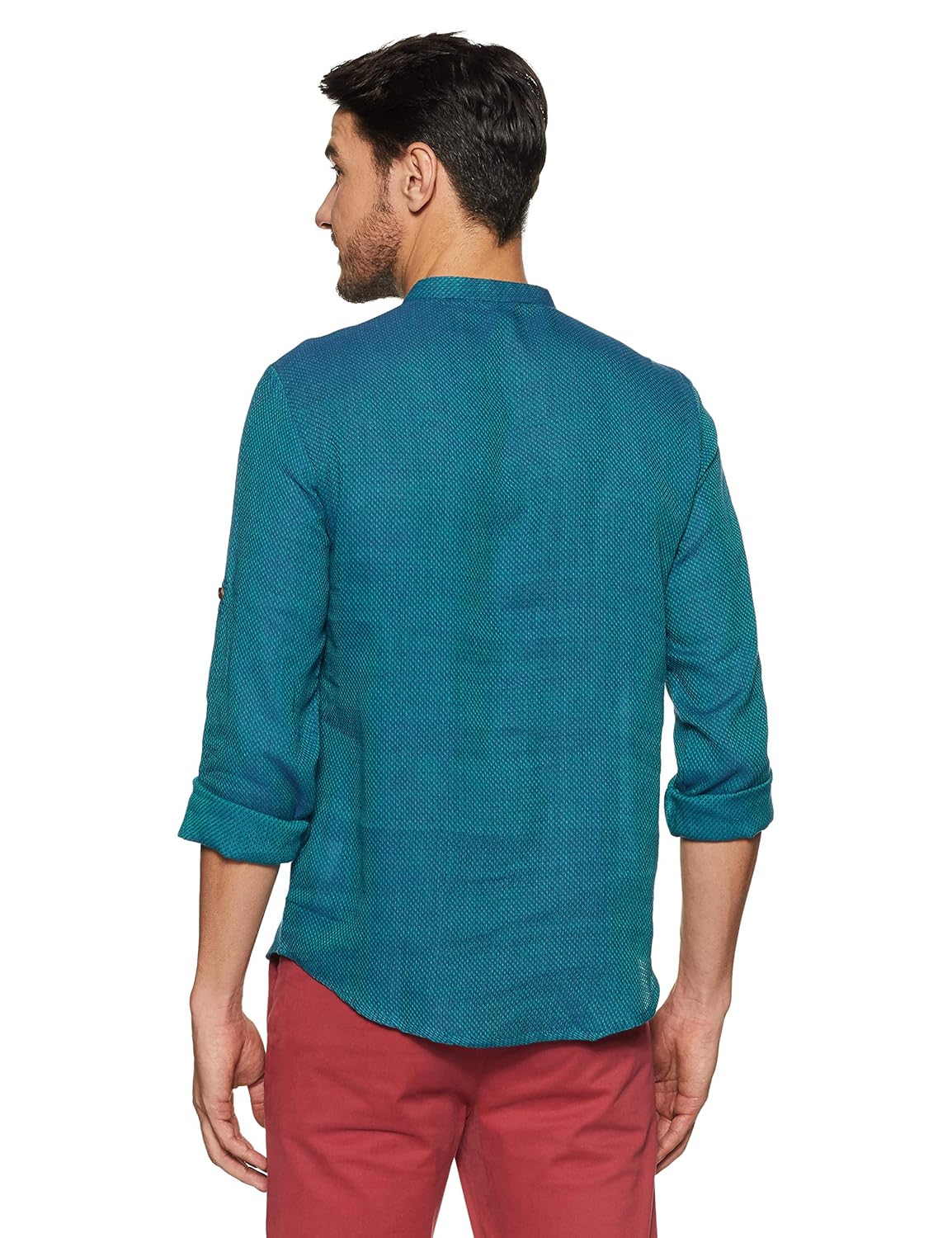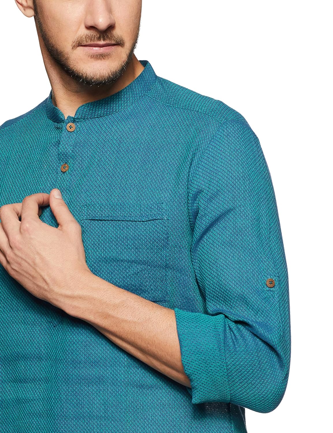 Turquoise in colour, this kurta is made of cotton. this slim-fit kurta features self pattern, band collar, full sleeves and a single chest pocket. |