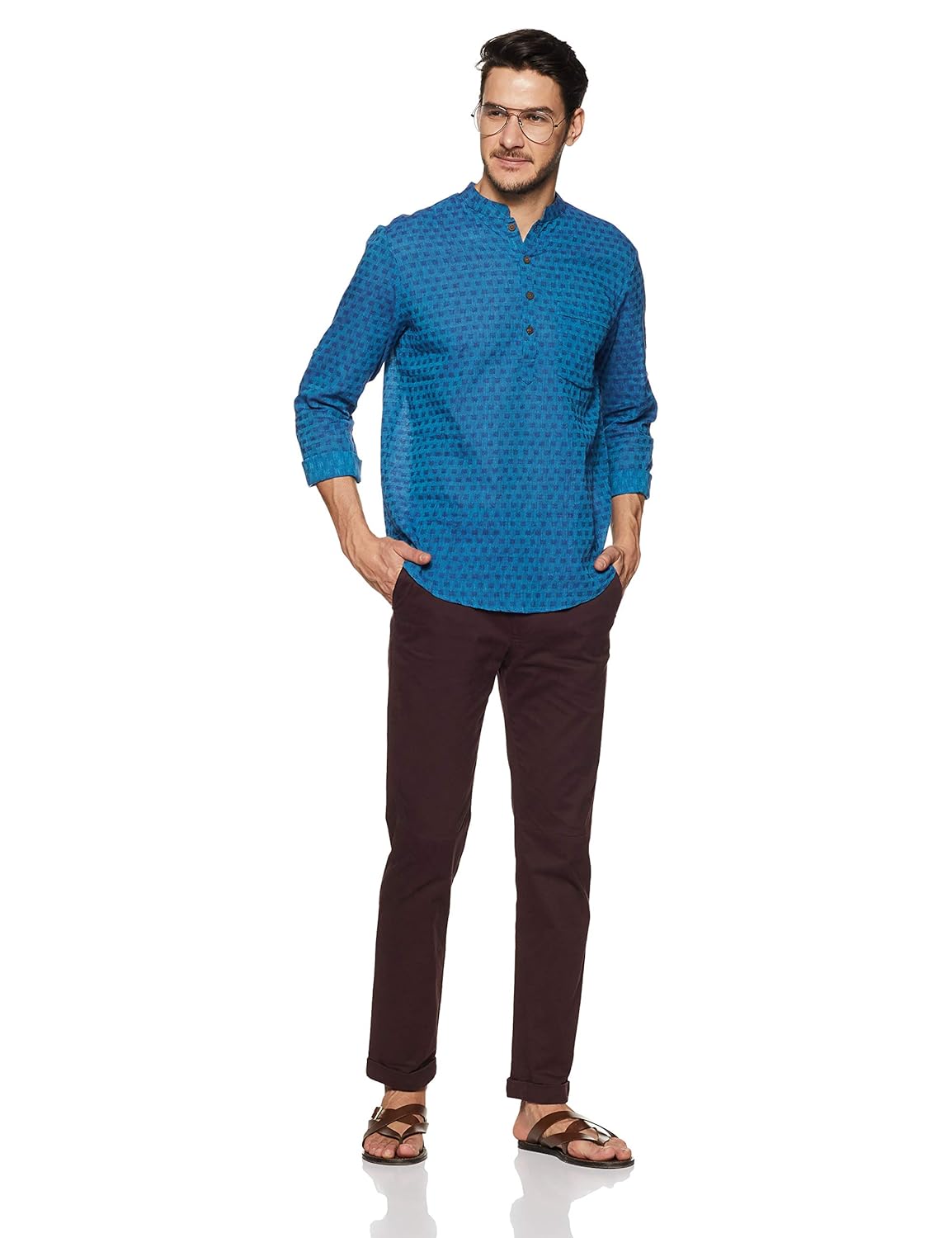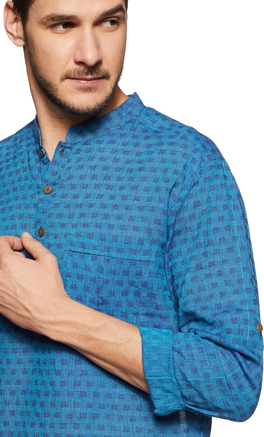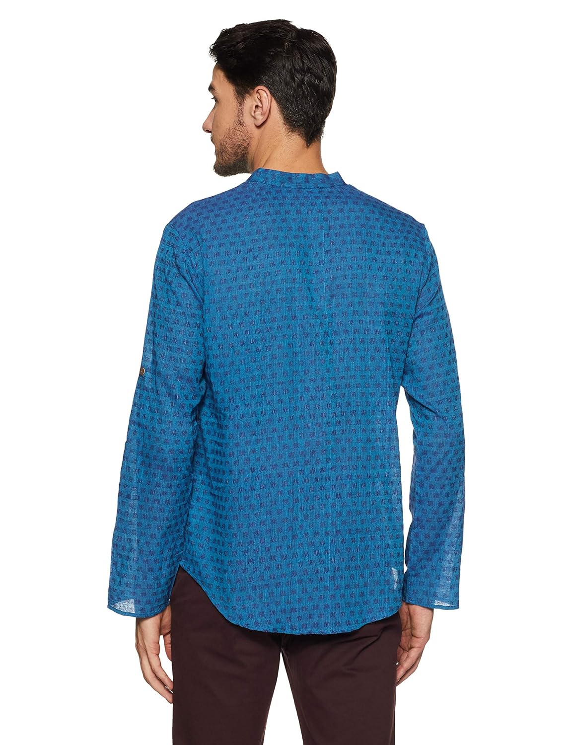 Blue in colour, this kurta is made of cotton. this slim-fit kurta features contrasting print all over, band collar, roll-up sleeves and a single chest pocket. |
