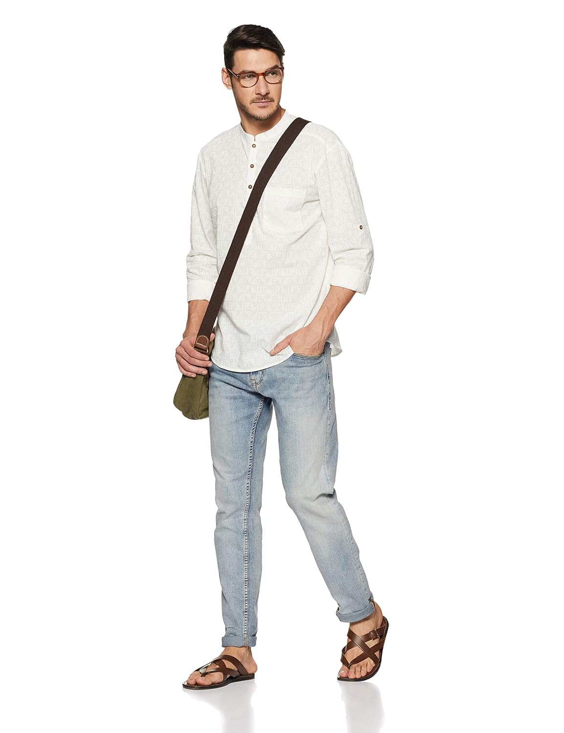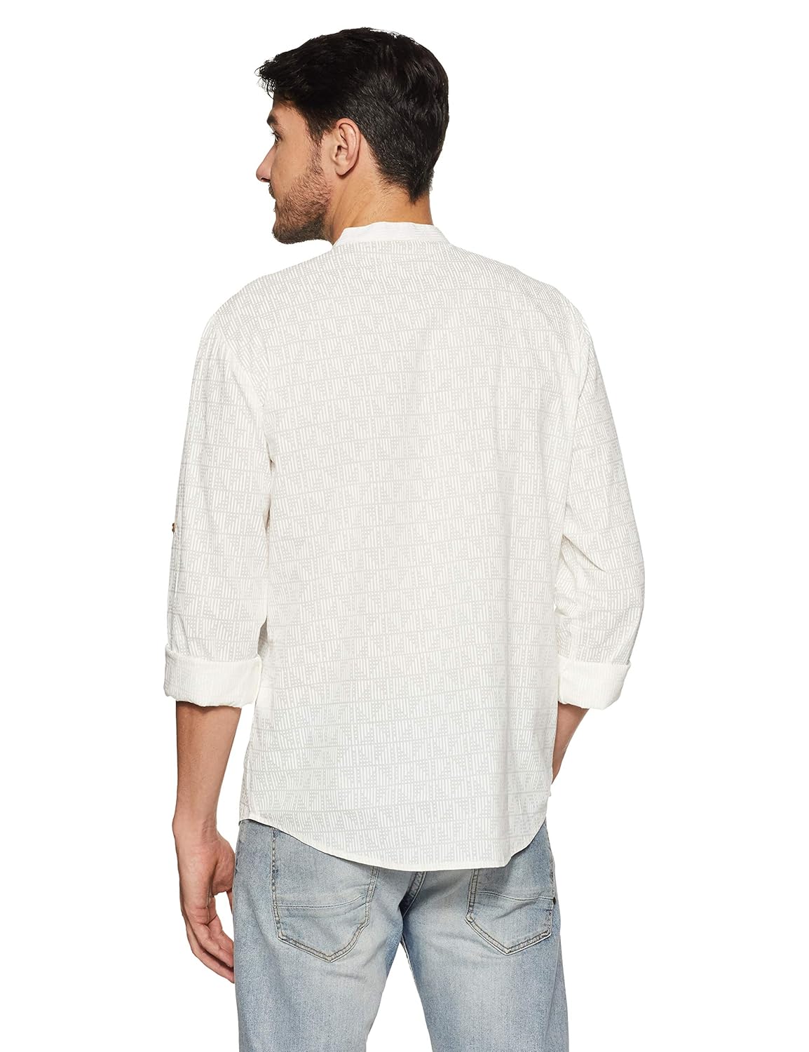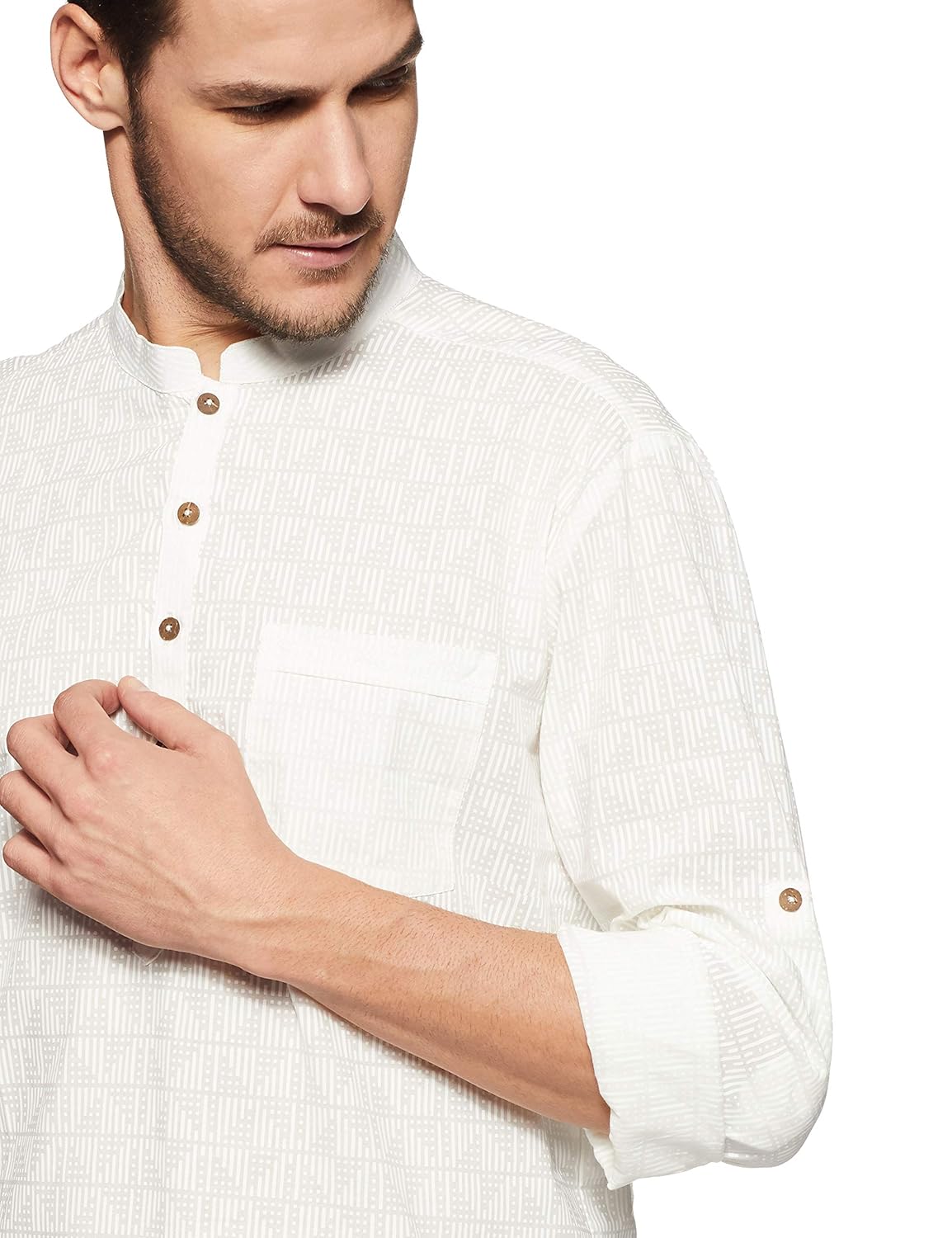 Off-white in colour, this kurta is made of cotton. this slim-fit kurta features self pattern all over, band collar, full sleeves and a single chest pocket. |