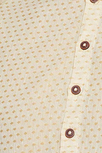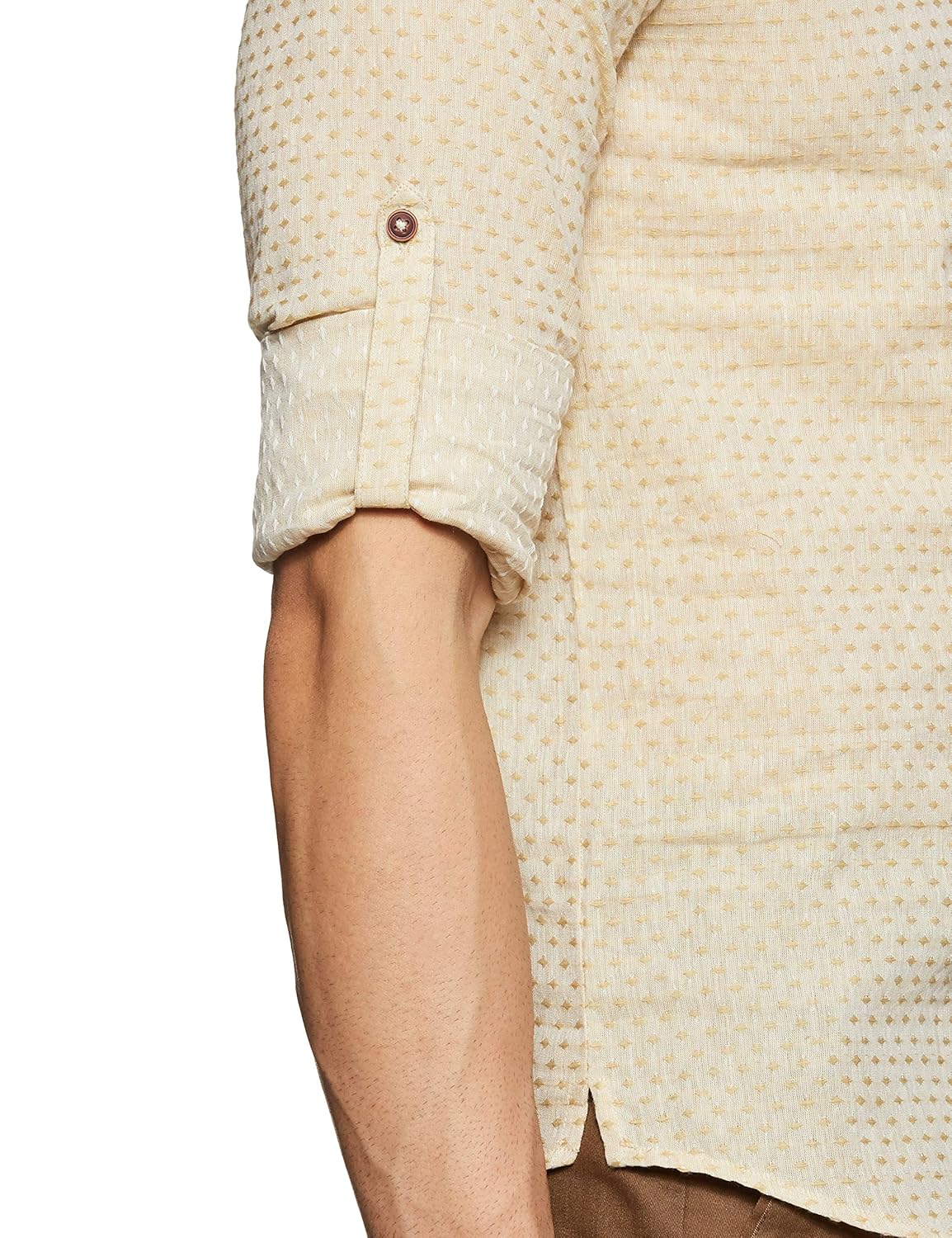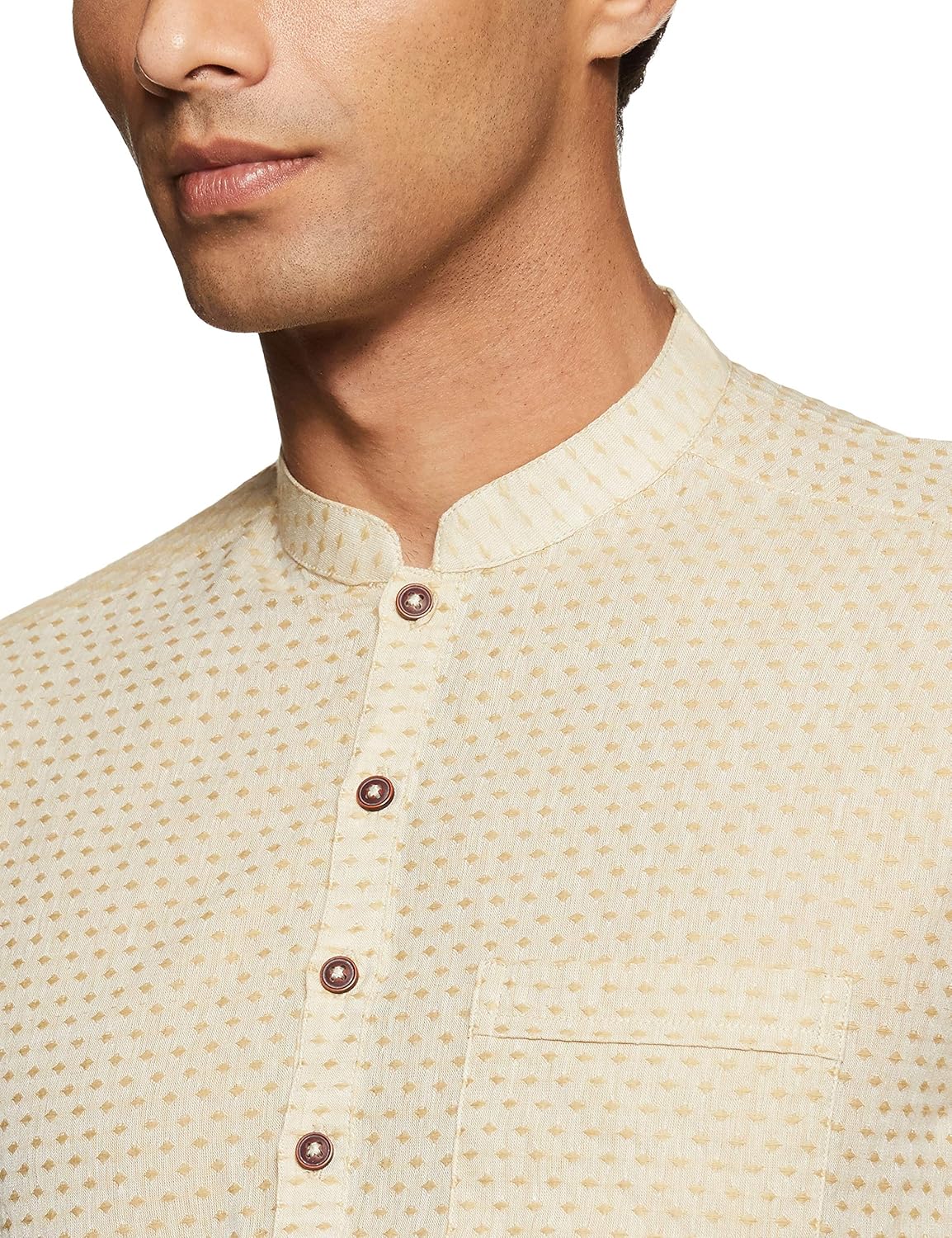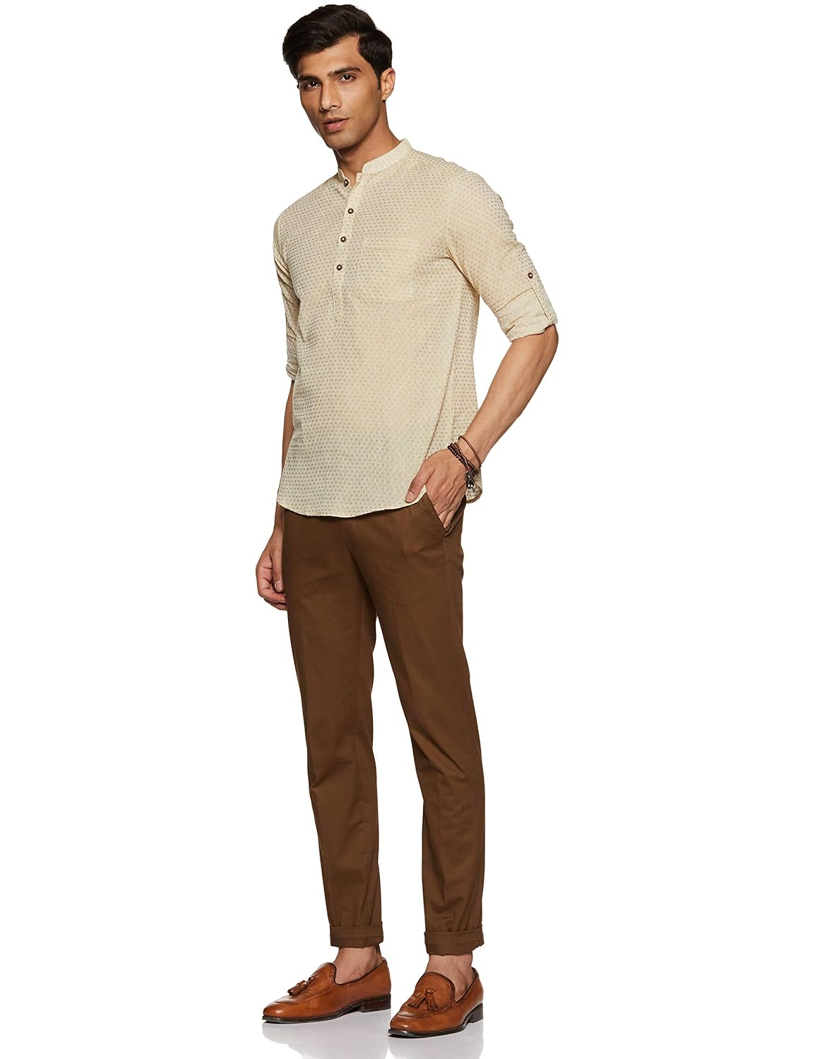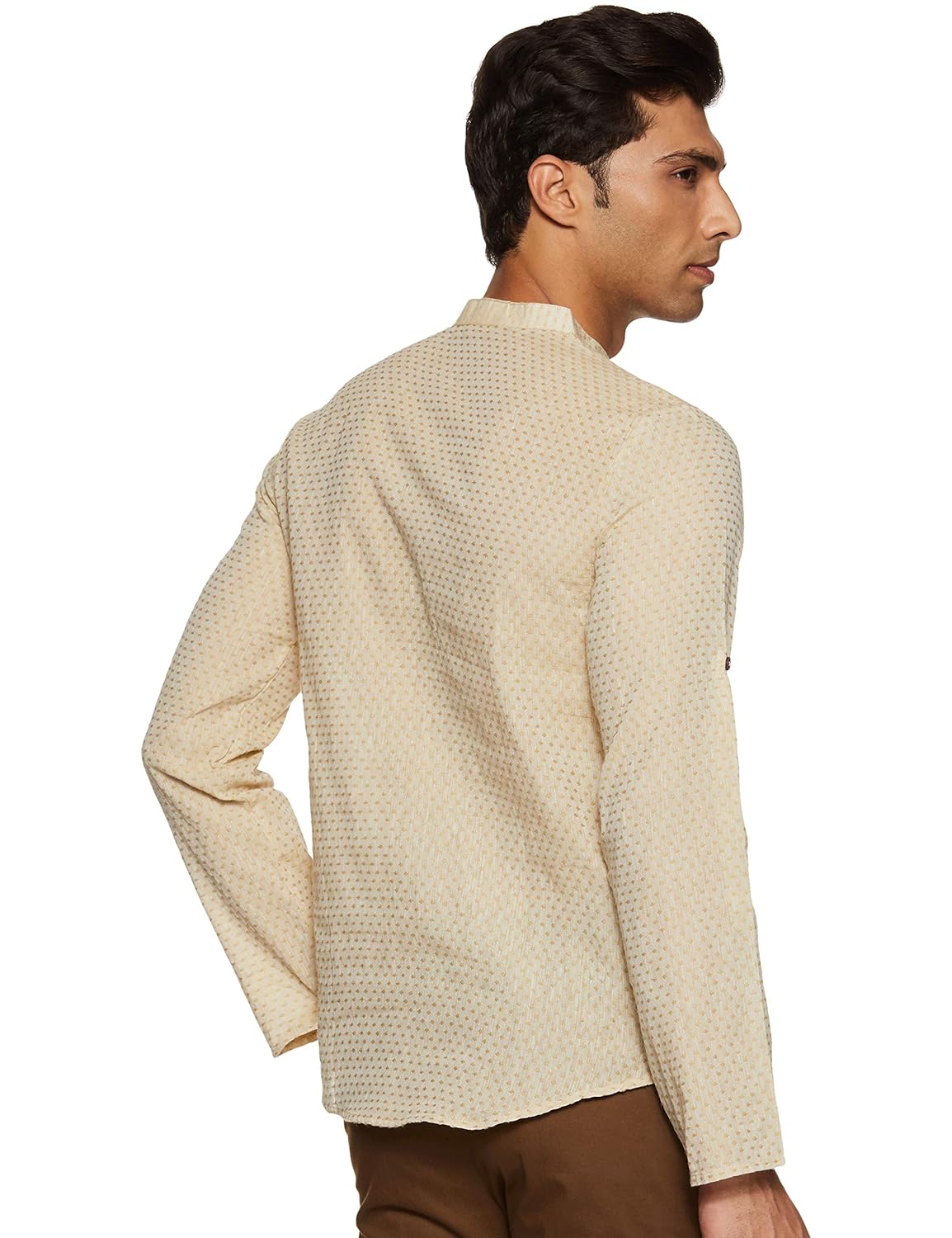 Beige colored self-designed kurta, featuring full sleeves, short length, round neck band collar with three button placketing and regular fit pattern. made from cotton fabric for maximum breathability. |