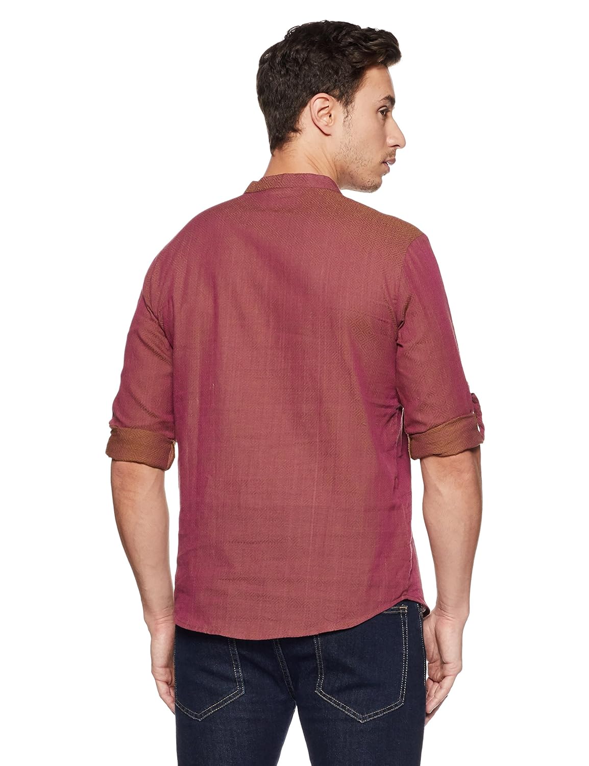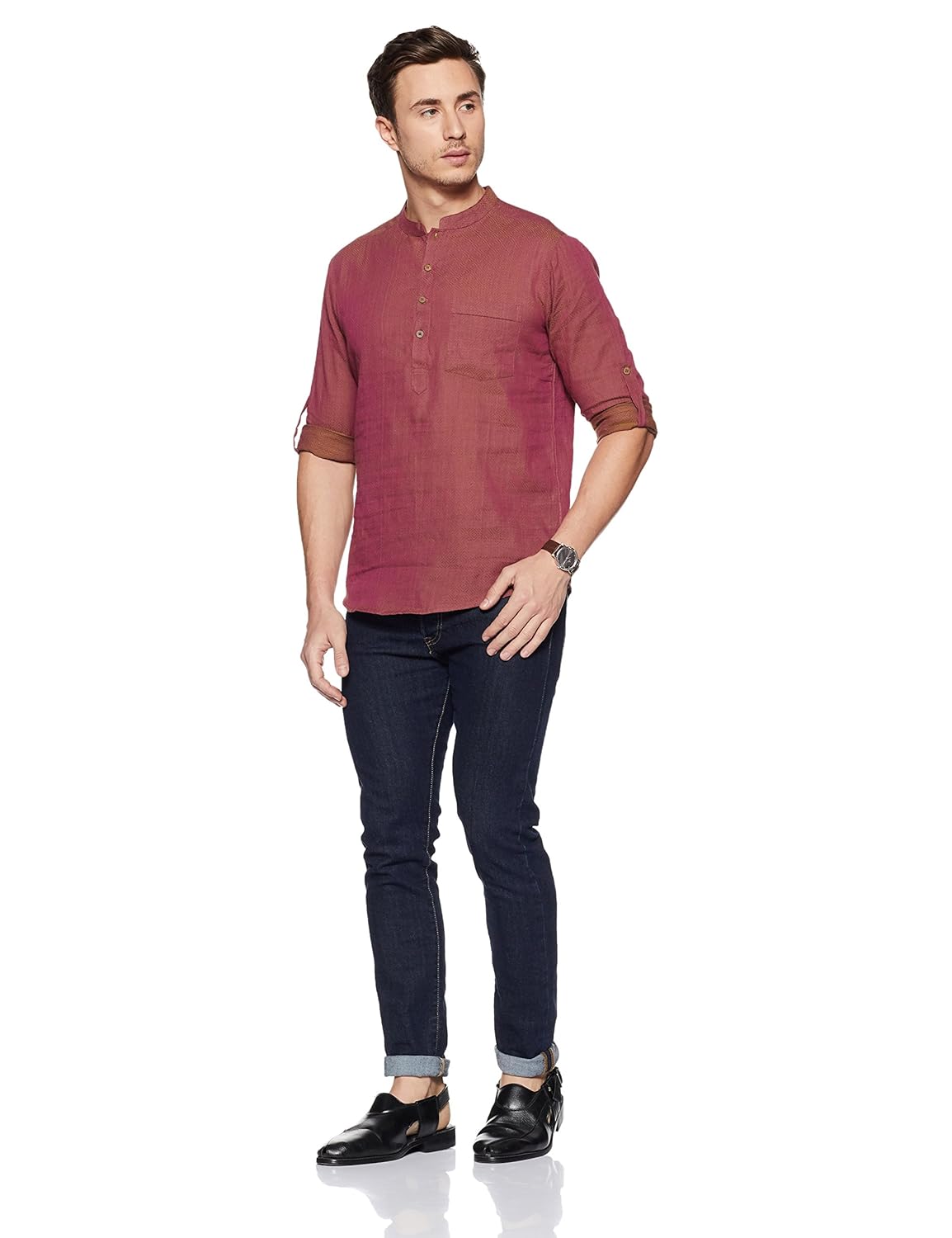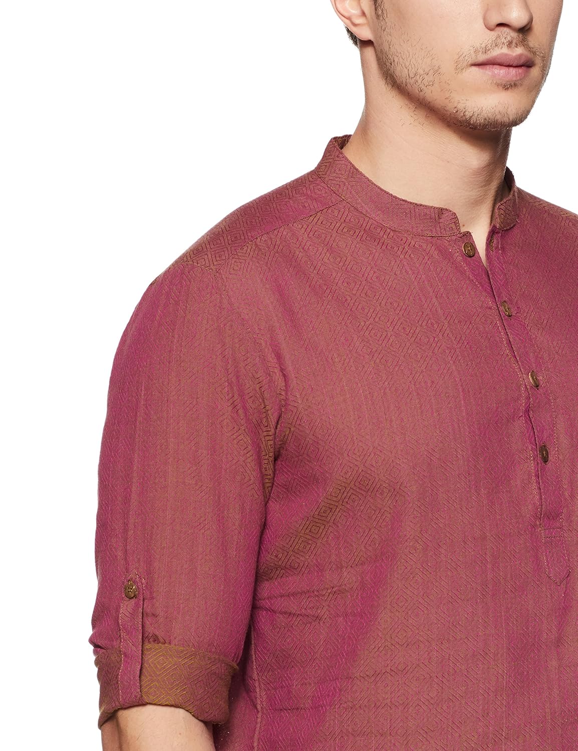 Pink self-pattern, short kurta in slim fit with a mandarin collar, button placket and patch pocket on the left. Made of cotton, it features interesting square motifs allover and full sleeves with tab-button styling. |