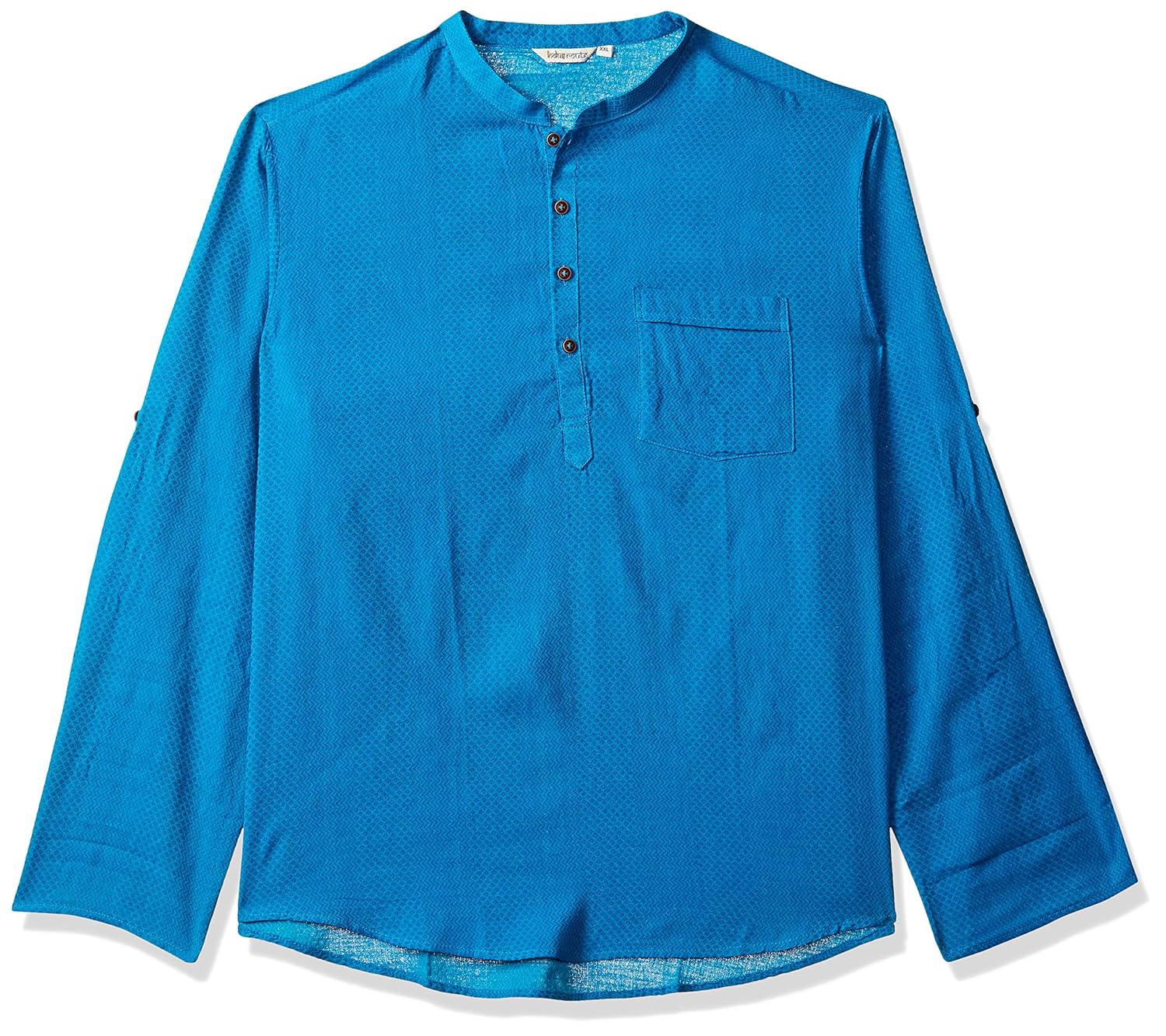 Blue colored self designed kurta, featuring full sleeves, round neck band collar and slim fit pattern. made from cotton fabric for maximum comfort and style. |
