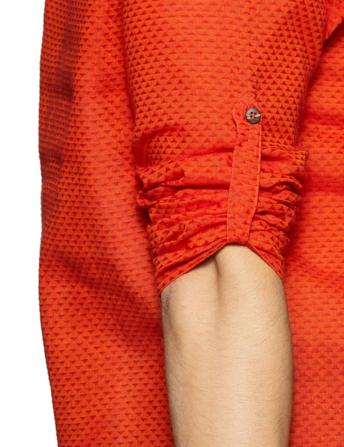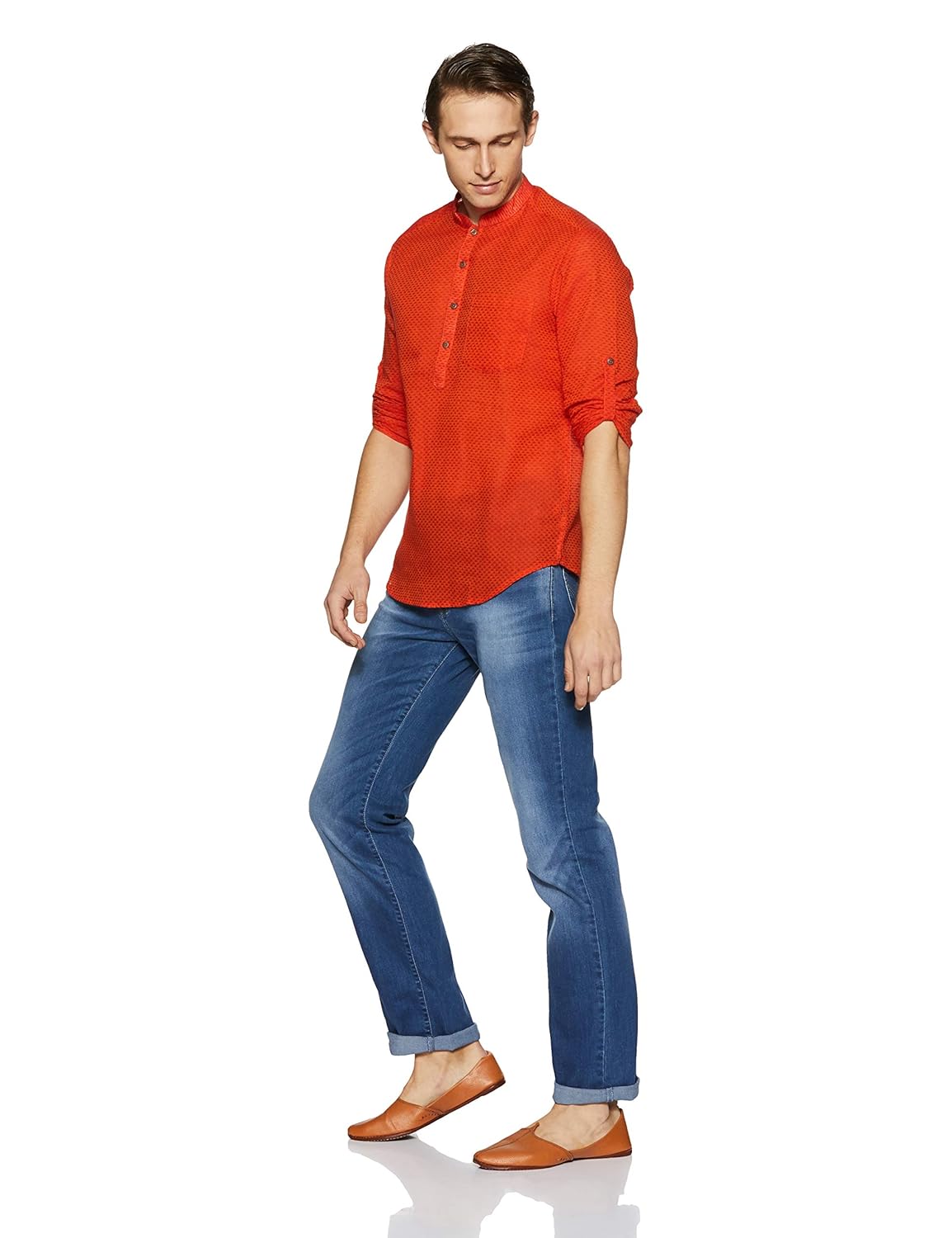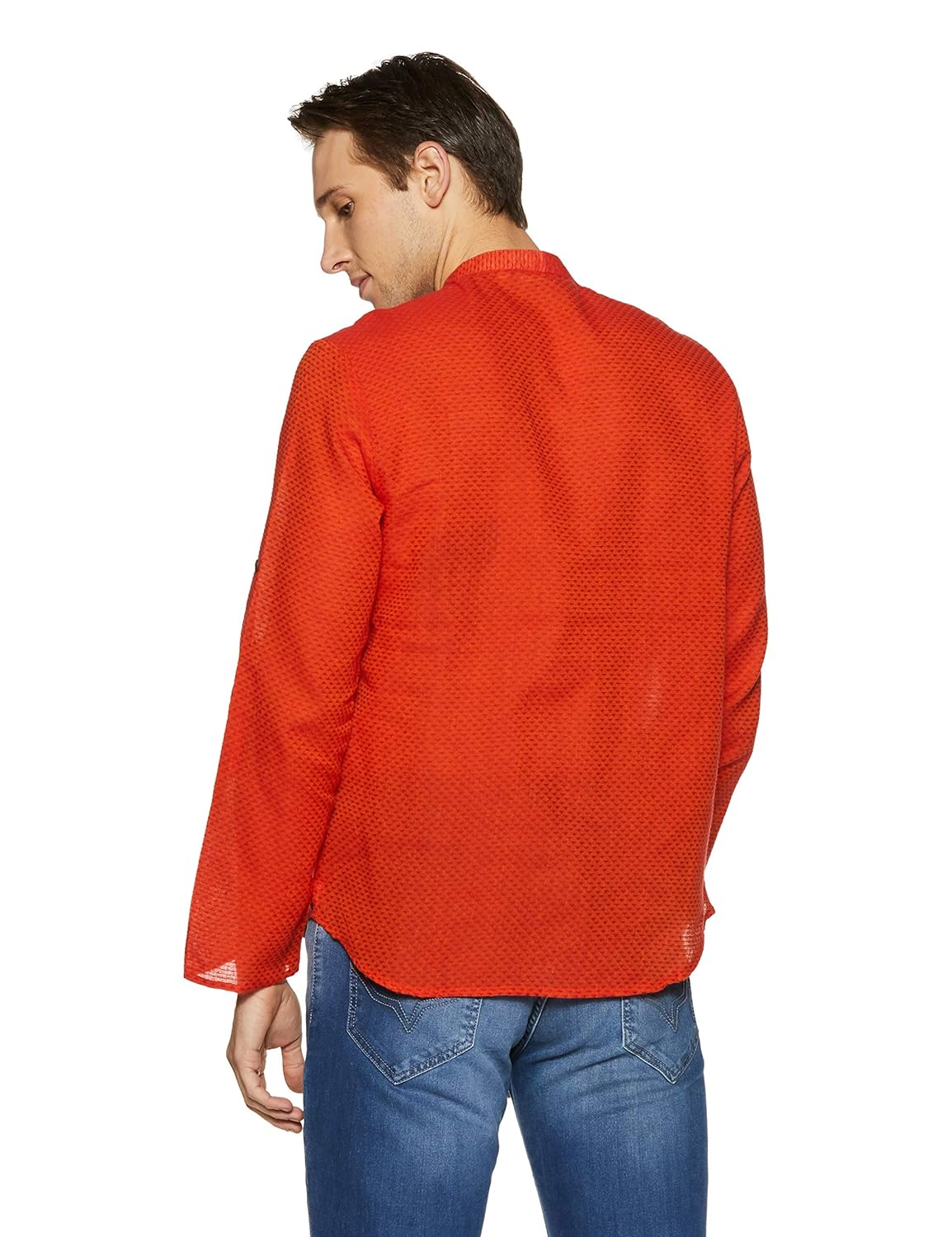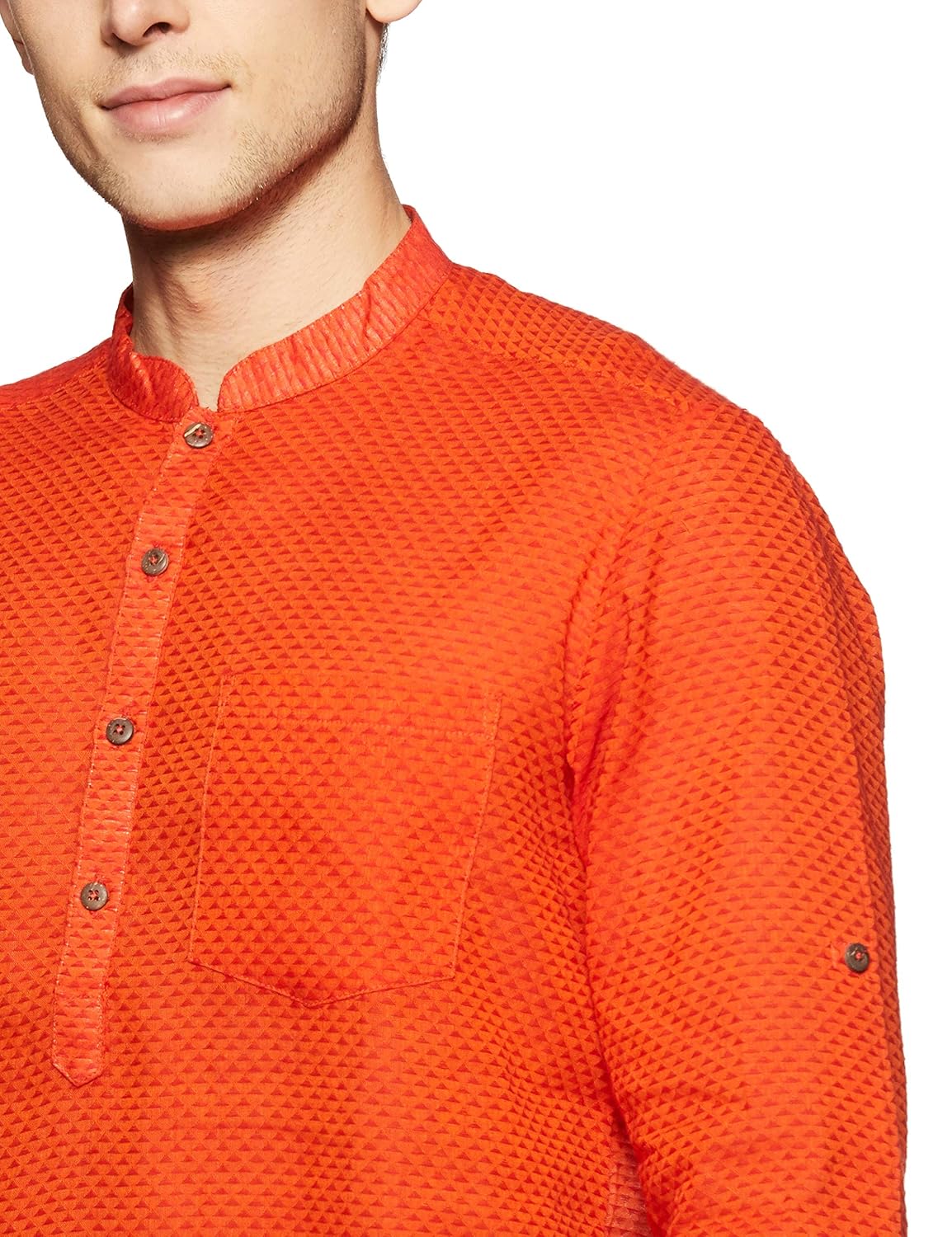 Rust coloured self designed kurta, featuring full sleeves, mandarin collar and regular fit pattern. Made from superior quality fabric for maximum comfort. |