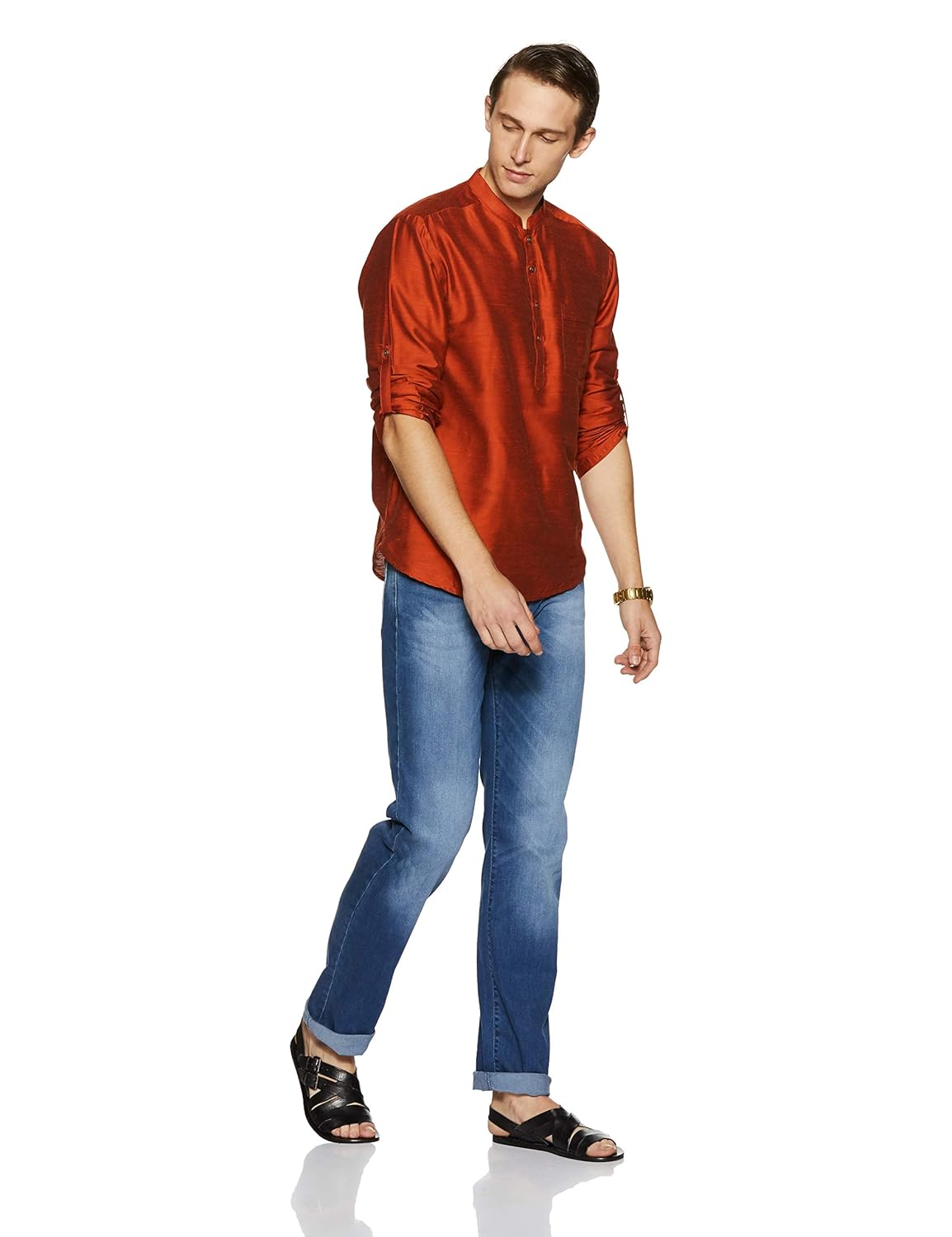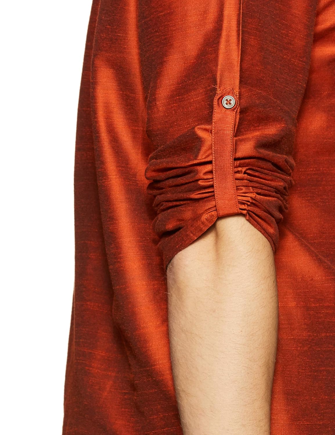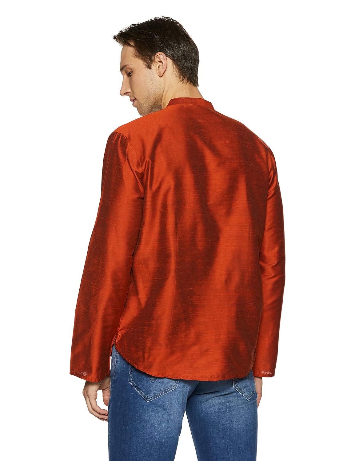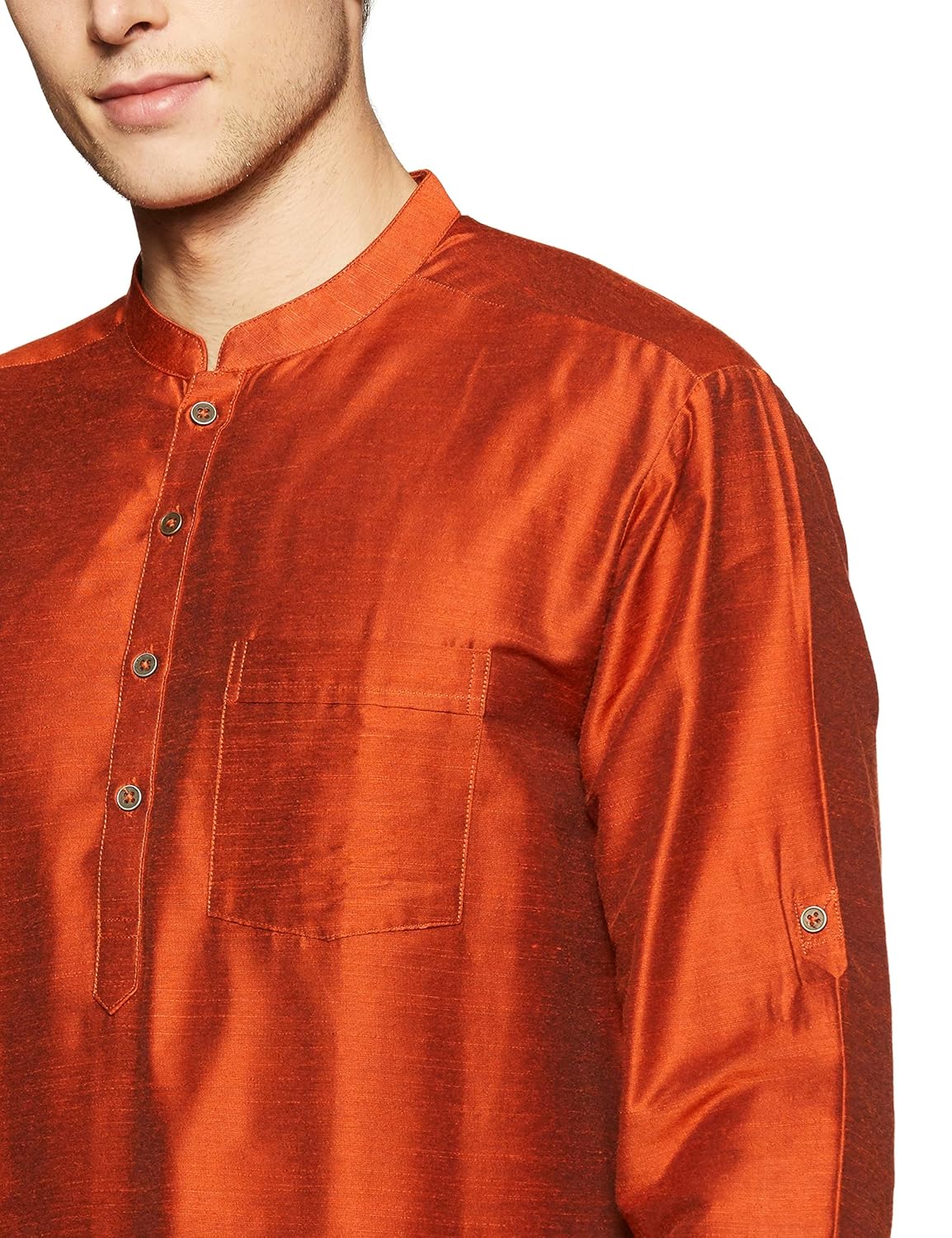 Rust coloured solid kurta, featuring full sleeves, band collar and regular fit pattern. Made from superior quality fabric for maximum comfort. |