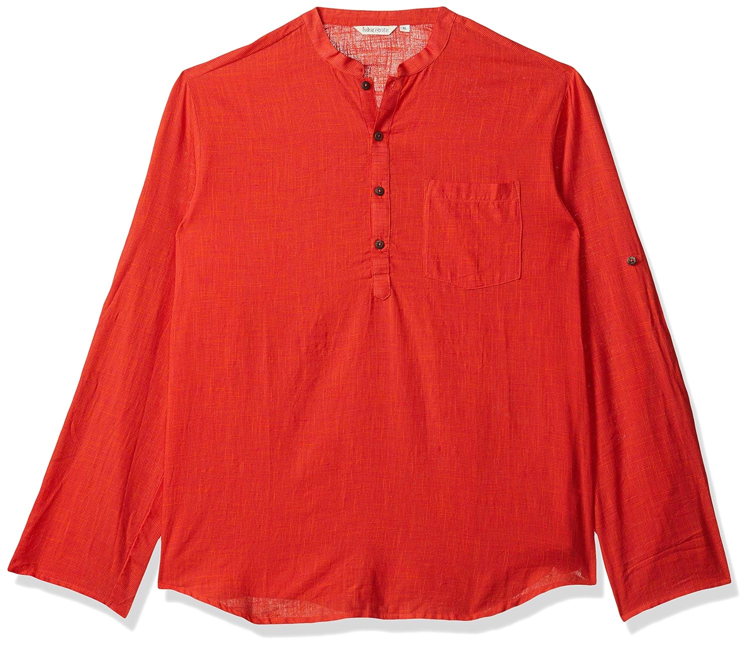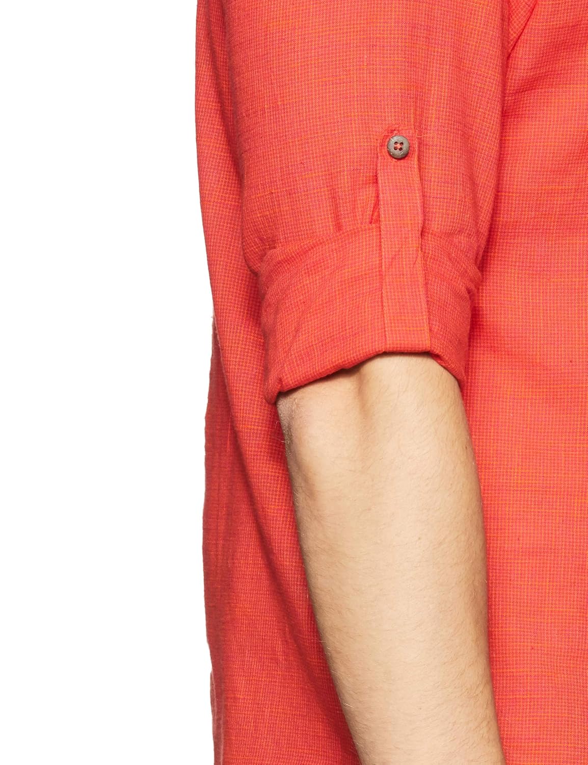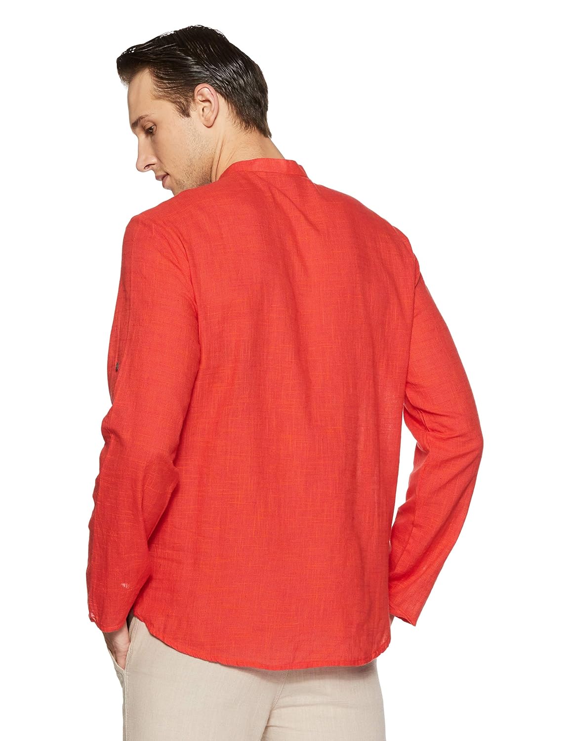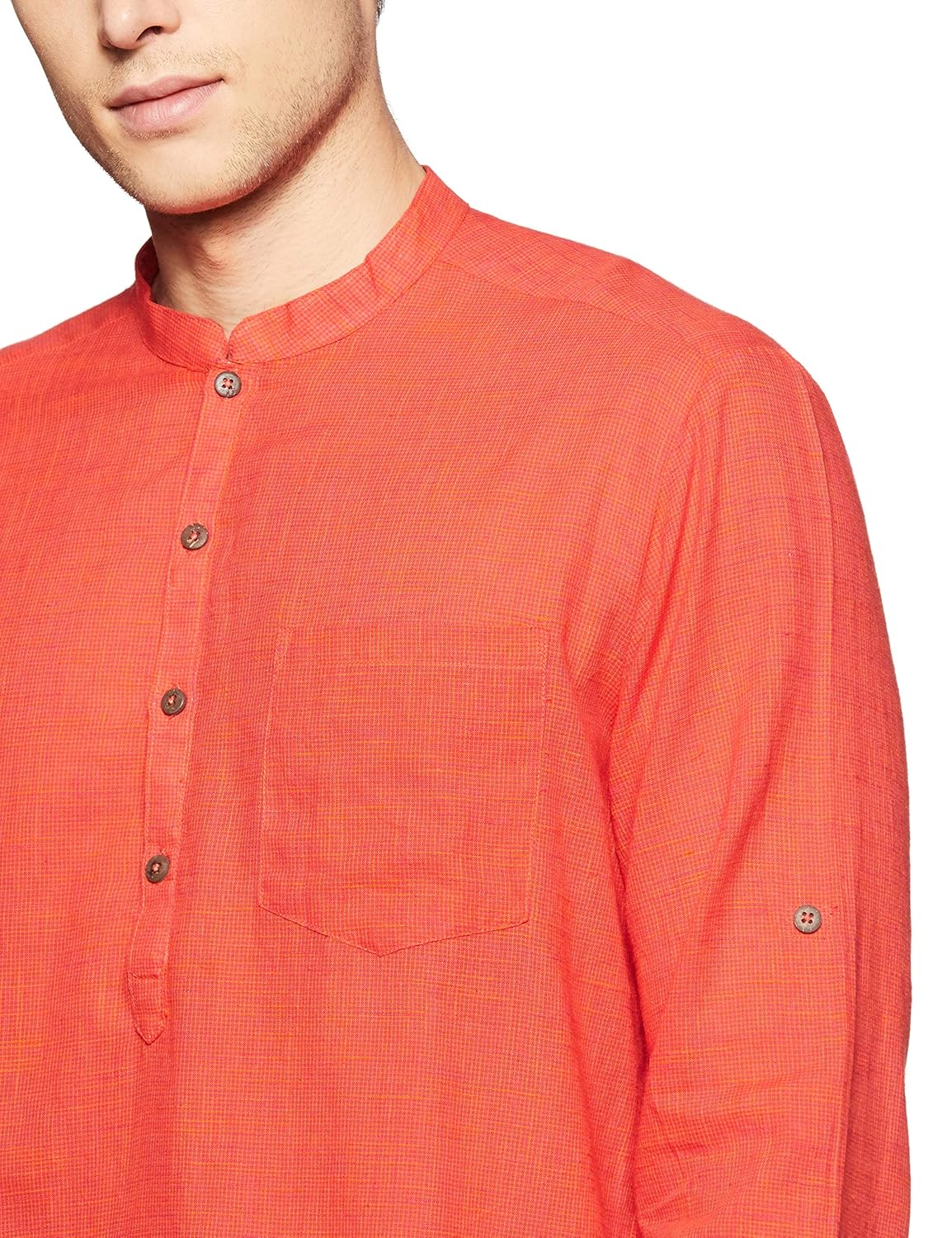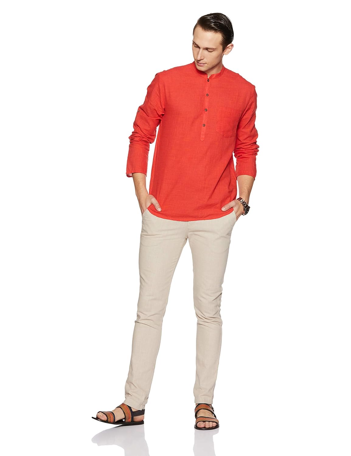 Rust coloured solid kurta, featuring a regular fit, short length, mandarin collar and full sleeves. It is crafted from a premium quality fabric. |