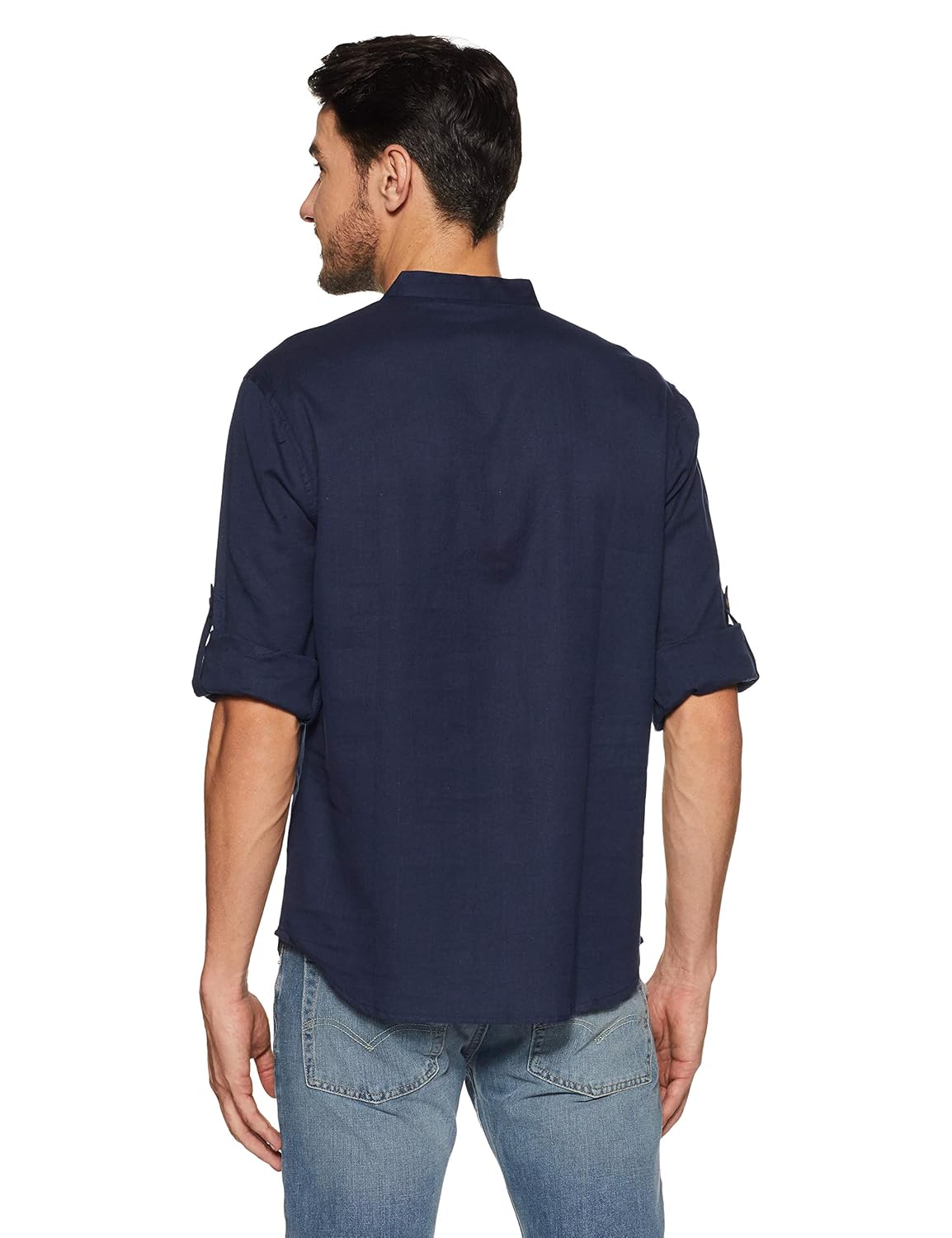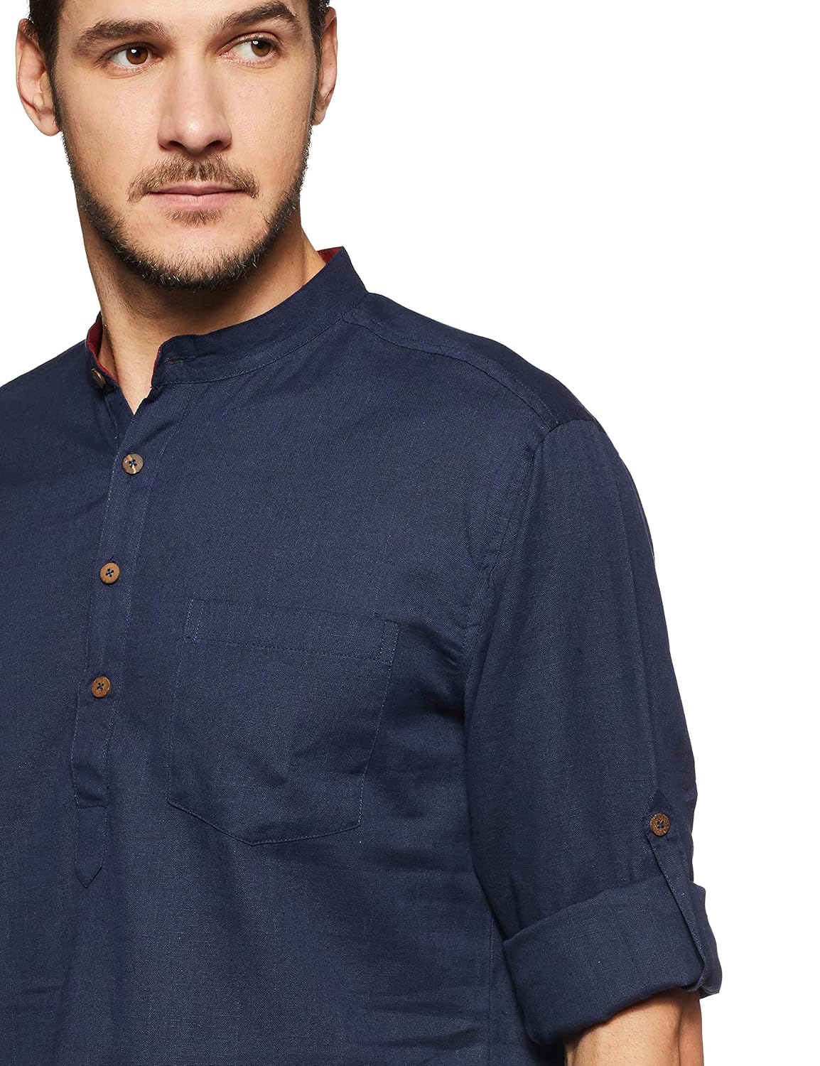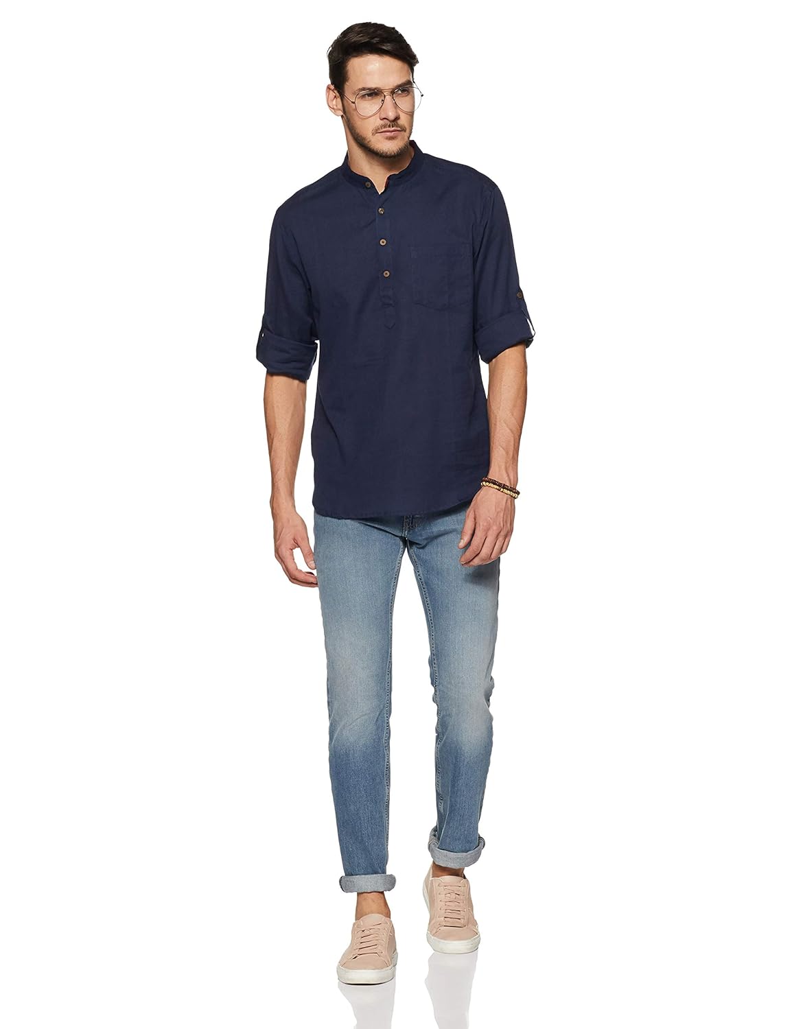 Indigo short kurta featuring solid design, full sleeves and a mandarin collar. curved hem, 4-button placket on the front, patch pocket on the left chest, regular fit, flex fabric. |