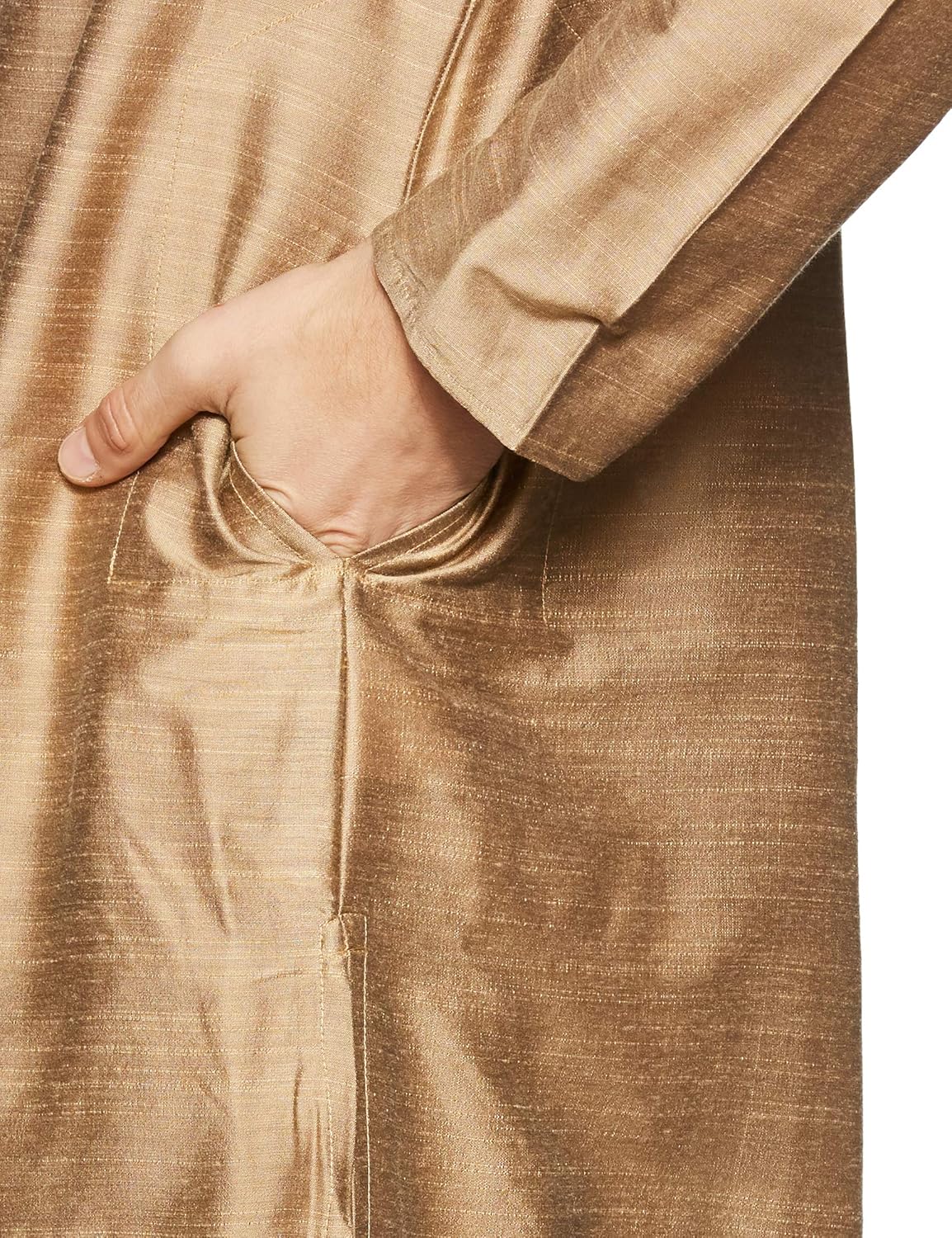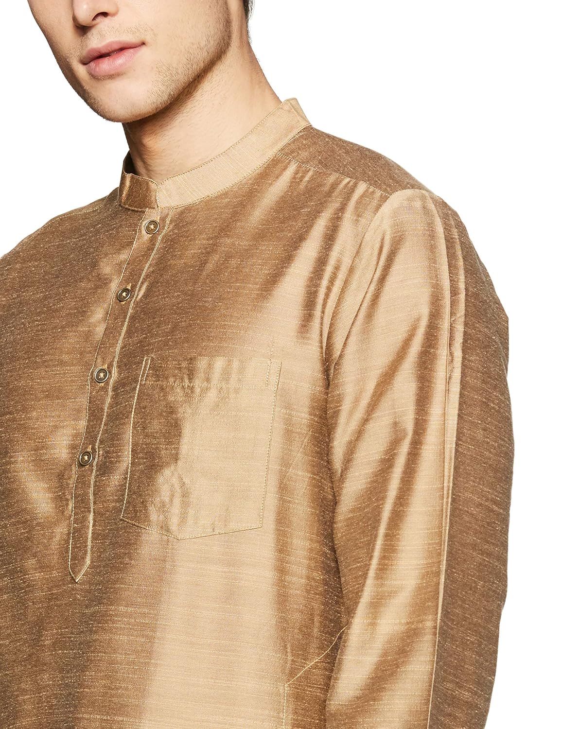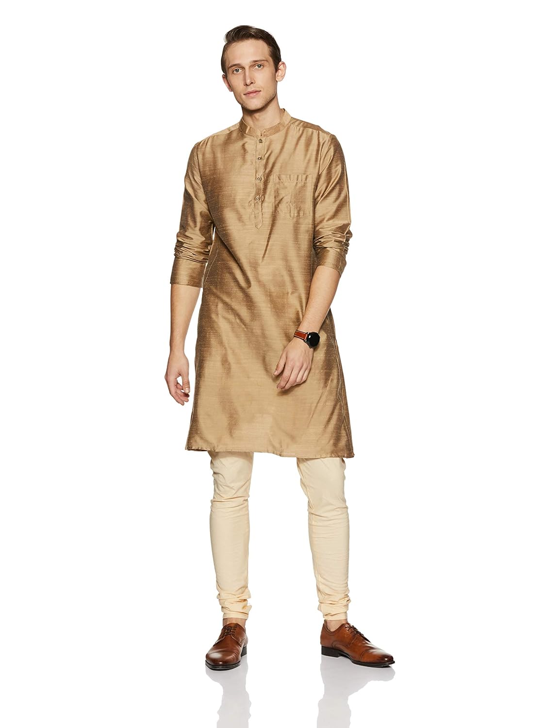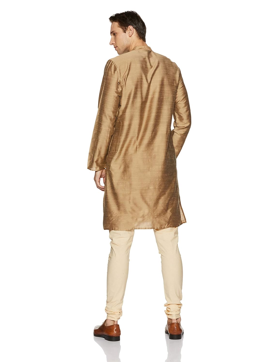 Gold coloured solid kurta, featuring a regular fit, knee length, mandarin collar and full sleeves. It is crafted from a premium quality fabric. |