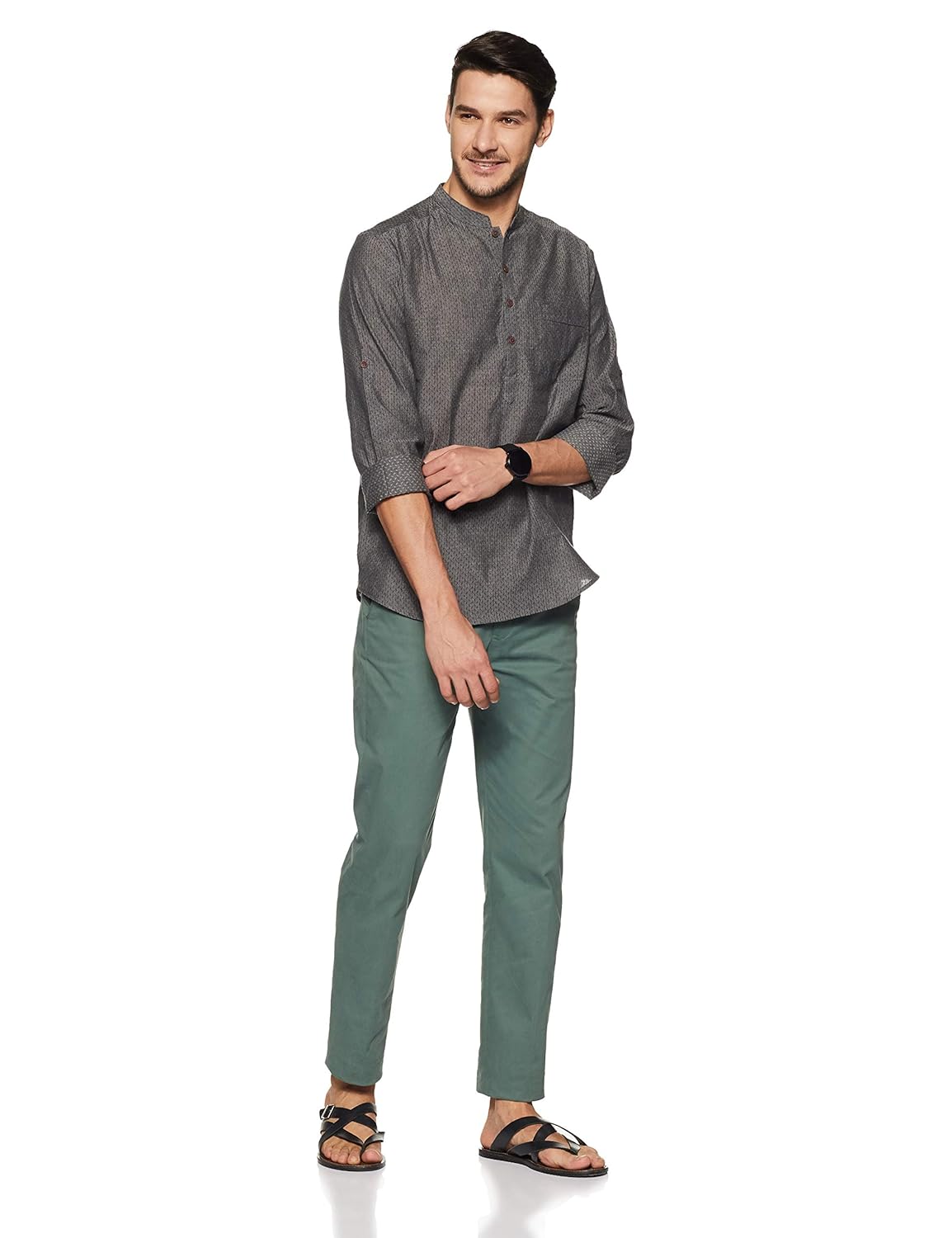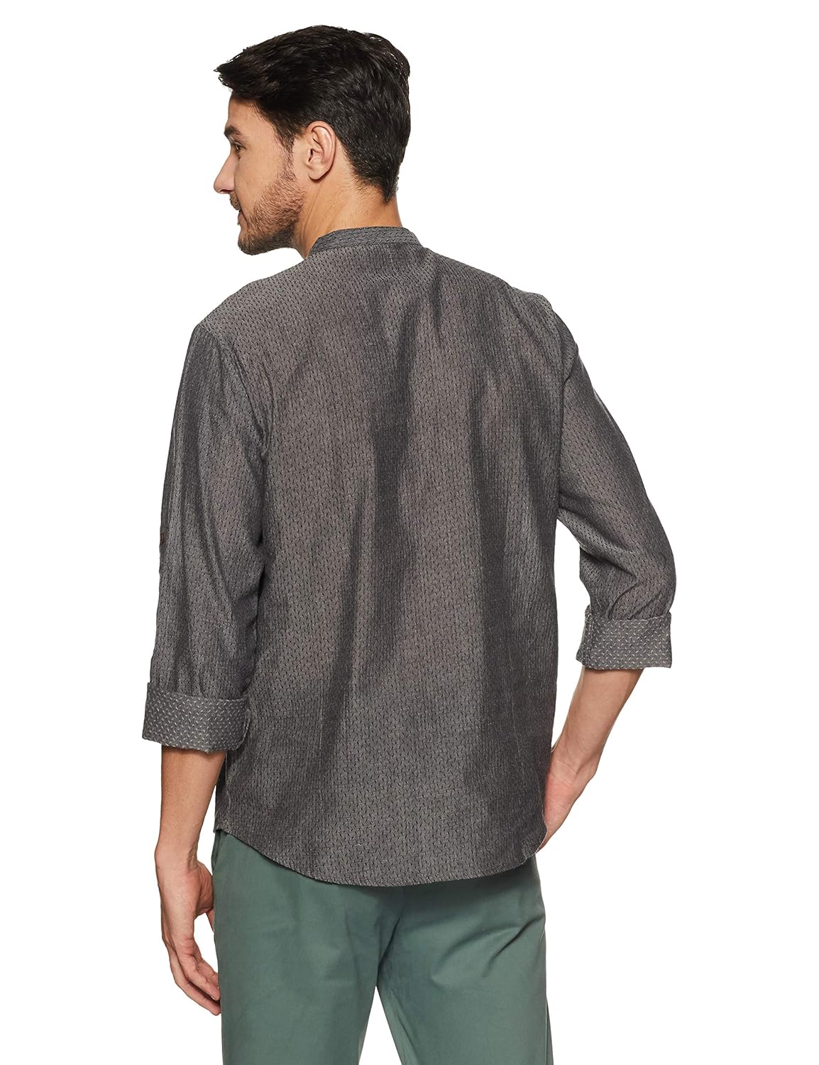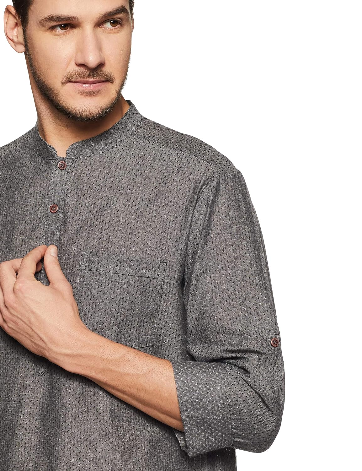 Charcoal in color, this casual kurta is crafted in a slim-fit from cotton. it features full sleeves, a band collar and all-over self design. |