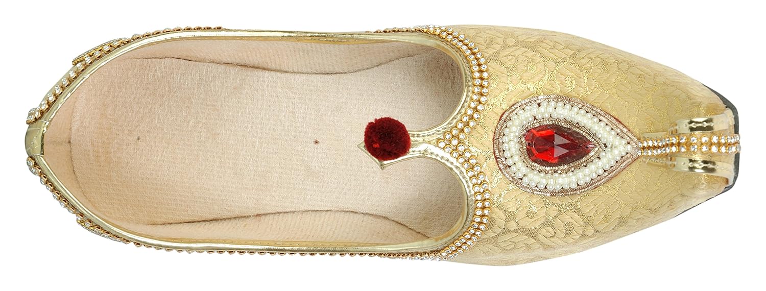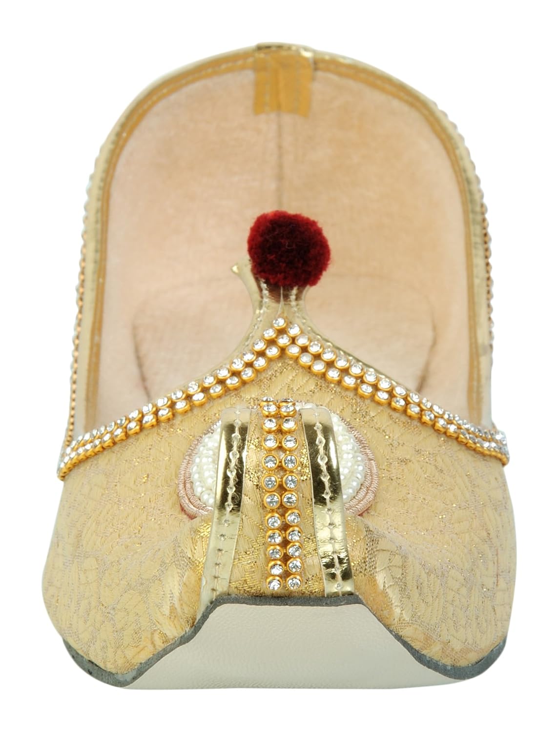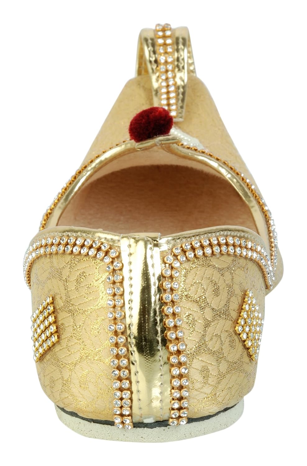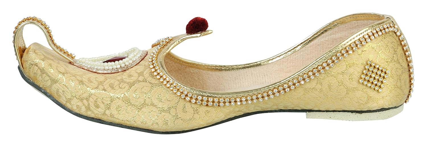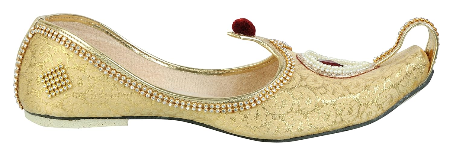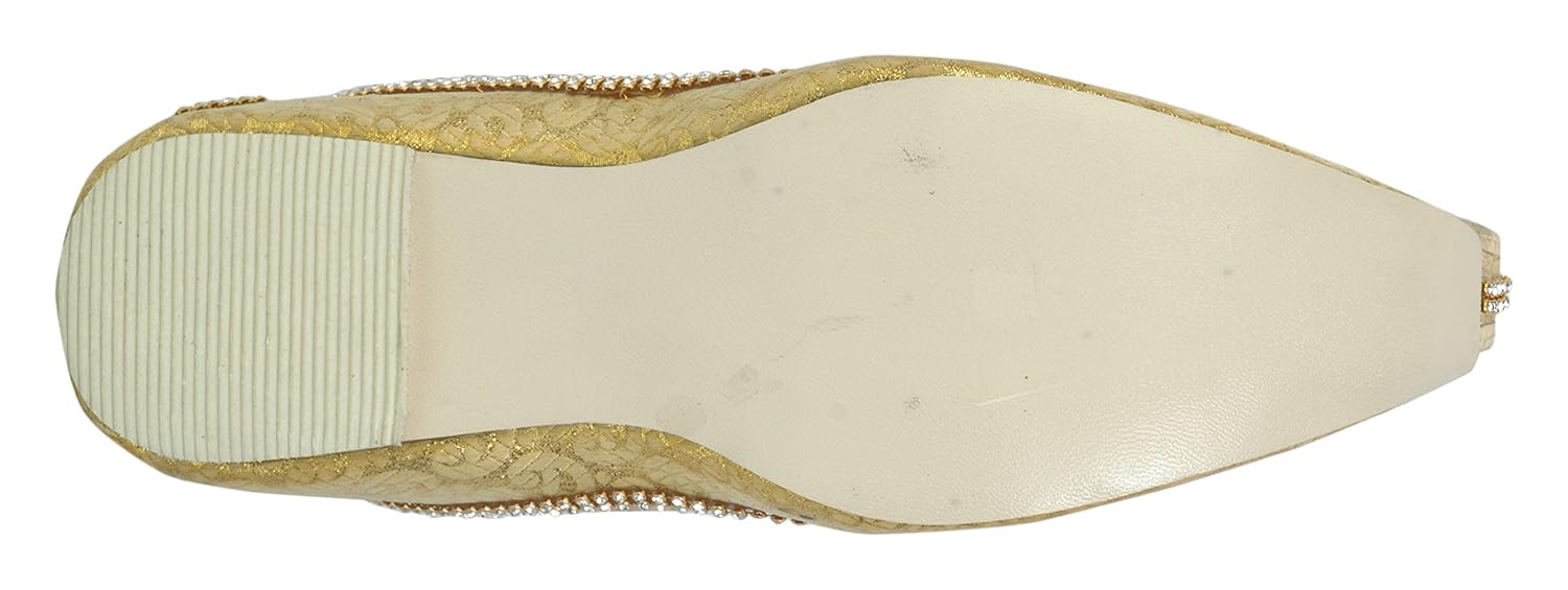 This product is made from synthetic material on the inside and outside and is finished in an attractive gold color. It features rubber sole, slip on closure, and are designed to be used as traditional wear footwear. Furthermore, it is recommended to be kept away from extreme heat and corrosive liquids to avoid damage. |