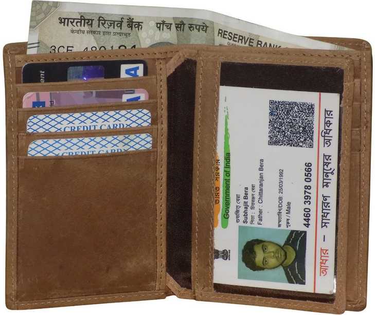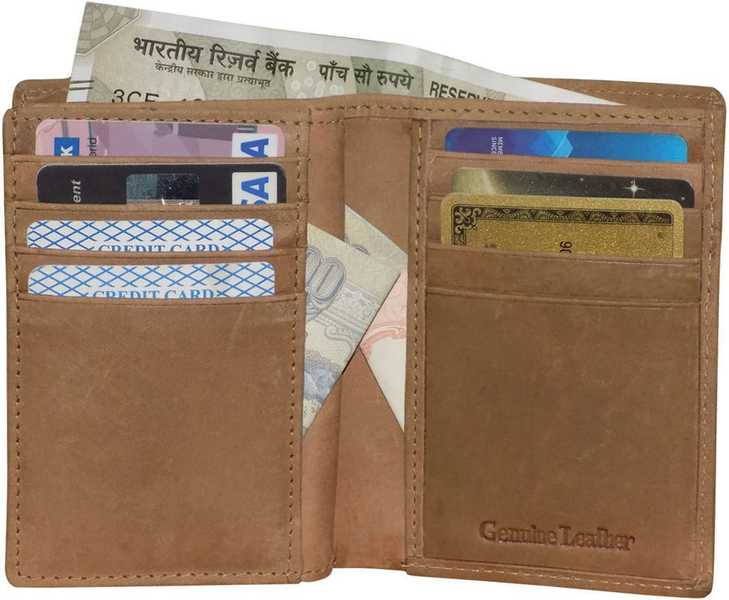 Kan presents Tan Bi-fold Hunter Leather Wrist Wallet. This wallet has 3 main compartments with a separator sleeve. The left fold has 4 card slots. The right fold has 4 card slots, also 4 Card slots and 1 Id slot on Sepatator Sleeve. This product has 2 hidden pockets . This wallet is ideal for men and boys.