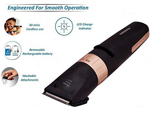Km-6166 washable trimmer is the perfect trimmer for every man. A must have in men's grooming kit, it has an ergonomic shaped body which makes it easy to hold and use. It comes with led indicator charging dock and takes only 720 mins for charging. With stainless steel blade, the trimmer cuts your beard, moustache and side-burns with precision, leaving your face smooth. It has variable cutting length which means it can cut your beard hair of any length. Trimming becomes easier with the adjustable cutting settings. Comes with stylish stand mount and completely water proof which makes it more easier to clean and look a premium class. |