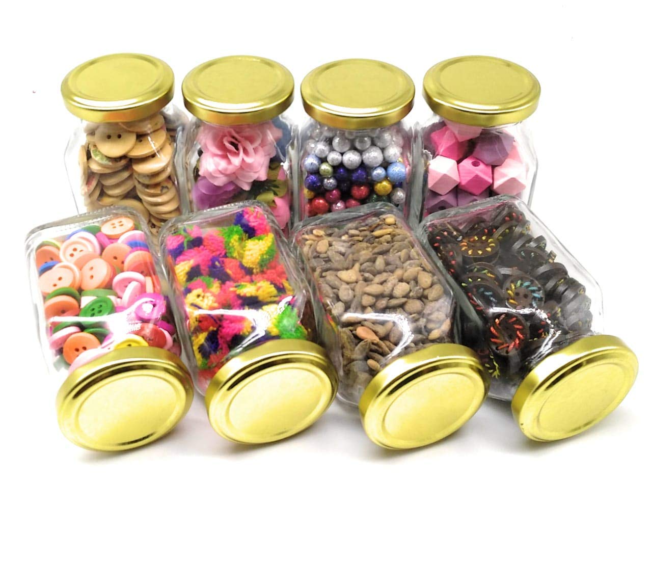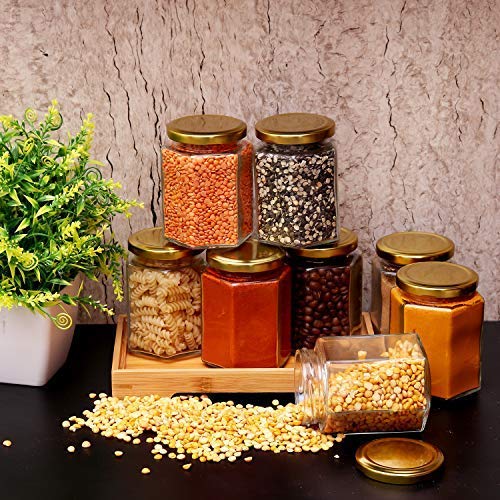 King International Hexagon Glass Jar and Container(250 ml) with Rust Proof Air Tight Lid,Suitable to use in Your Home Office,Kitchen Storage/Glass Jars Set (8 Pcs)