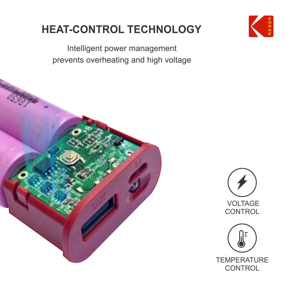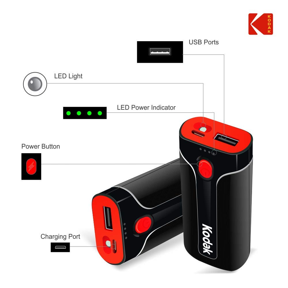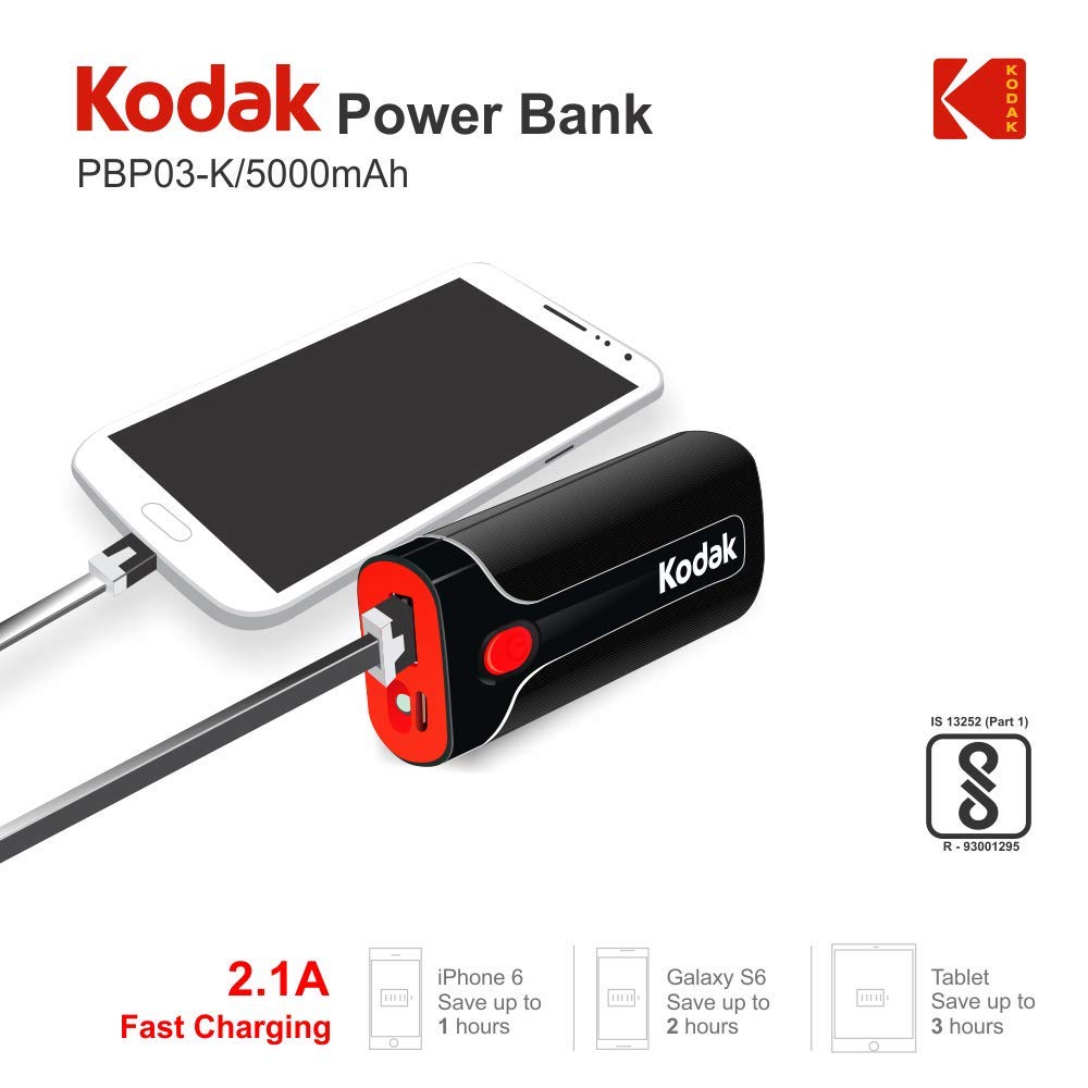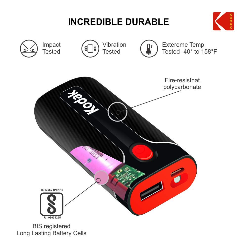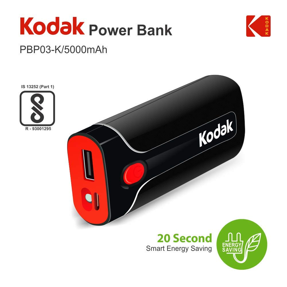 Designed for use with smart phones, Kodak power bank is a high capacity power pack that provides 100 percent extra talk time to most smart phones. Product is BIS registered Product warranty is 1 year as given, contact_us on: [ 18001039635 ] and service will be provided at 280+ service points ,which almost cover 9000 pin code across India 100 years Old USA most trusted consumer brand |