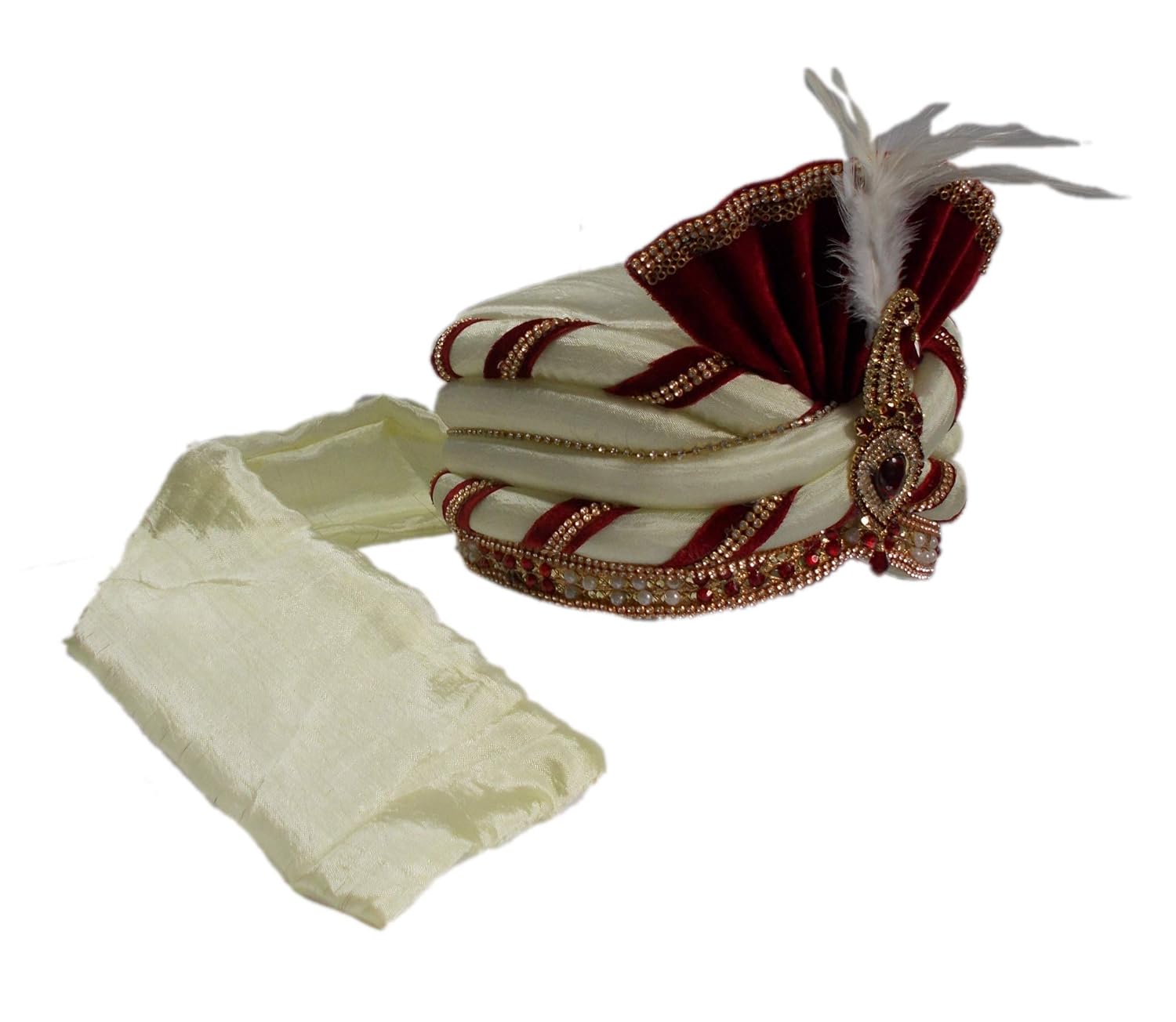 Krypmax presents this turban which is made of Ethnic silk and velvet Fabric material. This elegant turban adds a classic touch to your ensembles. It is suitable to wear on ceremonial occasion and best for your event and a great fit. It is completely handmade and beautifully crafted using best material and stitching is done with excellence. It comes with tail also. A royal Maharaja look for Indian Wedding Groom. |