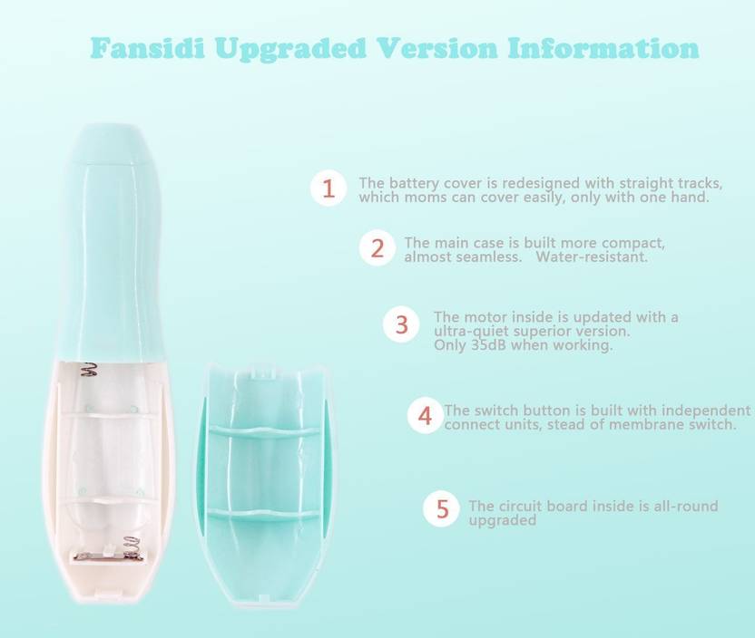 - 6 Different Detachable Heads, Safer baby nail file that won't damage cuticles or soft nail beds, you can safely and quickly trim and polish little toenails and fingernails, LED to Enhance The Light, Ergonomic design nail clippers for toddlers with curve shape and smooth surface for cozy holding, which is more convenient and preferable for parent’s using., Control speed (high/low) for different types of nail and rotation (clockwise/reverse) for enhancing the polishing effect, present smoother fingernails and toenails., Suitable for age 0 months + ,Safer baby and Mom nail file that won't damage cuticles or soft nail beds, you can safely and quickly trim and polish little toenails and fingernails