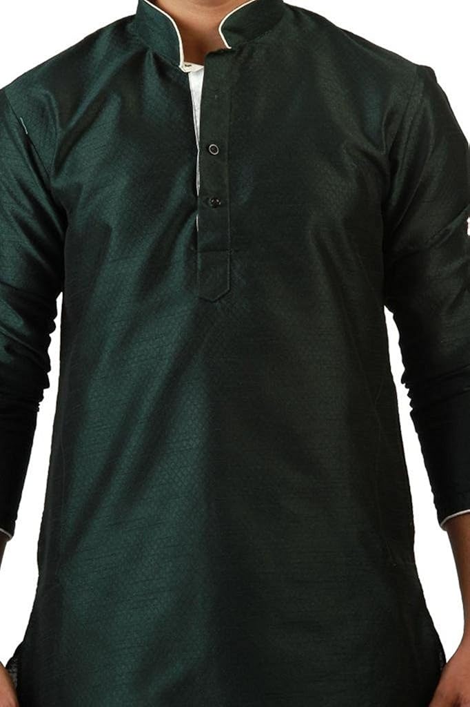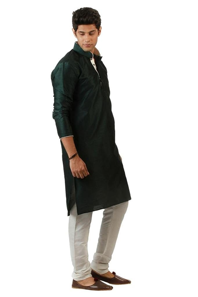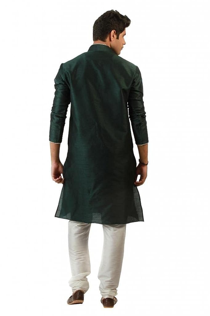 Look your ethnic best wearing this solid coloured kurta pyjama set for men from the fashion house of Larwa. Made from Banarasi Dupion, this regular-fit kurta pyjama set comprises a full-sleeved kurta and pyjama to complete your look. Team this outfit with embroidered mojris and rock the party that you attend. |