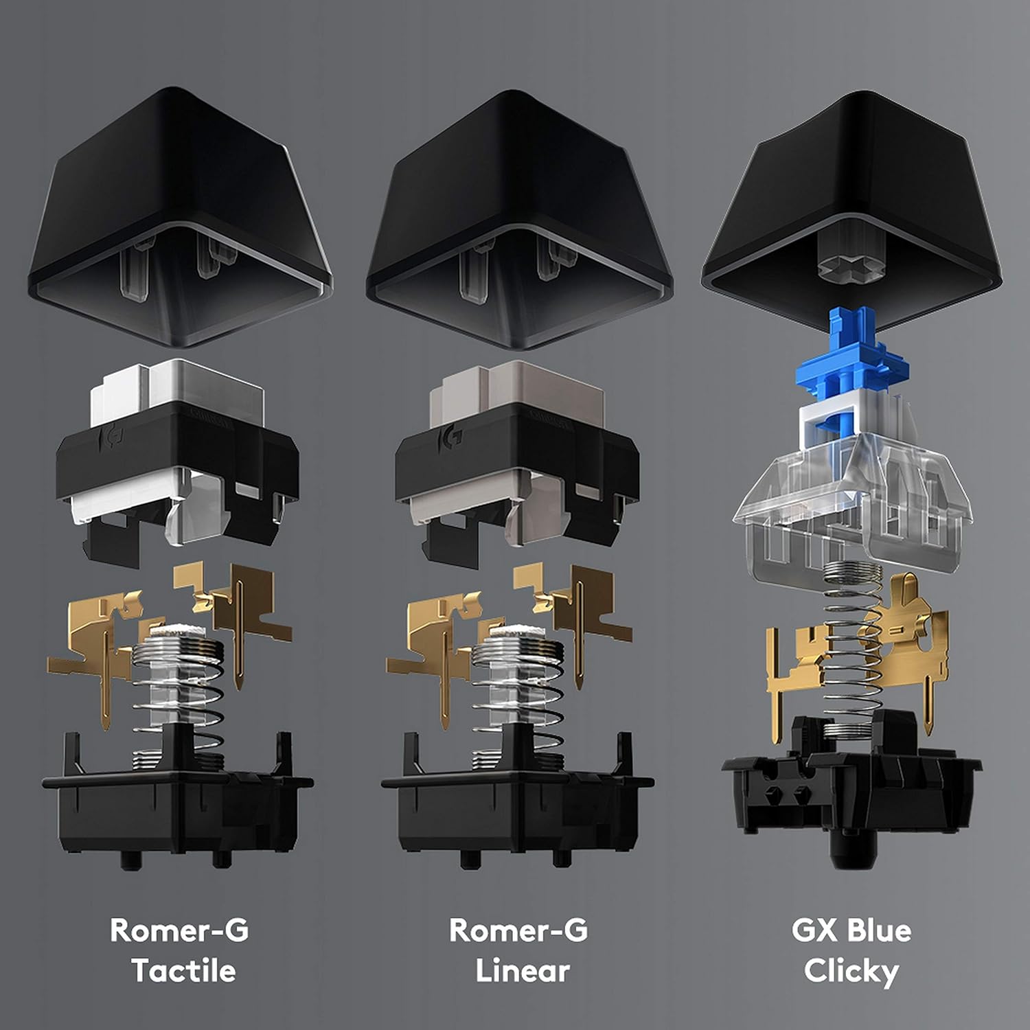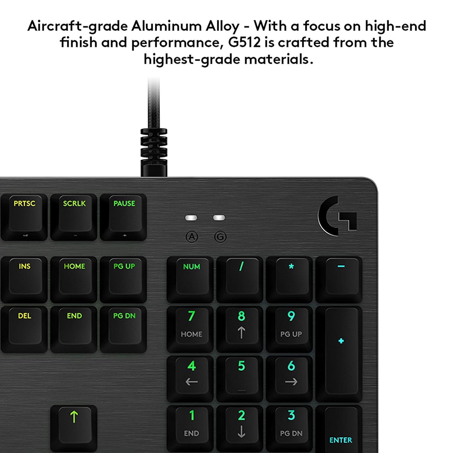| Additional Features | FULL FUNCTION KEYS Media and Lighting Control Media and lighting controls are right at your fingertips. Use the FN key to control volume, play and pause, mute, toggle game mode, change lighting effects, etc. Use the FN toggle feature in Logitech Gaming Software (LGS) and configure your function keys to perform these alt commands by default.,, GX Blue delivers audible and tactile feedback just like the common, traditional switches gamers are used to. They're ideal for those looking for the familiar "clicky" switch., GX BLUE TRADITIONAL CLICK AND FEEL. The GX Blue is an iconic mechanical switch that provides an unmistakable click when pressed., Actuation Distance- 1.9 mm, G512 is crafted from incredibly strong and durable 5052 aluminum-magnesium alloy which allows for both a minimal design and a beautiful aesthetic. The rigidity of 5052 alloy also provides a sturdy, non-slip chassis that houses a full suite of features for an unbeatable gaming experience., For those that prefer a classic experience, the GX Blue gaming switches deliver an iconic actuation you can hear and feel., Total Travel- 4.0 mm, Average Force- 50 gf (GX BLUE), Tactile Force- 60 gf, Lifespan- 70M Keystrokes, GX Blue mechanical switches are up to 40% more durable than the standard mechanical switches. GX Blue switches undergo intense testing and are held to the same high standard to ensure quality and reliability. |