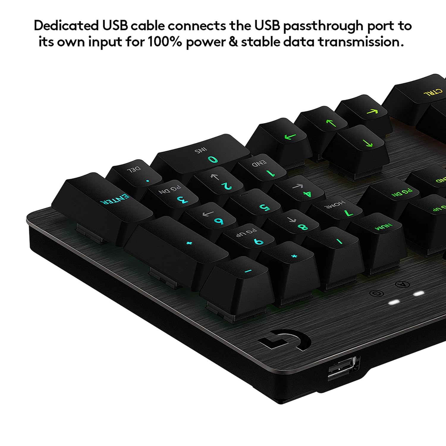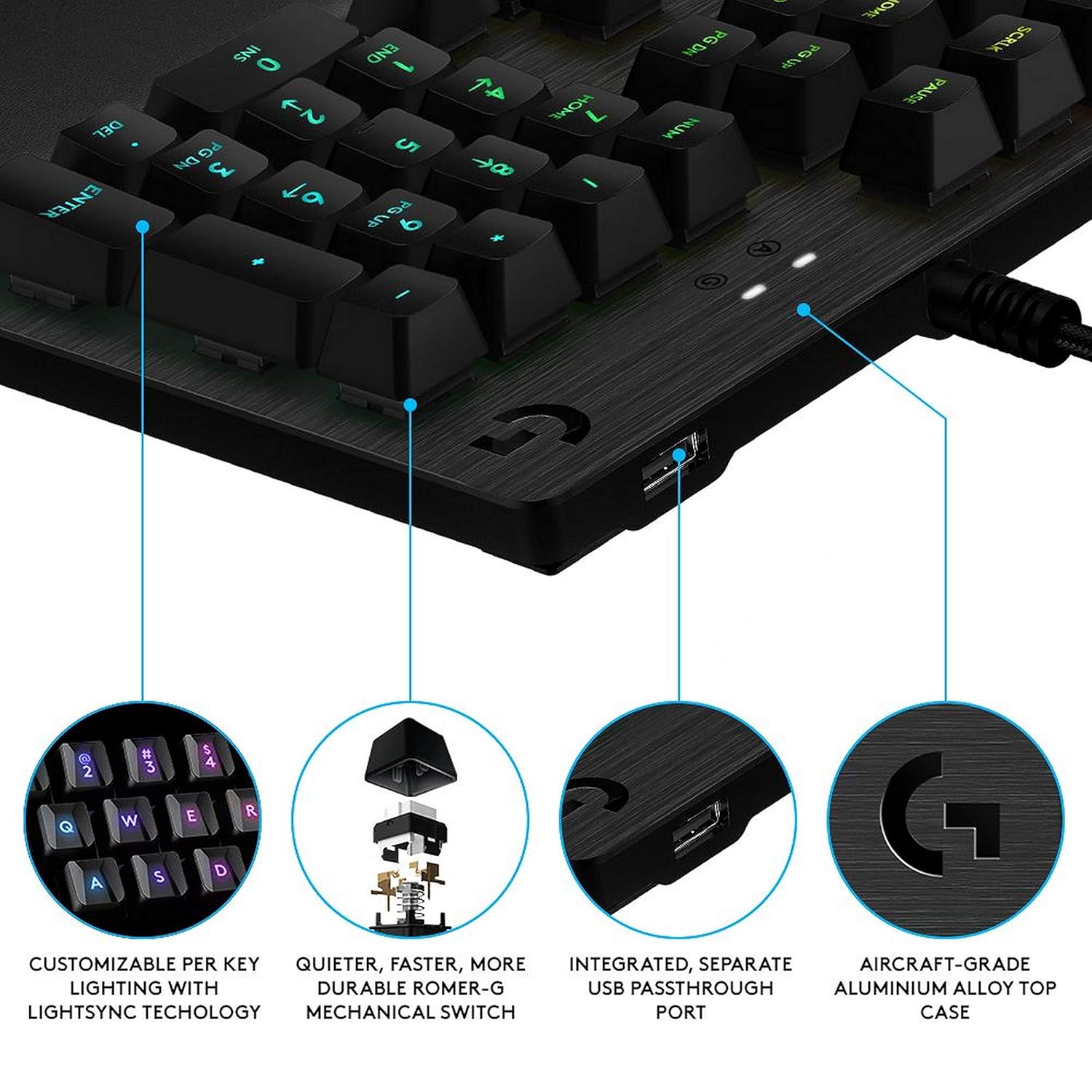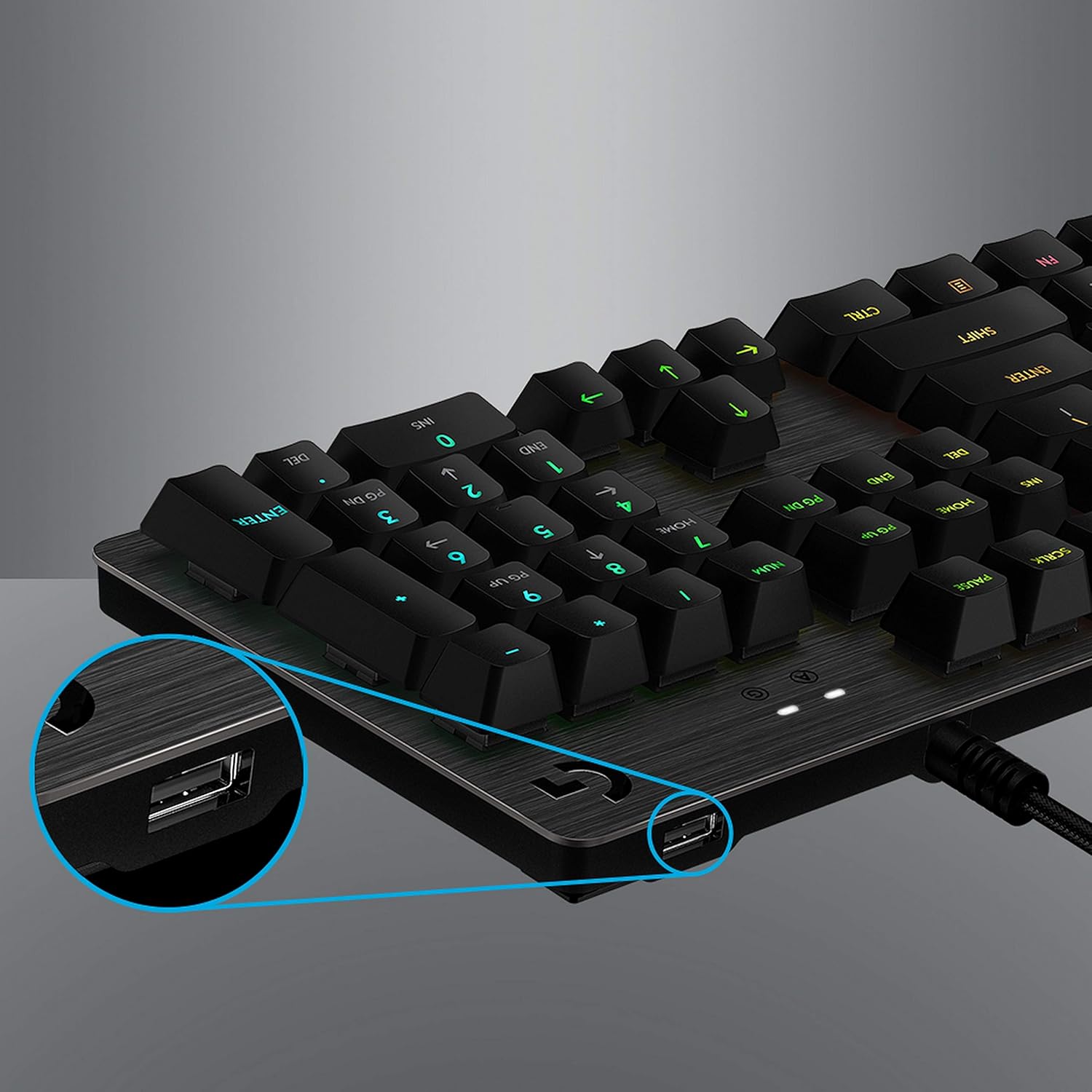 G512 is a high performance gaming keyboard, delivering 1 Ms report rate and featuring choice of GX Blue mechanical switch. Full-spectrum RGB combined with LIGHTSYNC technology, G512 is full-spectrum -16.8M RGB with customizable per key lighting, GX Blue is an iconic design providing both tactile and click feedback with snappy actuation All switches are tested and rated for a 70 million click lifespan to be reliable and durable., G512 is crafted from incredibly strong and durable 5052 aluminum.The rigidity of 5052 alloy also provides a sturdy, non-slip chassis that houses a full suite of features for an unbeatable gaming experience., USB PASSTHROUGH For Charging and Data, Media and lighting controls are right at your fingertips. Use the FN key to control volume, play and pause, mute, toggle game mode, change lighting effects, etc. Use the FN toggle feature in Logitech Gaming Software (LGS) Toggle game mode with FN+F8. Deactivate additional keys using LGS., Press multiple keys simultaneously in any order and get exactly what you intended with 26-key rollover 9) Use Logitech Gaming Software to program custom functions and macro commands on F1-F12 buttons. Make your gaming life easier. |