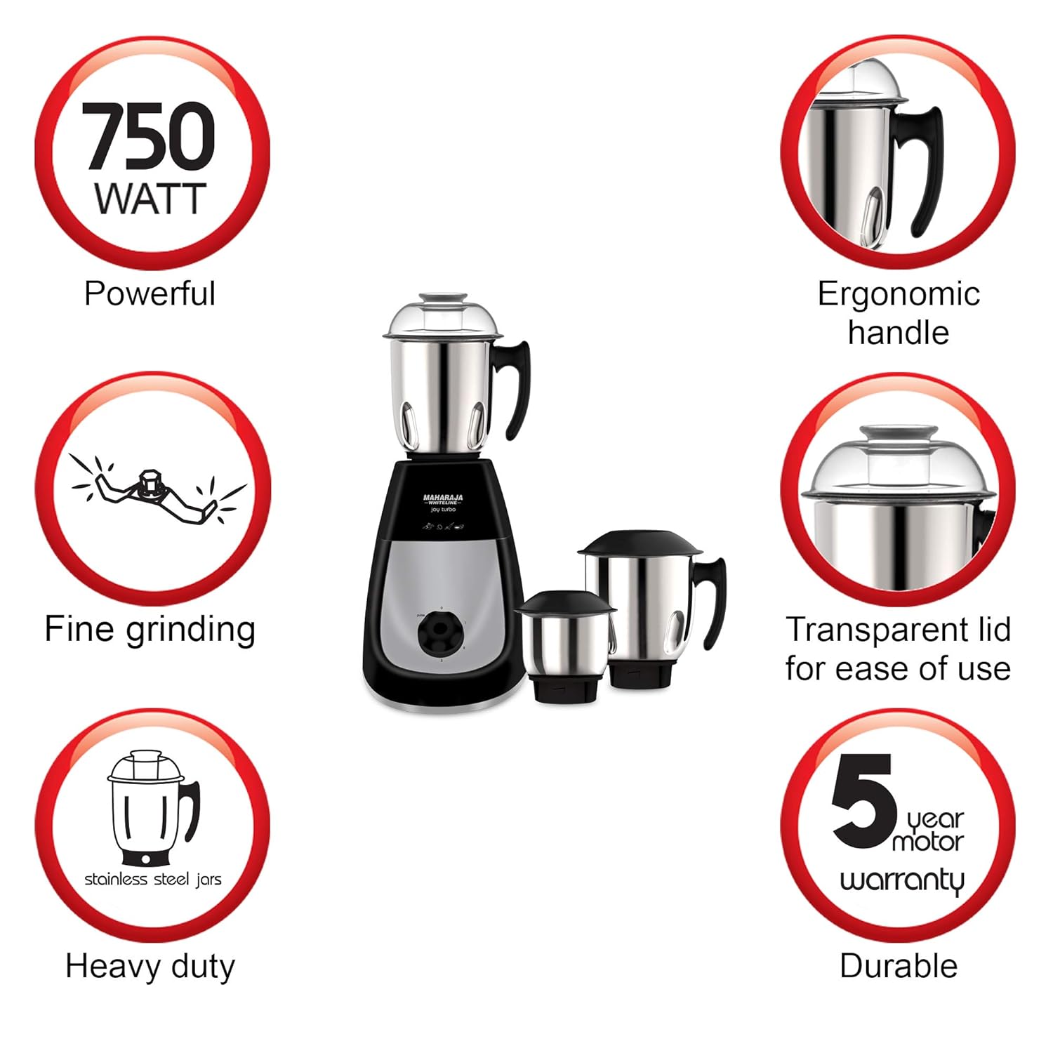 Maharaja Whiteline Joy Turbo 750-Watt Mixer Grinder with 3 Jars (Black/Silver)